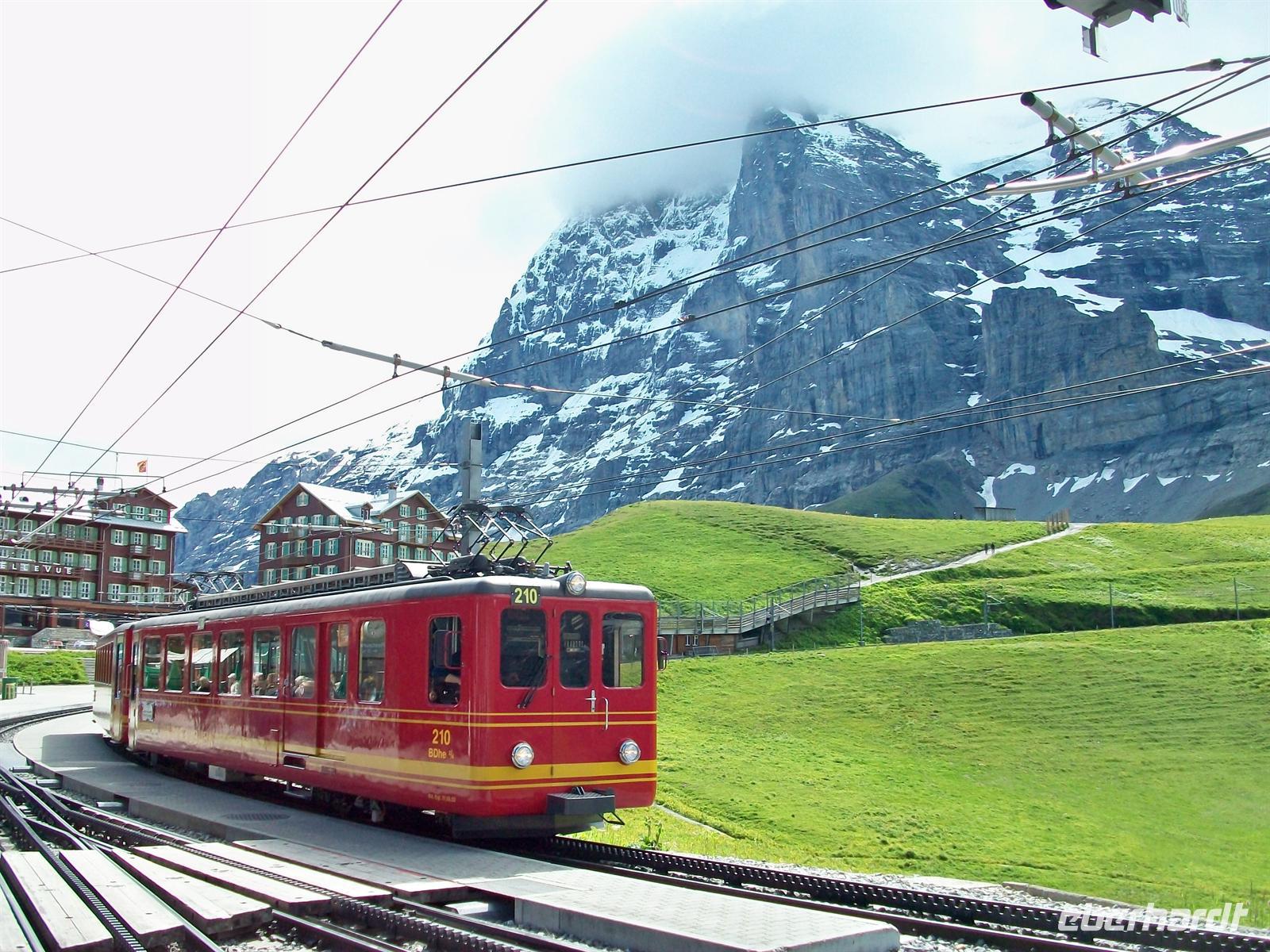 Die Sonne lacht heute Morgen von einem blauen Himmel herab den nur wenige Wolken zieren. Das richtige Wetter zu unserem Ausflug hoch hinauf in die Berge. Unsere Gruppe ist auf dem Weg zum Bahnhof und bald haben wir in dem für uns reservierten Wagen Platz genommen. Durch das enge Tal der Lütschine führt uns der romantische Weg hinauf nach Grindelwald. Ein sehr bekannter Ferienort, von dem schroff und steil die berüchtigte Eigernordwand aufsteigt. An diesem Hang haben viele Bergsteiger ihr Leben gelassen, so mancher Mythos ist damit verbunden. Hier steigen wir nun um in den Zug der uns hinauf zur kleinen Scheidegg bringen wird. Wir kommen