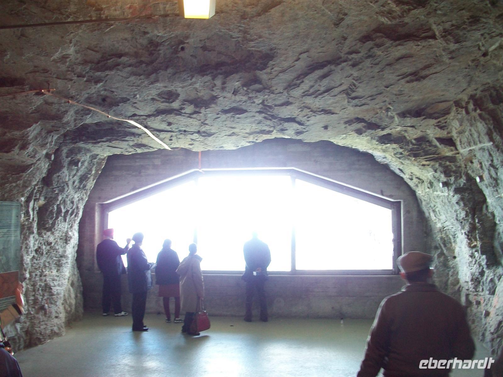 Mehrere kleine Stopps unterwegs lohnen den Ausstieg, denn überall sind im Felsen Galerien angelegt die einen Blick nach draußen über die unendlichen Schneemassen gestatten.
