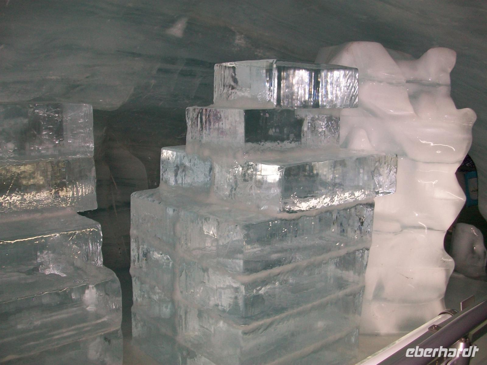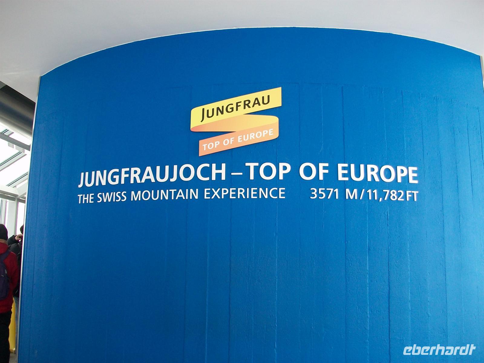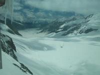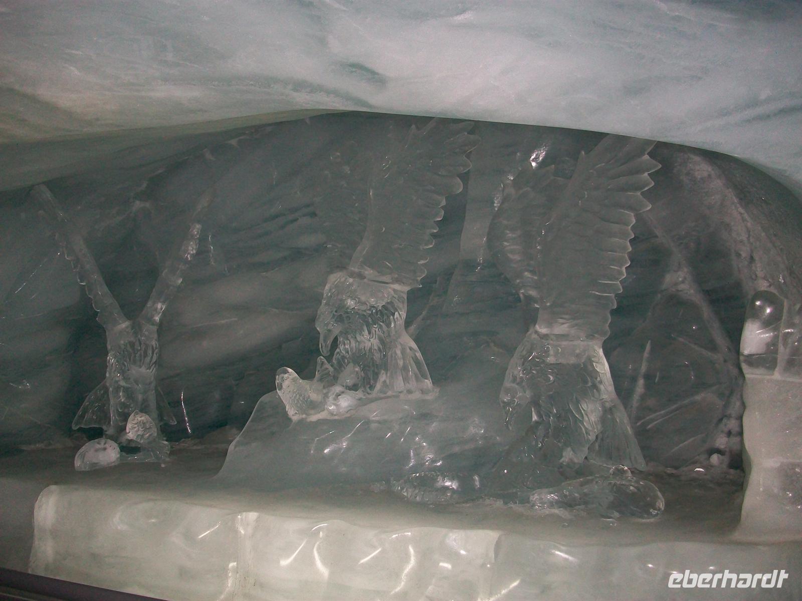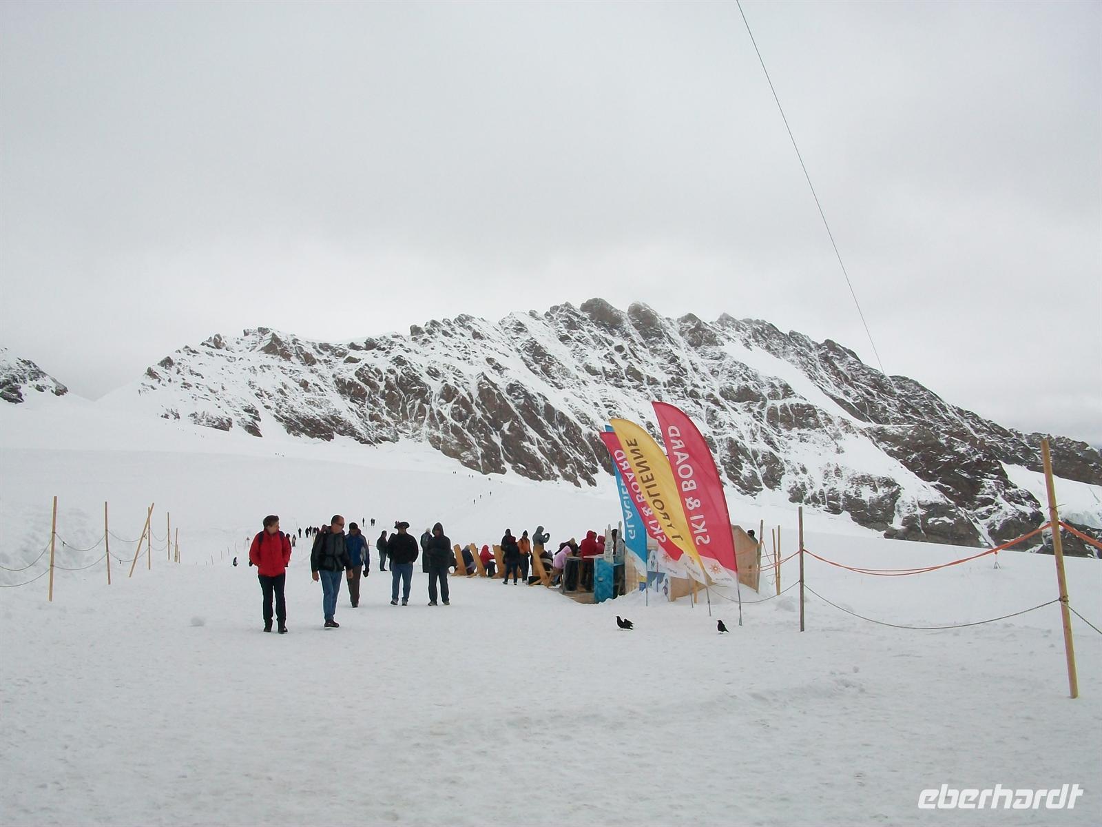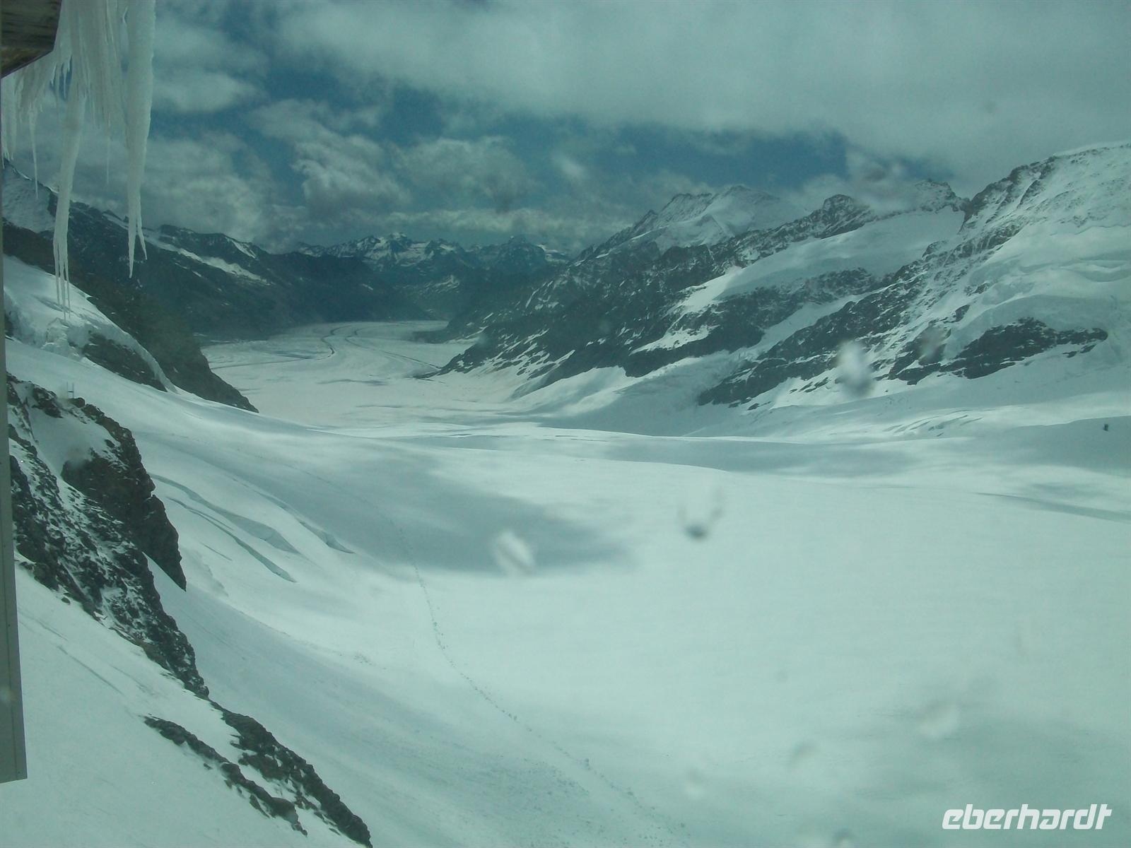 Kurz vor zwölf erreichen wir die Endstation wo nun jeder individuell eine phantastische Welt erkunden kann. Die Schweizer haben hier am Jungfraujoch eine unterirdische Stadt angelegt. Es gibt Restaurants, ein Kino, einen Eispavillon mit zahlreichen Skulpturen aus Eis geformt, viele Ausgänge aufs ewige Eis, kurzum gewaltige Impressionen durch die Natur gebildet und von Menschenhand geformt. All das ist kaum zu beschreiben, allerdings sollte man sich hier oben nur langsam bewegen, die Luft ist sehr dünn und man ist schnell außer Atem.