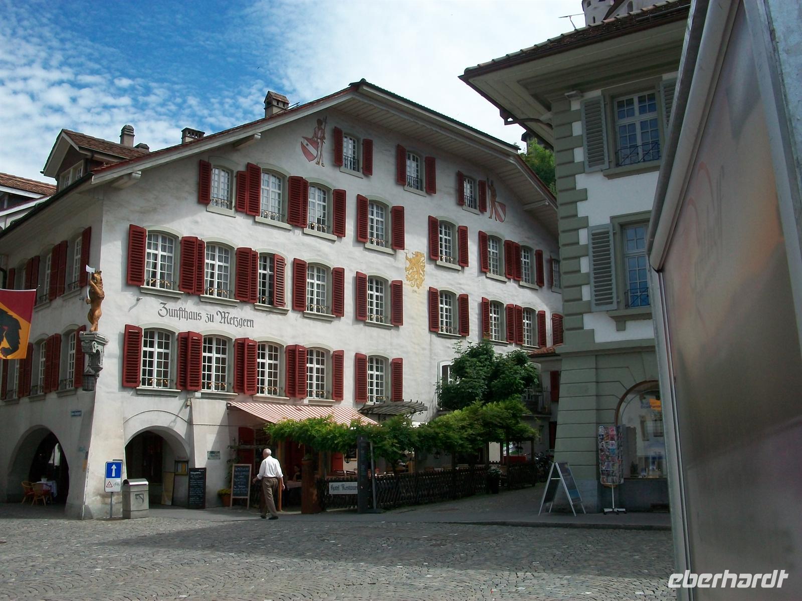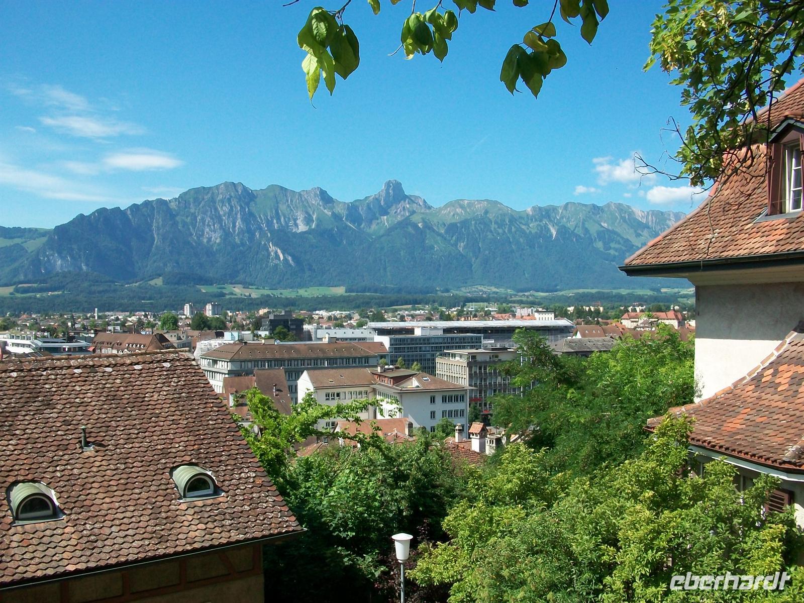 Am Bahnhof treffen wir unsere Stadtführerin und sie nimmt uns mit, um auf den Spuren vergangener Zeiten zu wandeln. Am Fluss Aare entlang, der seine grünen Fluten der Hauptstadt Bern zusendet, wandeln wir durch die Altstadt, besuchen den Hügel mit der Burg und statten auch der schönen Kirche einen Besuch ab. Vom Burgberg genießen wir einen Blick weit ins Land hinein, von Ferne senden uns die Eismassen vom Jungfraumassiv einen Gruß zu, an diesem warmen