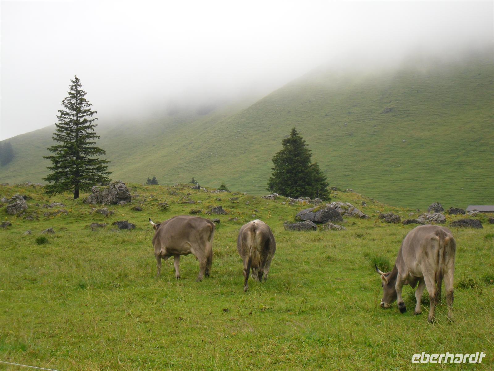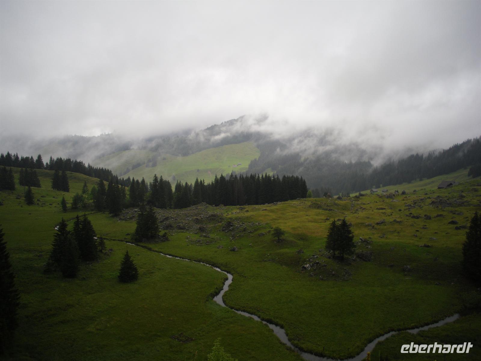 Zwischen schmucken bemalten Holzhäusern mit geschwungenen Giebeln stehen Steinbauten aus dem 16. Jahrhundert. Leider hat es das Wetter hier nicht unbedingt gut mit uns gemeint, aber wir machen einfach das beste daraus... Wir besuchen daher nach einem kurzen Stadtspaziergang die Appenzeller Alpenbitter AG. Der Appenzeller ist der Hauptprodukt der Appenzeller Alpenbitter AG. Er geniesst nicht nur in Appenzell, sondern in der ganzen Schweiz einen fast 100%igen Bekanntheitsgrad, der auf zwei Gründe zurückzuführen ist, die gleichzeitig auch die Philosophie dieses Familienbetriebs widerspiegeln - höchstmögliche Qualität und die ausschliessliche Verwendung von natürlichen Rohstoffen. Natürlich dürfen wir den Appenzeller Kräuterlikör, das Aushängeschild des Unternehmens, auch verkosten und gut gelaunt unternehmen einige unserer Gruppe dann am Nachmittag - trotz der immer noch schlechten Witterung - eine Wanderung auf der Schwägalp. Unser einheimischer Wanderführer Albert dachte zuerst, niemand würde bei diesem Wetter mit laufen - aber da kannte er unsere Gruppe noch nicht!