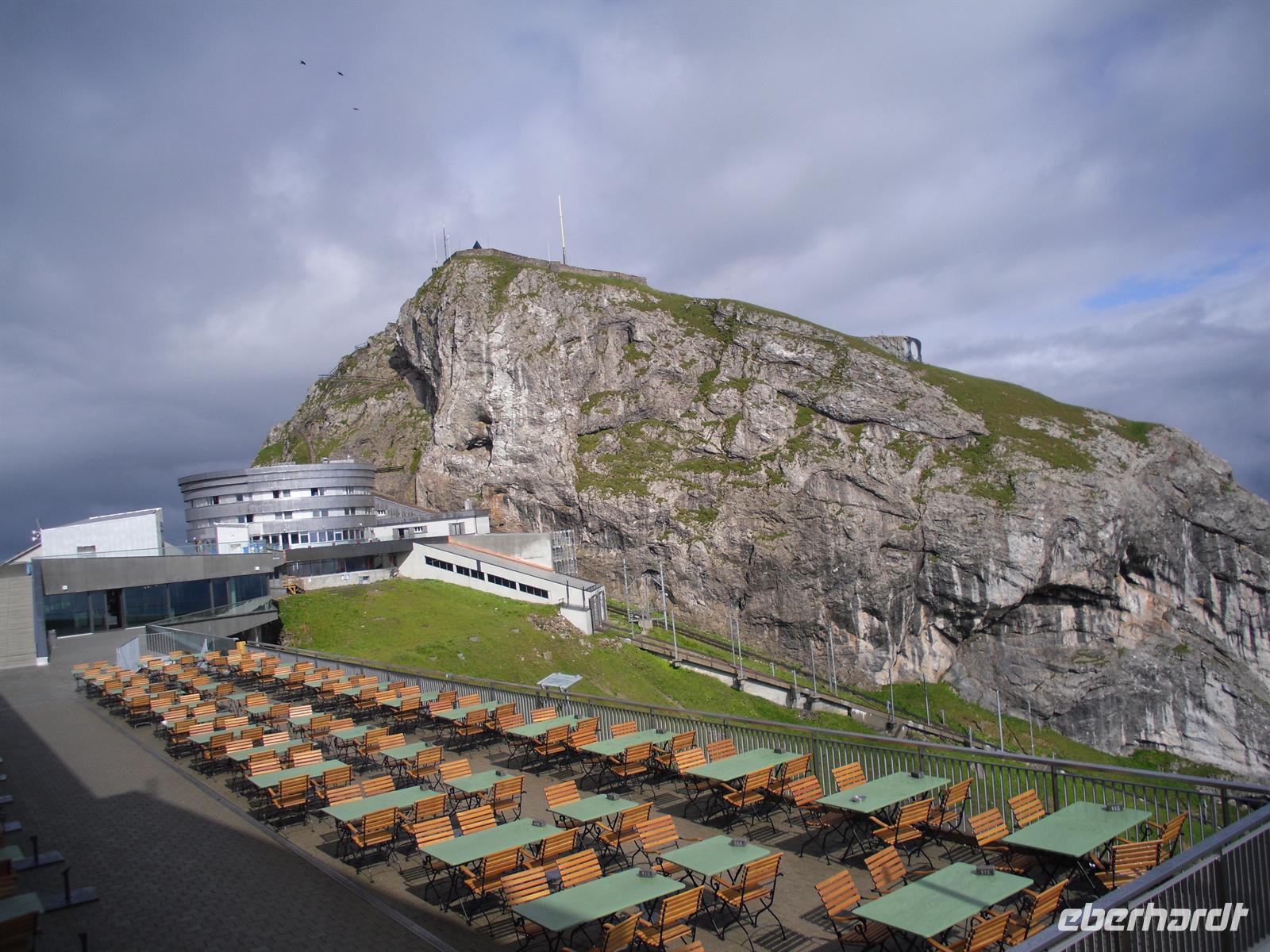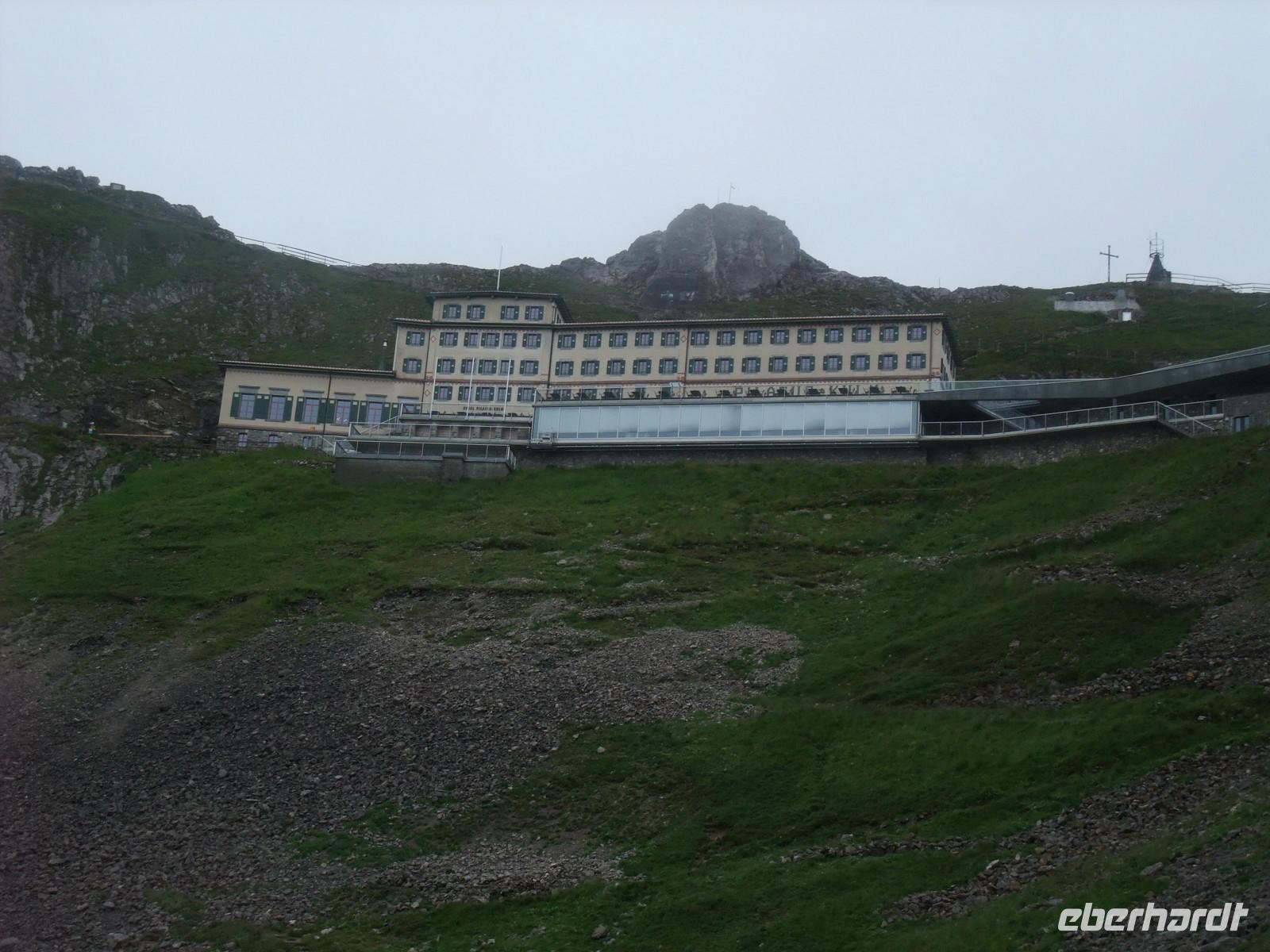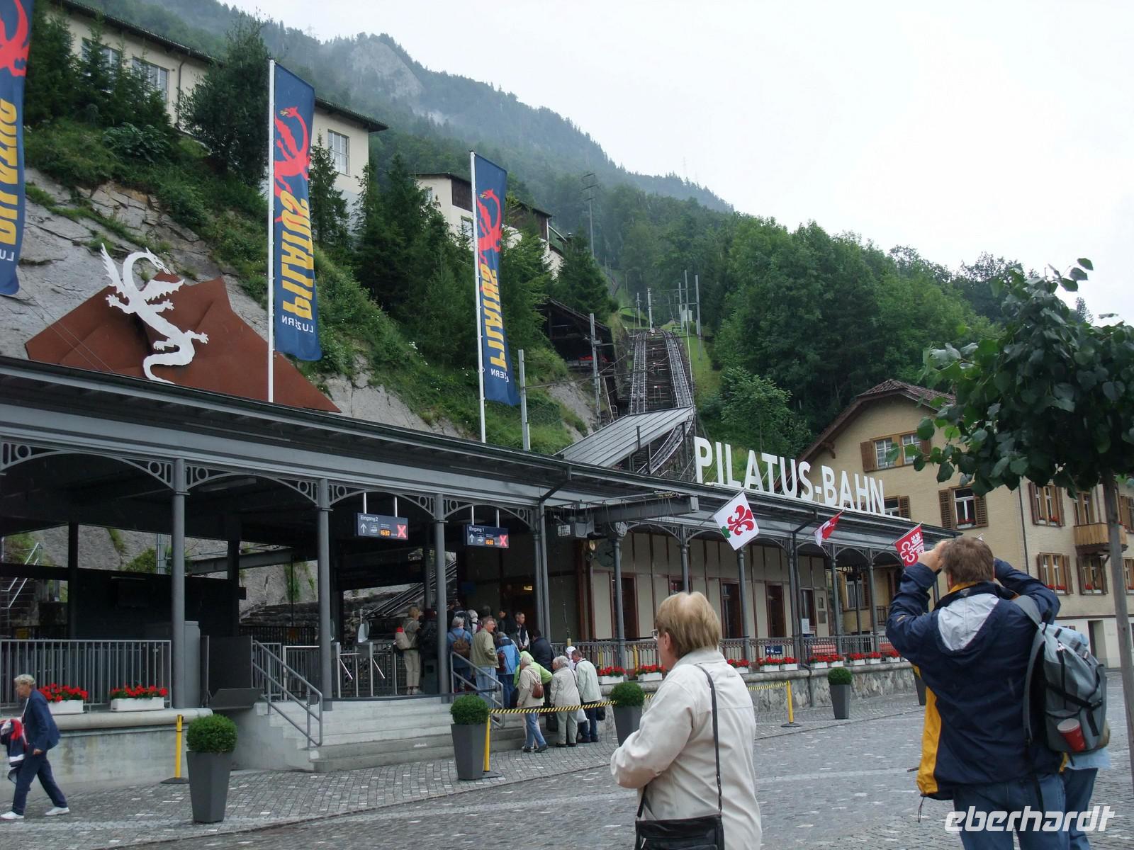 Alpnachstad. Von Alpnachstad aus fahren wir dann mit der steilsten Zahnradbahn der Welt (maximal 48 Prozent) in nur etwa 30 Minuten hinauf zum 2.132 Meter hohen Pilatus-Kulm. Dort oben verbringen wir dann eine Nacht im gemütlichen Hotel Bellevue. Der Pilatus hat seinen Namen wahrscheinlich von "Pileatus", der Bedeckte (mit Wolken), und wurde bis zum 17. Jahrhundert "Fräkmünt" genannt. Sein Name wird auch der Legende zugeschrieben, nach der der Leichnam des Pontius Pilatus in dem ehemaligen See auf der oberen Bründlenalp versenkt sei. Am späten Nachmittag erreichen wir den Pilatus Kulm und beziehen erst einmal unsere Zimmer im Hotel Bellevue. Wir genießen anschließend die herrliche Bergwelt hier oben! Danach erwartet uns dann ein Abendessen im Kulm-Hotel auf über 2.130 Metern Höhe. Wir lassen uns nun in luftiger Höhe rundum verwöhnen!