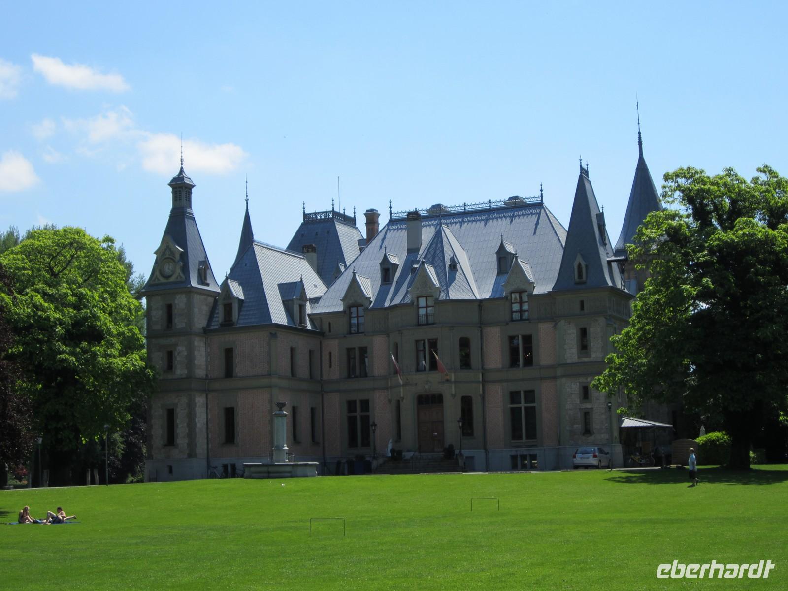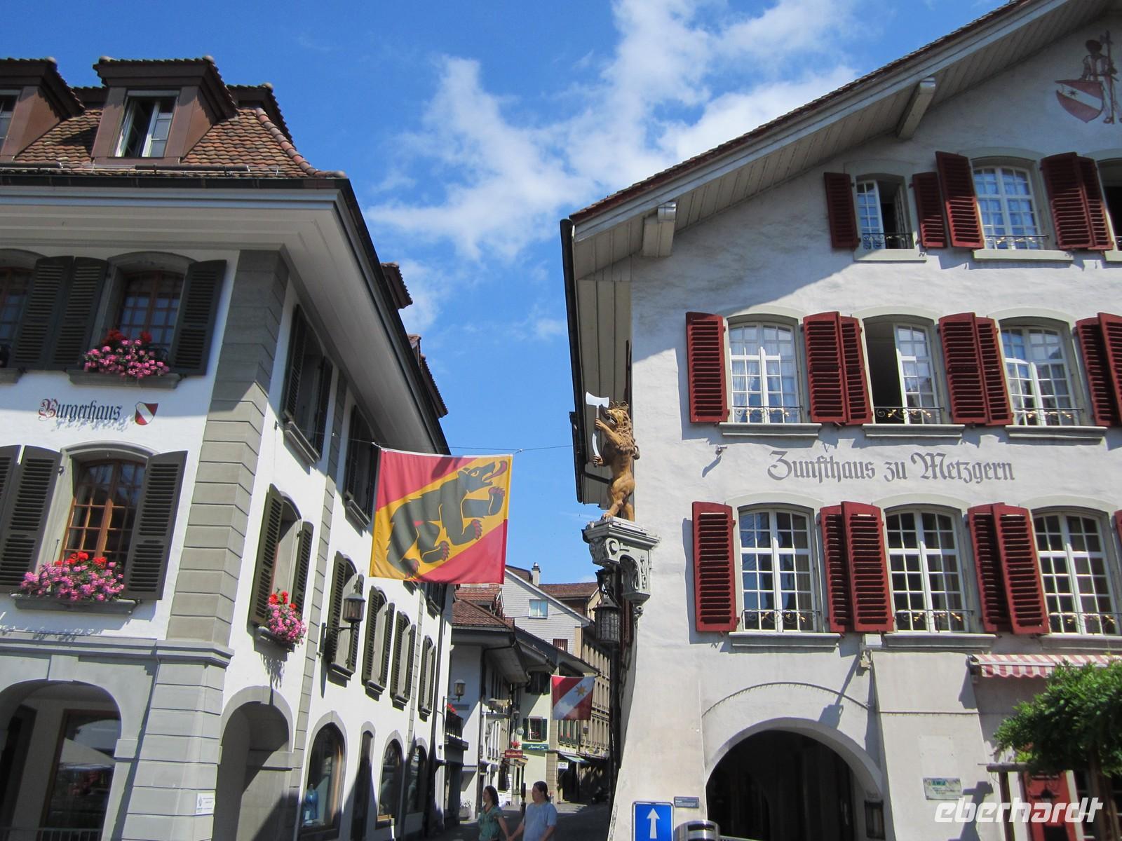 Für die Stadtführung haben wir 2 Stadtführer. Es ist angenehm in kleinen Gruppen geführt zu werden. Thun wird auch das Tor zum Berner Oberland genannt und zeigt sich uns mit junger, lebhafter Atmosphäre. Unser Rundgang führt uns vom Bahnhof zur Insel in der Are, weiter zum Schloss und später zum Rathausplatz. Dann endet die Führung. Einige von uns wollen noch einiges von der Stadt sehen und laufen zum Schloss Schadau. Der Fußweg ist es wert. Man sieht nicht nur das zwischen französicher Renaissance und Tudor-Gotik stilisiertes Schloss sondern auch einen sehr schön angelegten Park.