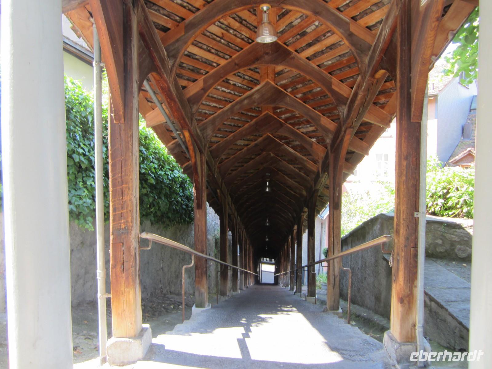 Gebäuden, z. B. in der St, Laurenzen Kirche, dem Stadthaus, Kathedrale und Stiftsbibliothek ebenso im Lapidarium (Sammlung wertvoller Bausteine). Einen besonderen Stellenwert haben dabei die Benediktinerabtei und die Stiftsbibliothek. Die Bibliothek befindet sich in einem wunderbaren Barocksaal mit Stuckarbeiten und wertvollen Deckengemälden. Frau Brülisauer erläutert wertvolle Schätze der Bibliothek u.a. den auf der Insel Reichenau gefertigten karolingische Klosterplan.