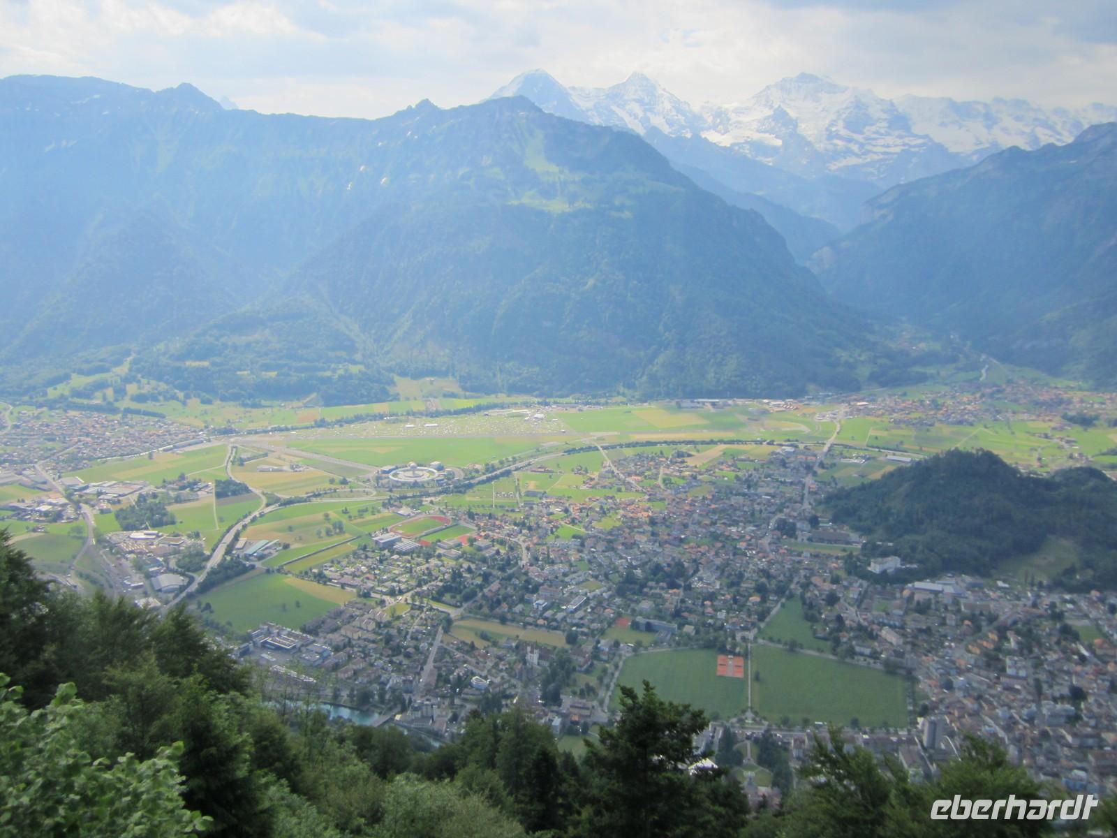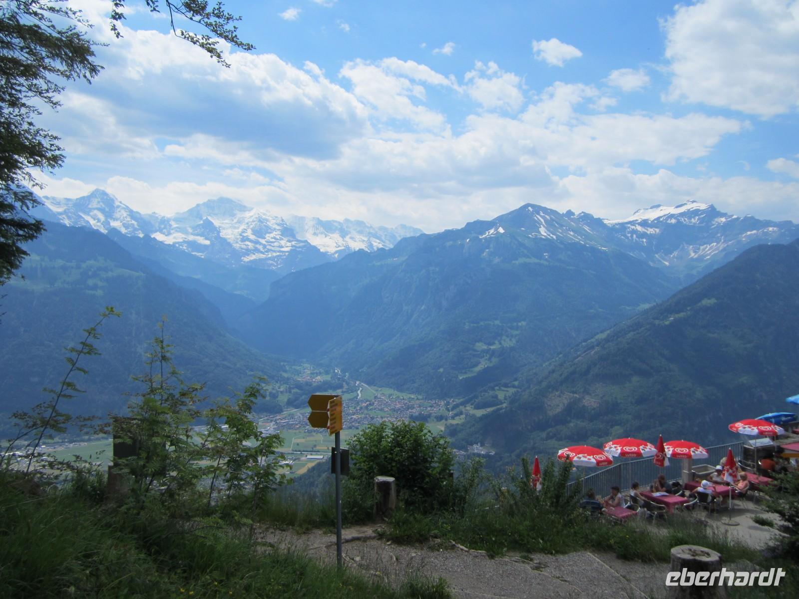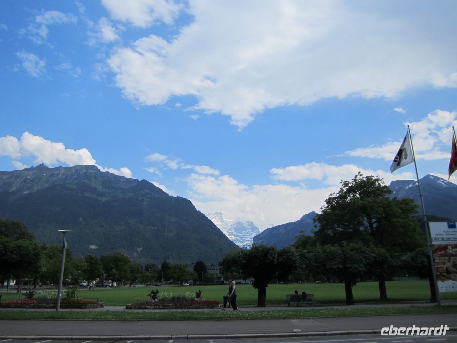 Gegen 14.00 Uhr beginnen wir unsere Rückfahrt. Für eine Schifffahrt auf dem Thuner See konnte sich keiner so richtig begeistern und deshalb entscheiden wir uns das Nordufer des Thuner Sees zu fahren. Das Ufer verfügt über ein ungewöhnlich mildes Klima und wird auch die Riviera des Berner Oberlandes genannt. Bei herrlichem Wetter sehen wir nicht nur den Niesen sondern die herrliche Kulisse der Berner Alpen. In Richtung Interlaken auch die Jungfrau, Mönch und Eiger. In Interlaken wieder angekommen bleibt noch ausreichend Zeit die Stadt zu erkunden. Dabei wird auch mein Geheimtipp getestet. Das Cafe im 18. Stock des