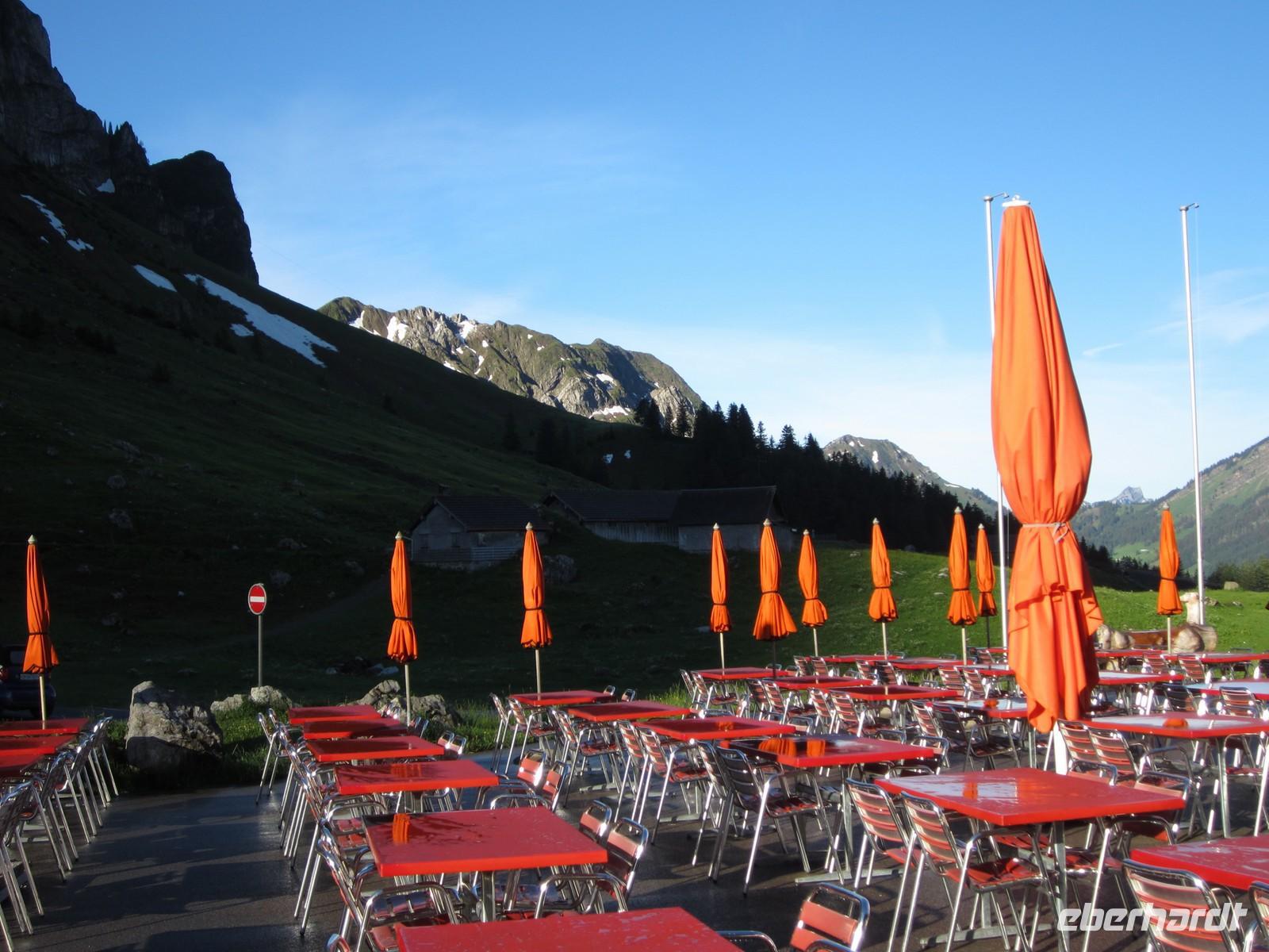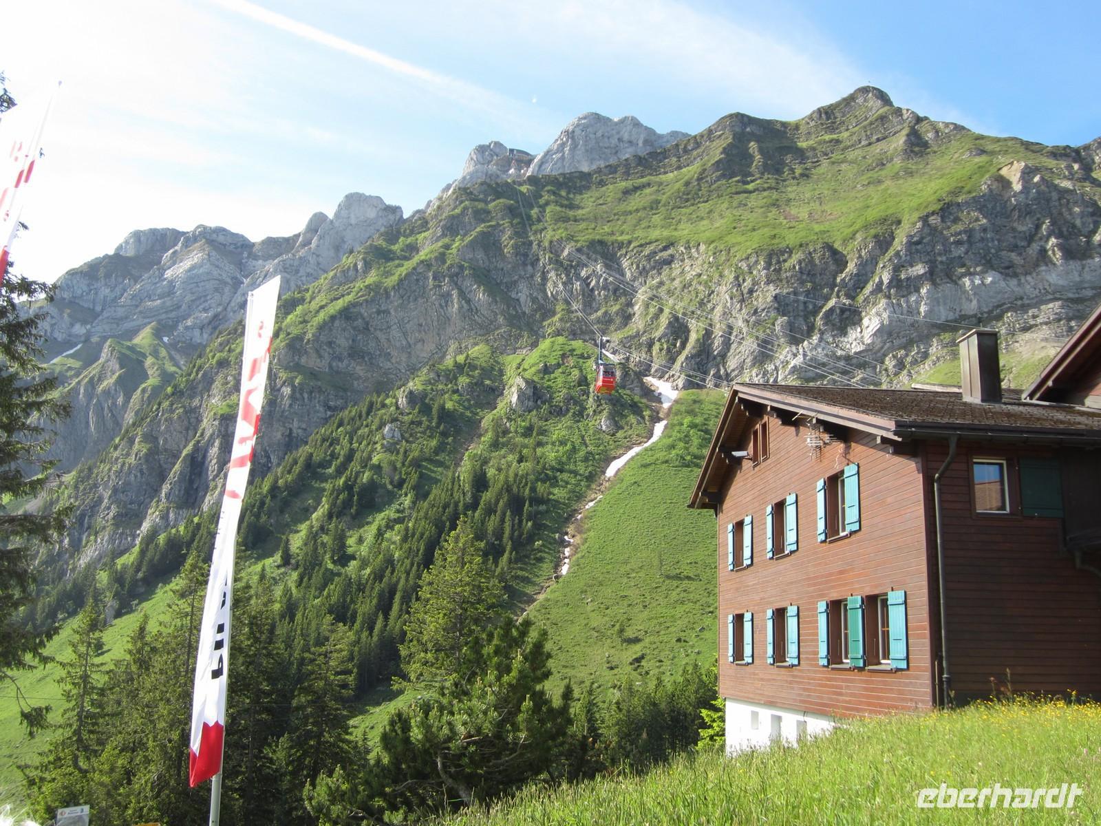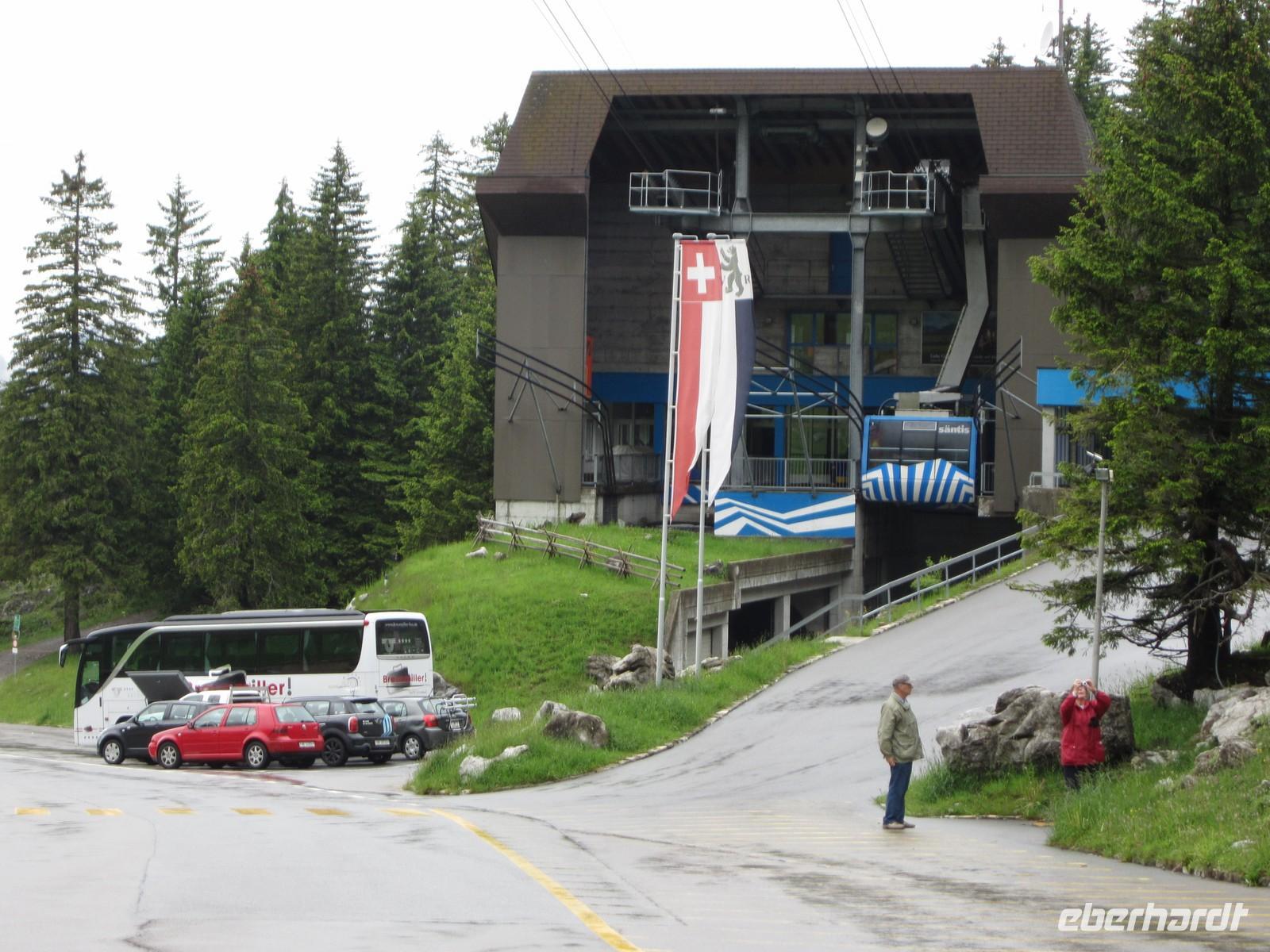 Erwartungsvoll schauen wir am frühen Morgen zum Berg. Wir wollen auf dem Säntis frühstücken. 07.30 Uhr fährt die erste Bahn und wir wollen mit. So zeitig wird es nichts.