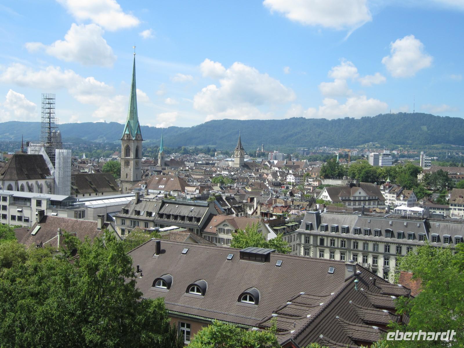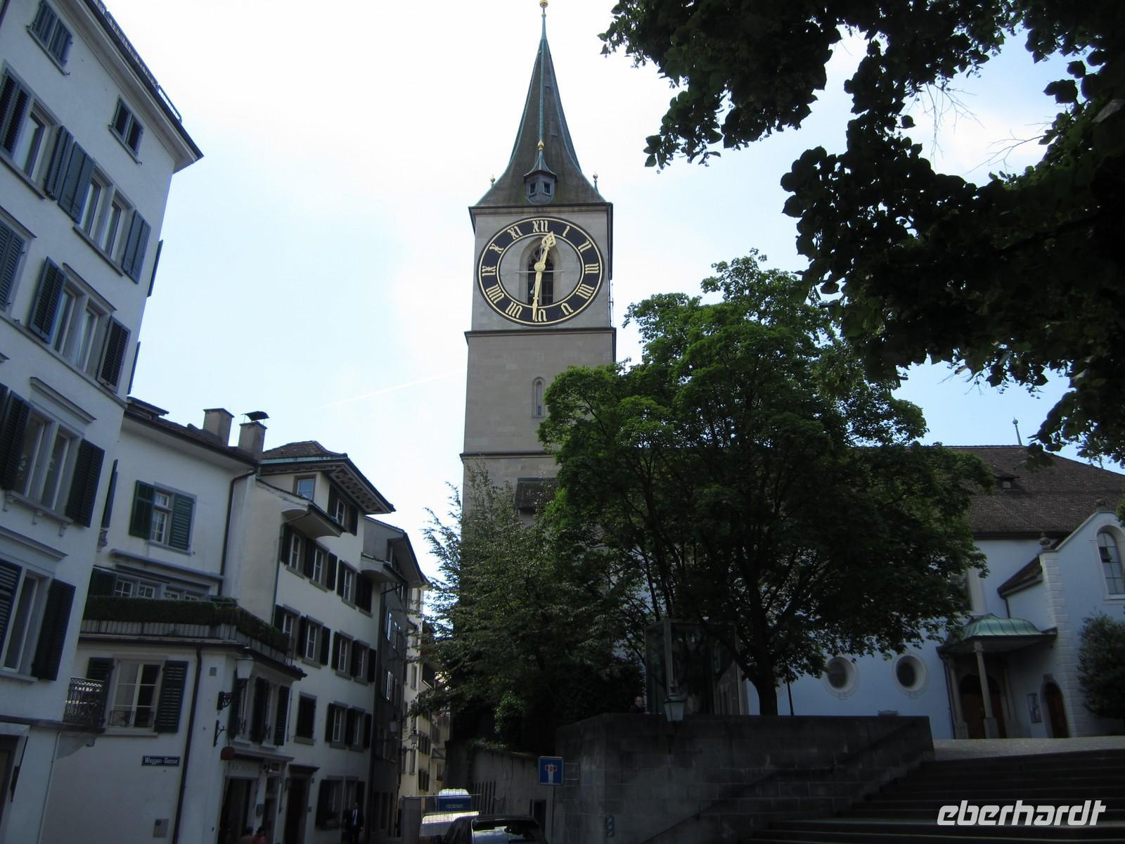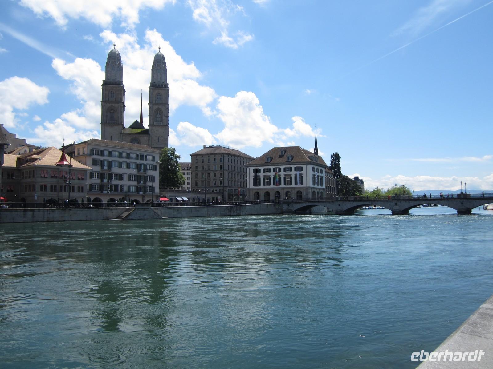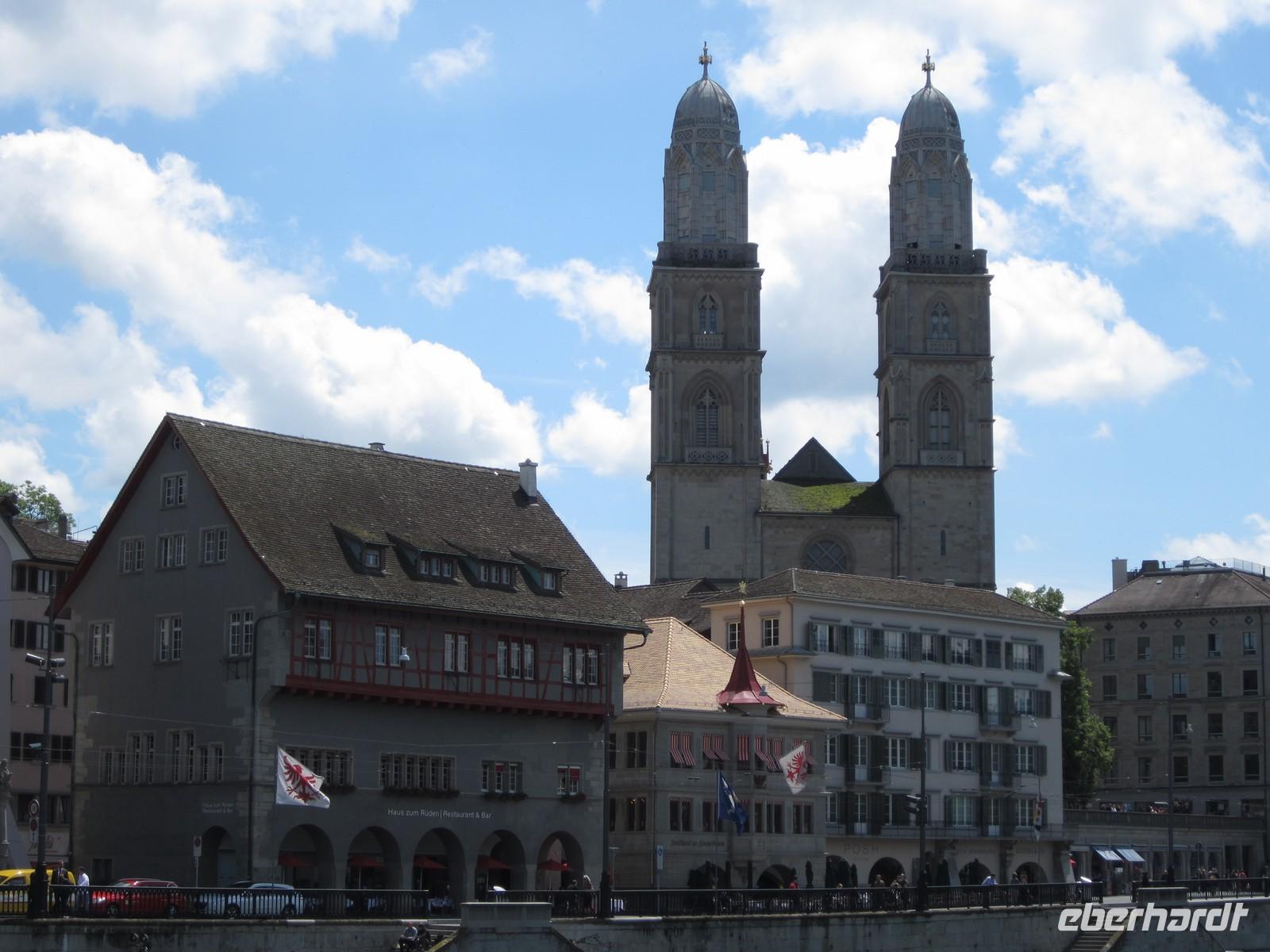 Nach der Busfahrt durch die Stadt steigen wir am Münsterhof aus und gehen durch die Altstadt zu Fuß. Von der Kirche St. Peter (älteste Züricher Pfarrkirche und dem größten Zifferblatt Europas mit 7,8 m Durchmesser), zum Weinplatz vorbei an bedeutenden Zunfthäusern zurück zum Münsterhof mit dem Fraumünster und das Großmünster über der Limmat.