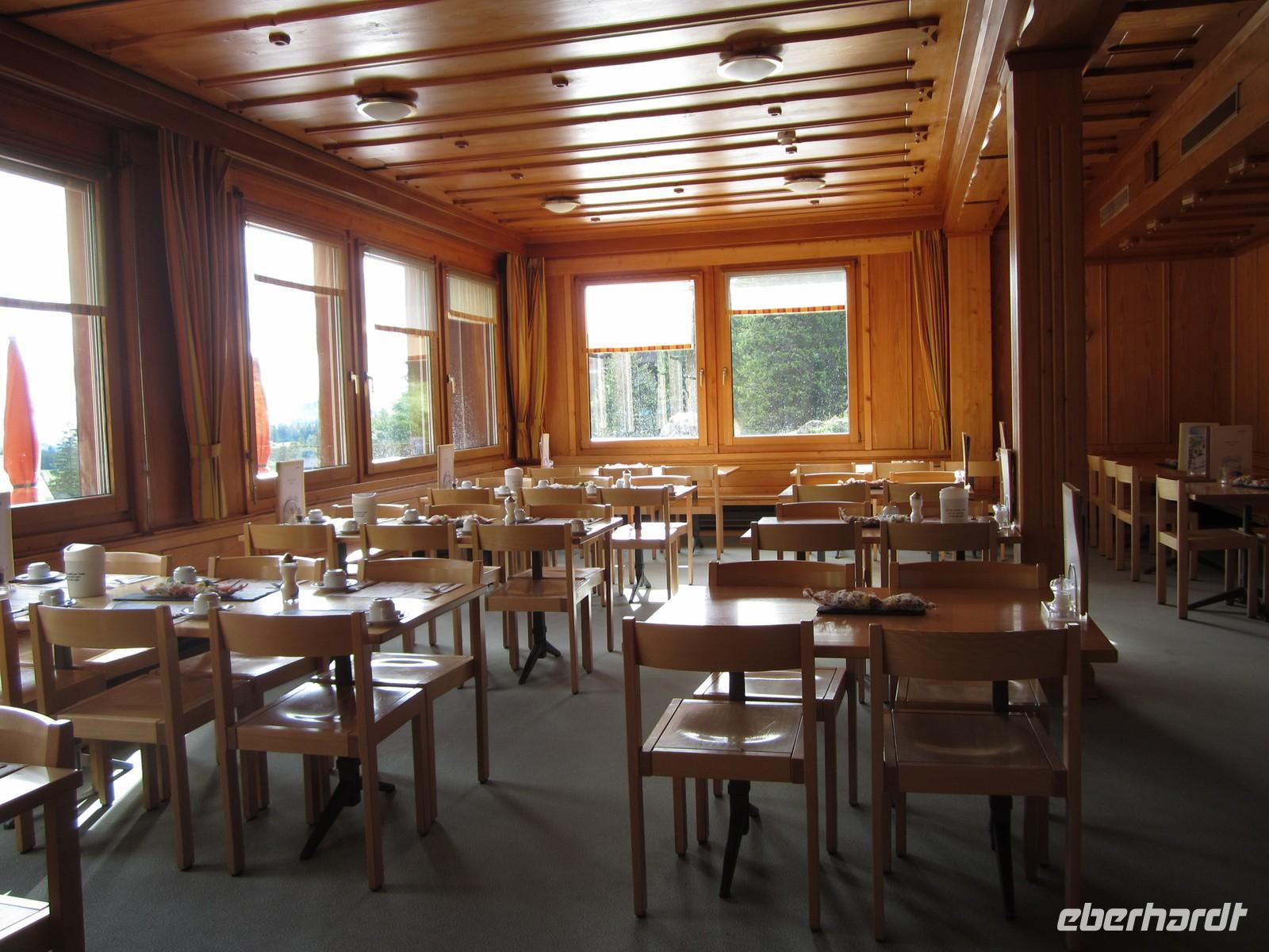Im Panoramarestaurant im 3. Stock ist für uns reserviert. Nur sehen wir kein Panorama. Die Fenster sind von Schnee bedeckt und wir erleben weiteren Flockenwirbel. Der Blick nach draußen ist sehenswert. Es wird Schnee geschoben und die Geländer sind vereist. Wir nehmen es leicht und lassen uns das leckere Frühstück mit gutem Urnäscher und Appenzeller Käse, Rösti und vielem mehr, schmecken.