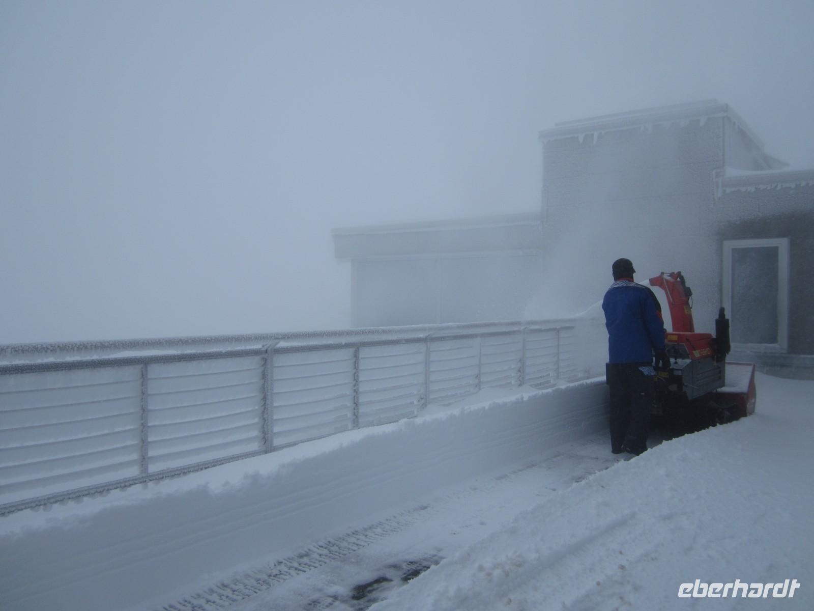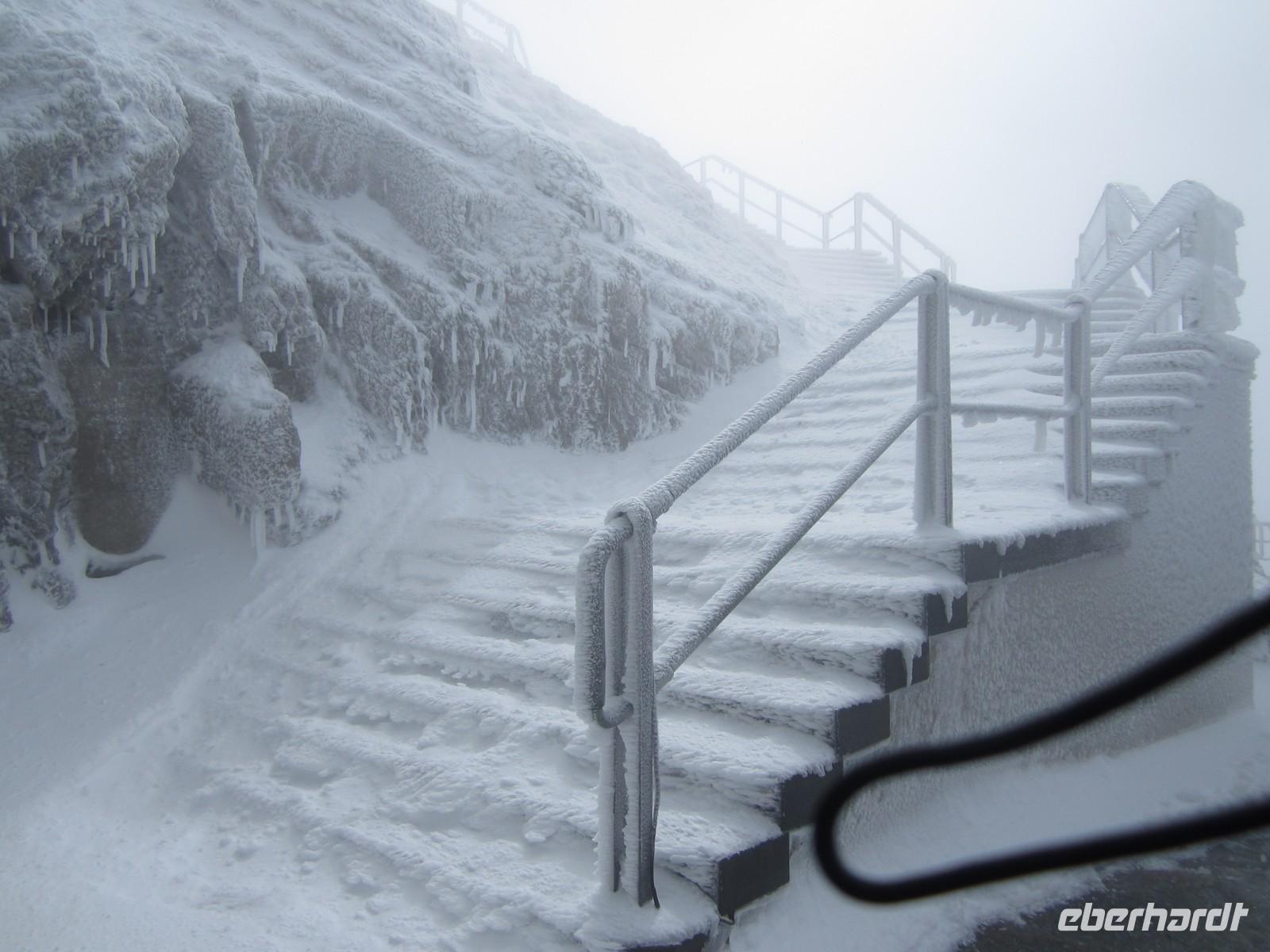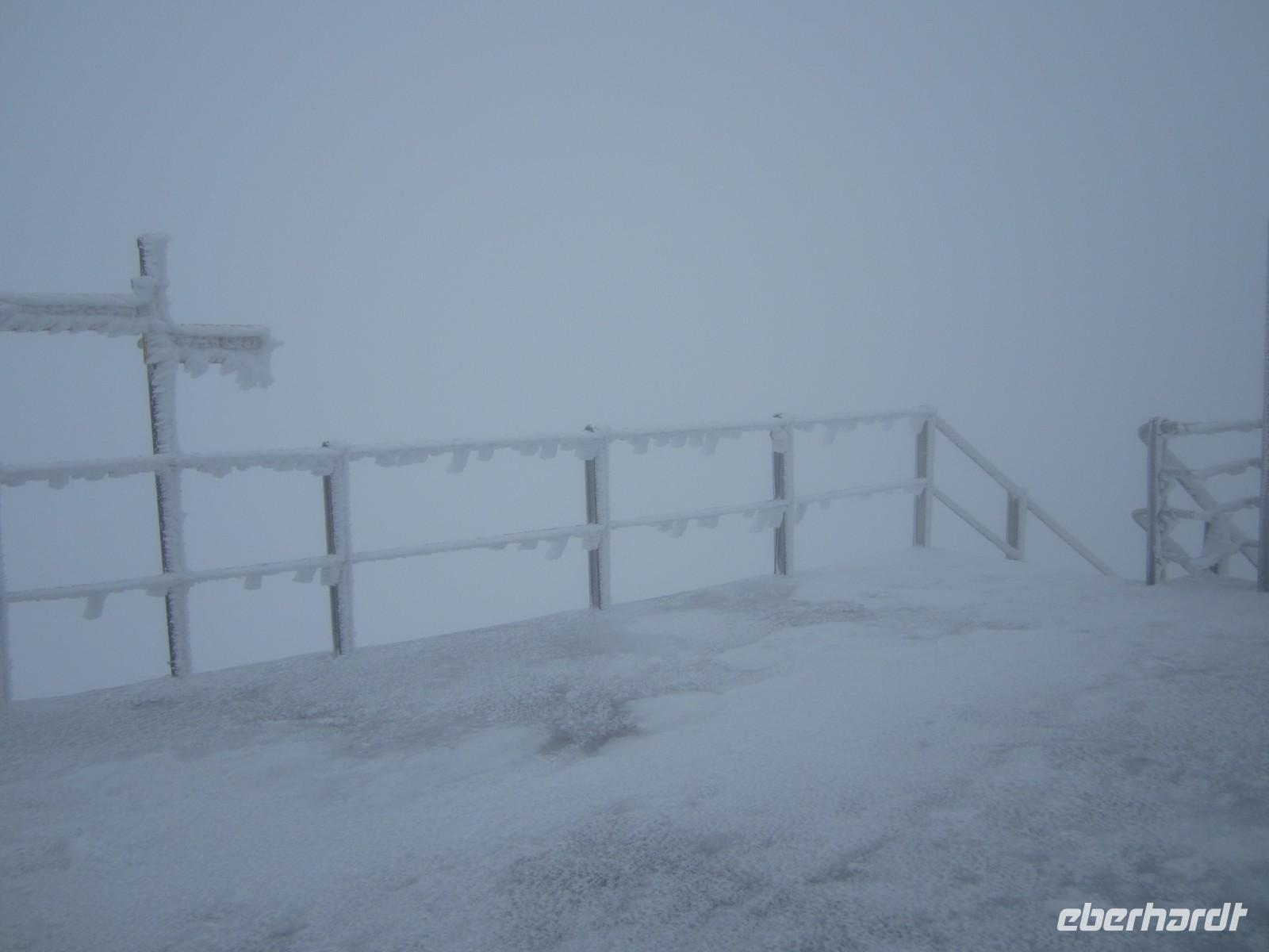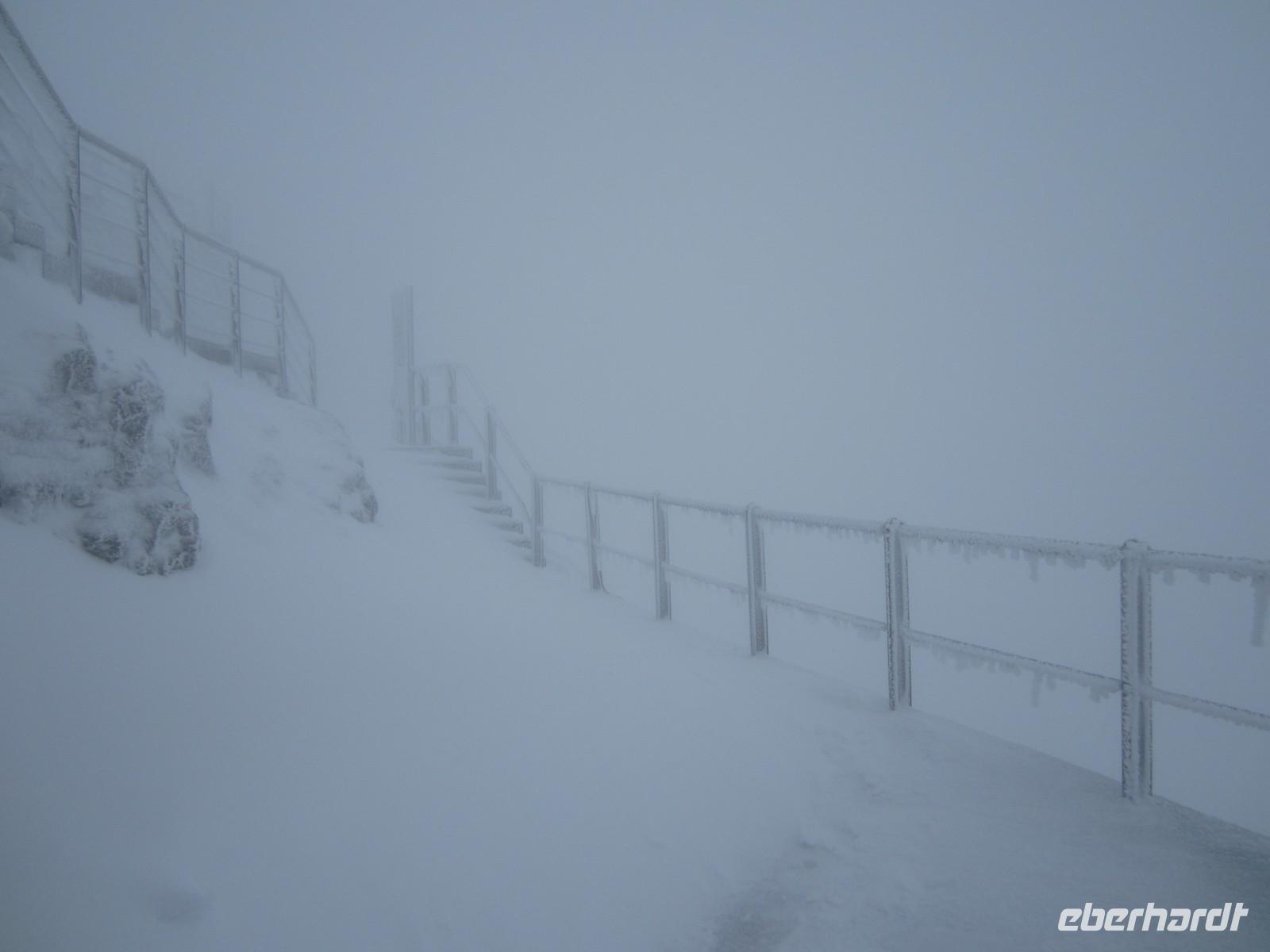 Es gab 12 cm Neuschnee auf dem Säntis. Die Auffahrt 7.30 Uhr ist aufgrund vereister Seile nicht möglich. 08.00 Uhr starten wir dann doch und fahren in frostige Höhen.
