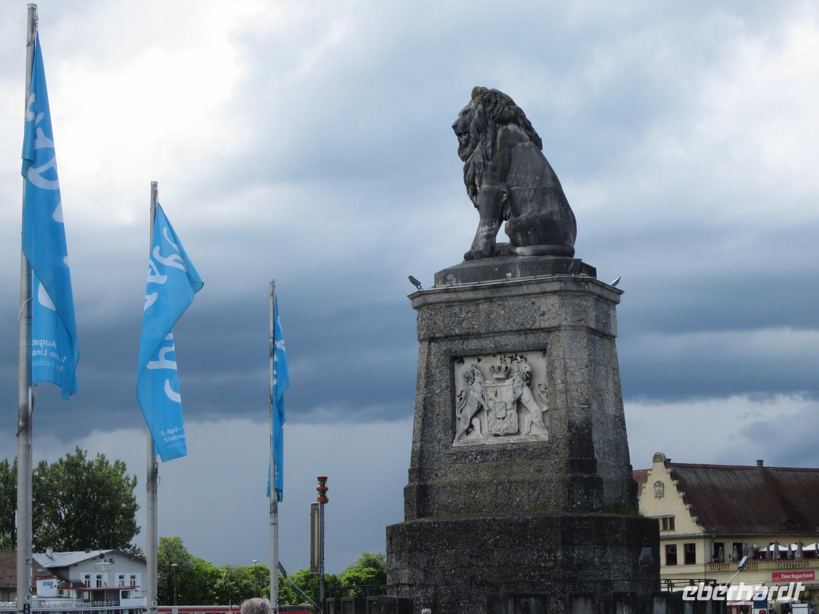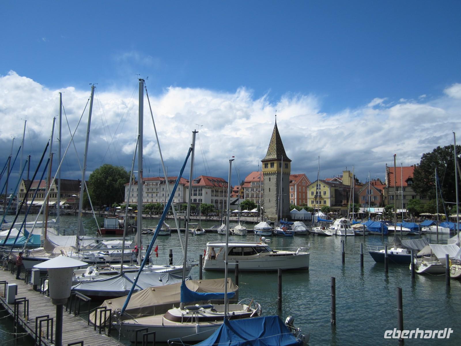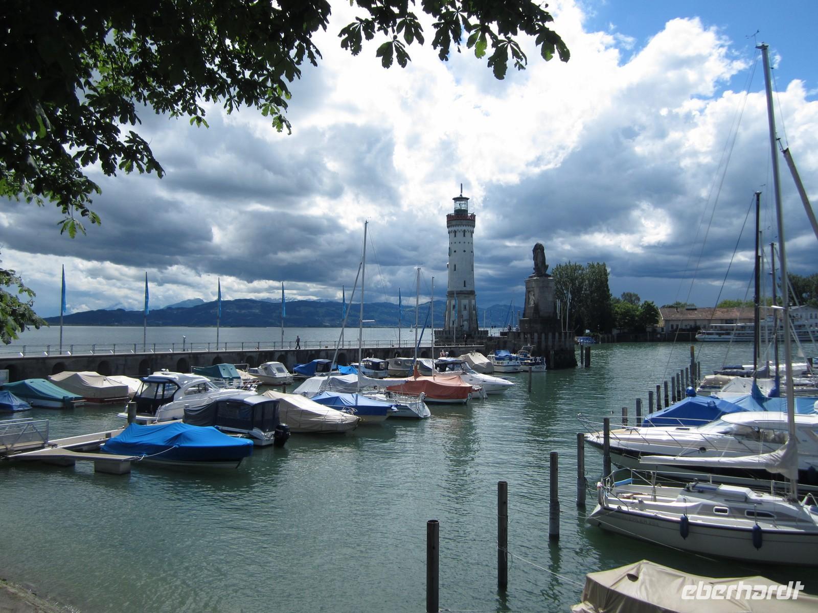 Stopp auf der Insel Lindau einlegen. Die Gruppe läuft gemeinsam zum Hafen von Lindau. Der bayrische Löwe und der Leuchtturm sind ein typisches Zeichen für die Insel und die ersten Fotos werden geschossen. Nach einem kurzen Regenguss fahren wir weiter. Am Bahnhof wartet Volker auf uns und wir fahren mit einem Blick auf die Seebühne durch Bregenz. Österreich verlassen wir an der Grenzstelle Höchst / St.Margareten ist schon die Schweizer Seite.
