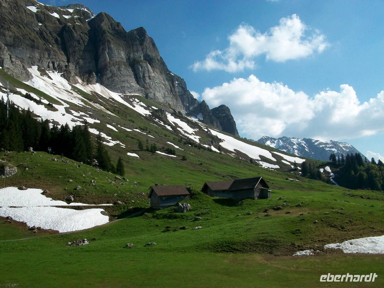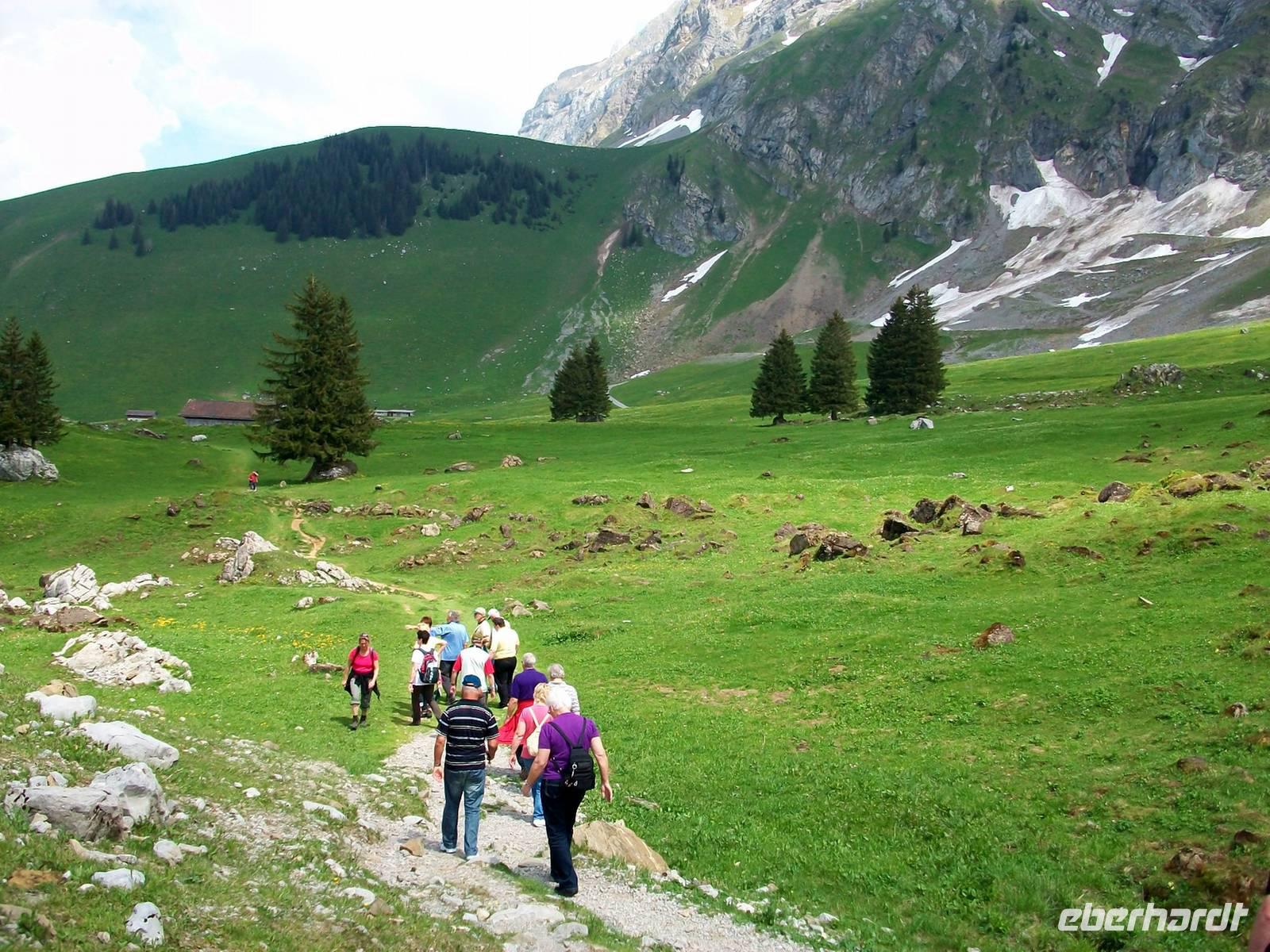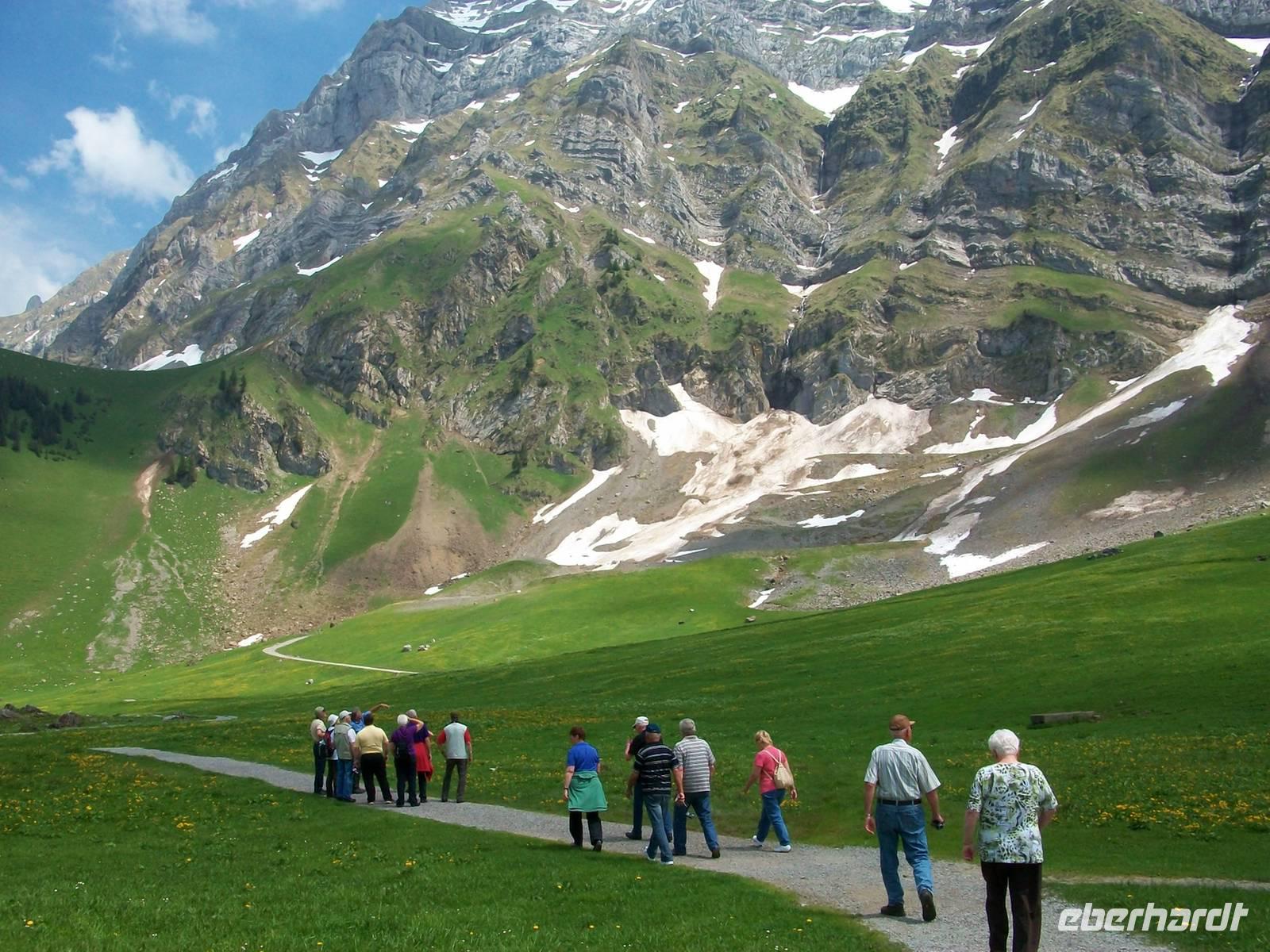 Am Nachmittag steht uns ein besonderer Höhepunkt bevor. Kurz nach zwei werden wir von Albert unserem Wanderführer begrüßt. Er wird uns nun in den nächsten zwei Stunden auf eine Wanderung mitnehmen die keine Wünsche offenlässt. Inmitten der grünen Wiesen mit den zahlreichen bunten Blüten nehmen wir unseren Weg. Albert bringt uns die Natur seiner Heimat nahe, wir erfahren Wissenswertes über das nicht immer einfache Leben der Menschen hier, und stehen staunend vor den Wundern dieser einmaligen Natur. Tief unten im Tal schlängelt sich ein kleiner Fluss durch die Wiesen, an anderer Stelle sind noch Schneefetzen zu sehen die langsam in der warmen Frühlingssonne schmelzen und über allem erhebt sich das grandiose Bergmassiv der Säntisgruppe und dominiert den Blick.