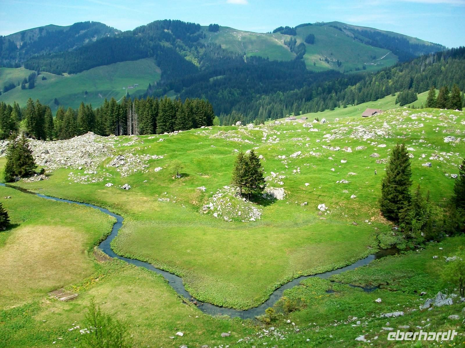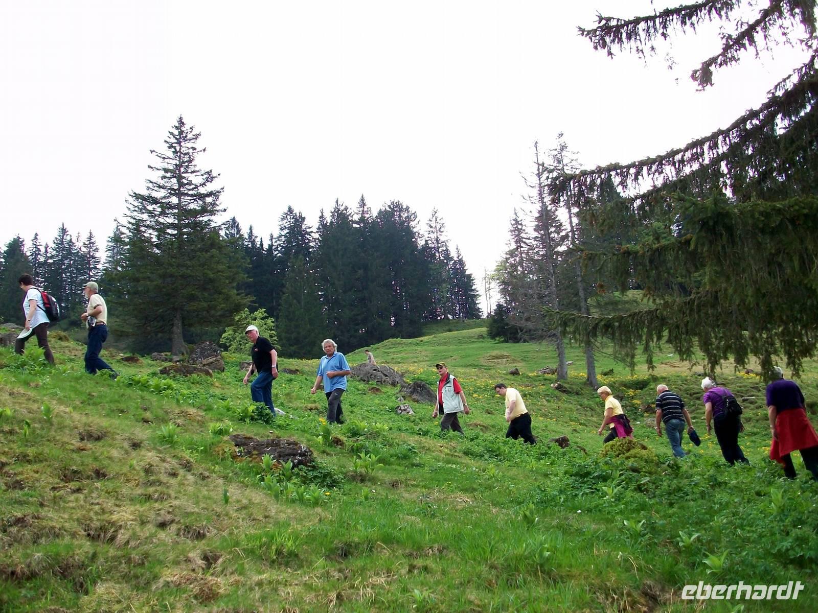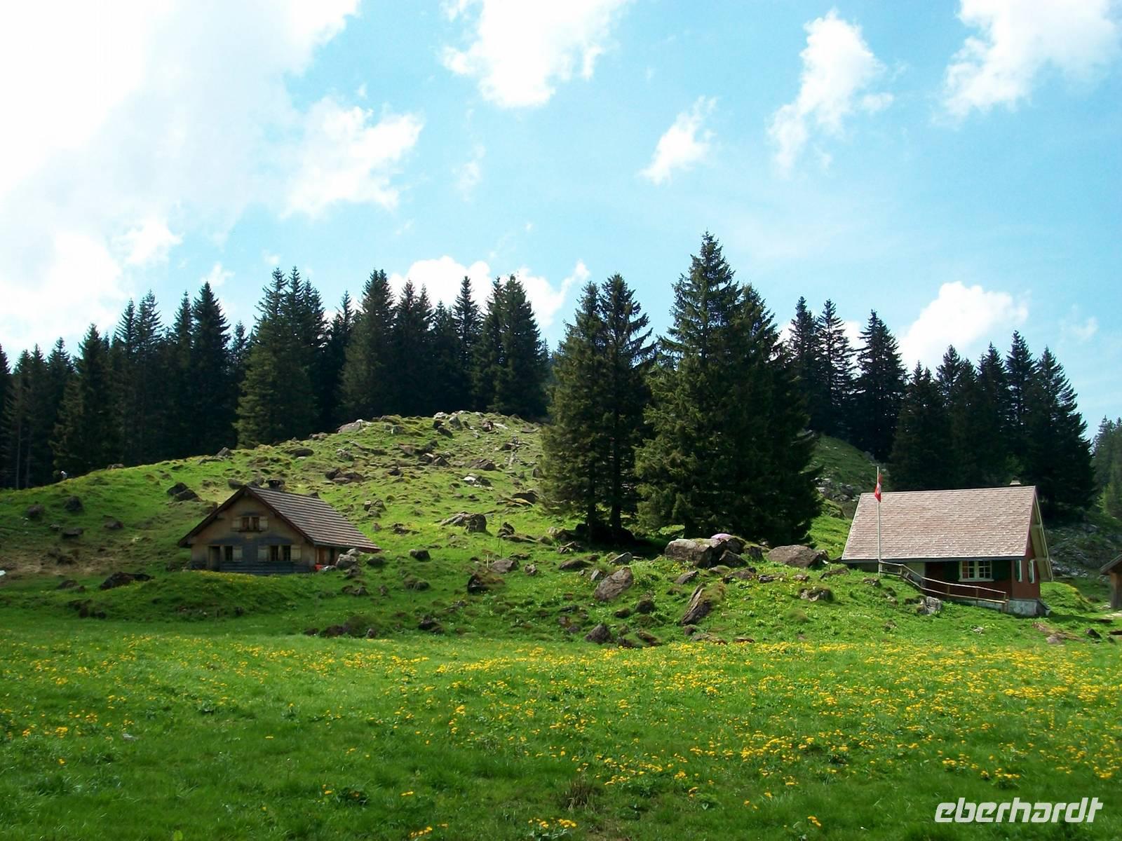 Am Nachmittag steht uns ein besonderer Höhepunkt bevor. Kurz nach zwei werden wir von Albert unserem Wanderführer begrüßt. Er wird uns nun in den nächsten zwei Stunden auf eine Wanderung mitnehmen die keine Wünsche offenlässt. Inmitten der grünen Wiesen mit den zahlreichen bunten Blüten nehmen wir unseren Weg. Albert bringt uns die Natur seiner Heimat nahe, wir erfahren Wissenswertes über das nicht immer einfache Leben der Menschen hier, und stehen staunend vor den Wundern dieser einmaligen Natur. Tief unten im Tal schlängelt sich ein kleiner Fluss durch die Wiesen, an anderer Stelle sind noch Schneefetzen zu sehen die langsam in der warmen Frühlingssonne schmelzen und über allem erhebt sich das grandiose Bergmassiv der Säntisgruppe und dominiert den Blick.