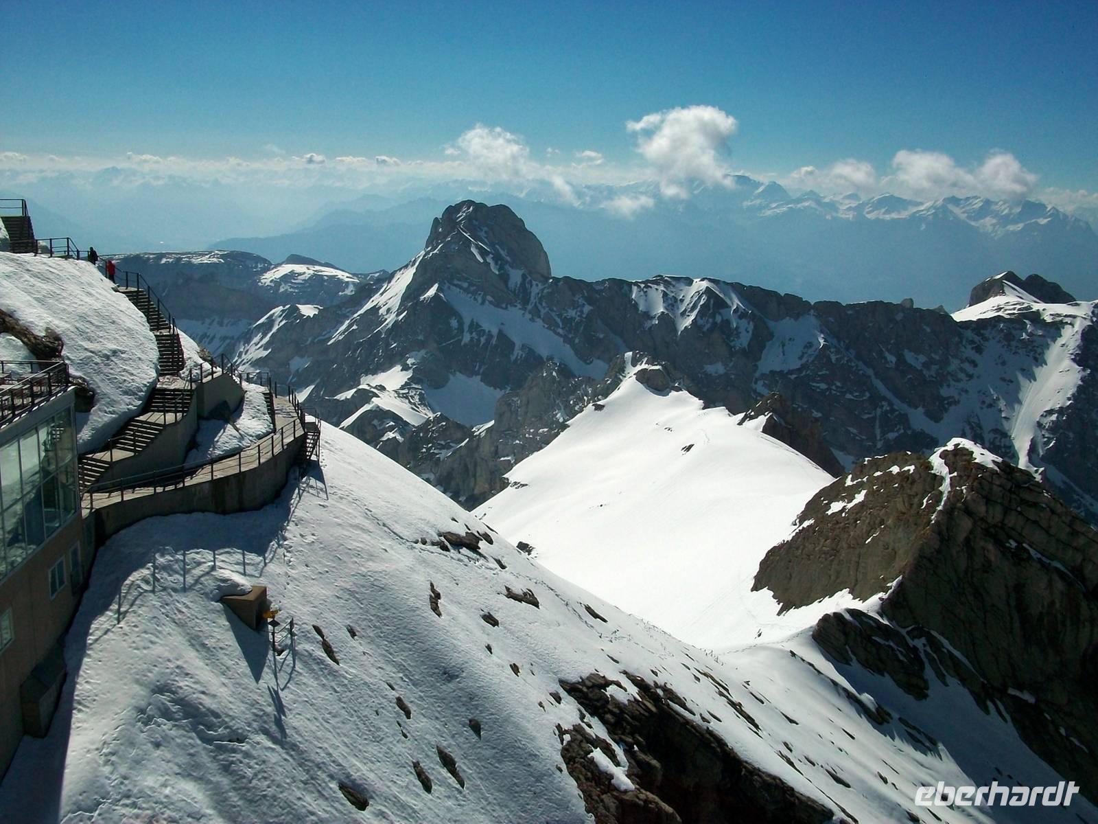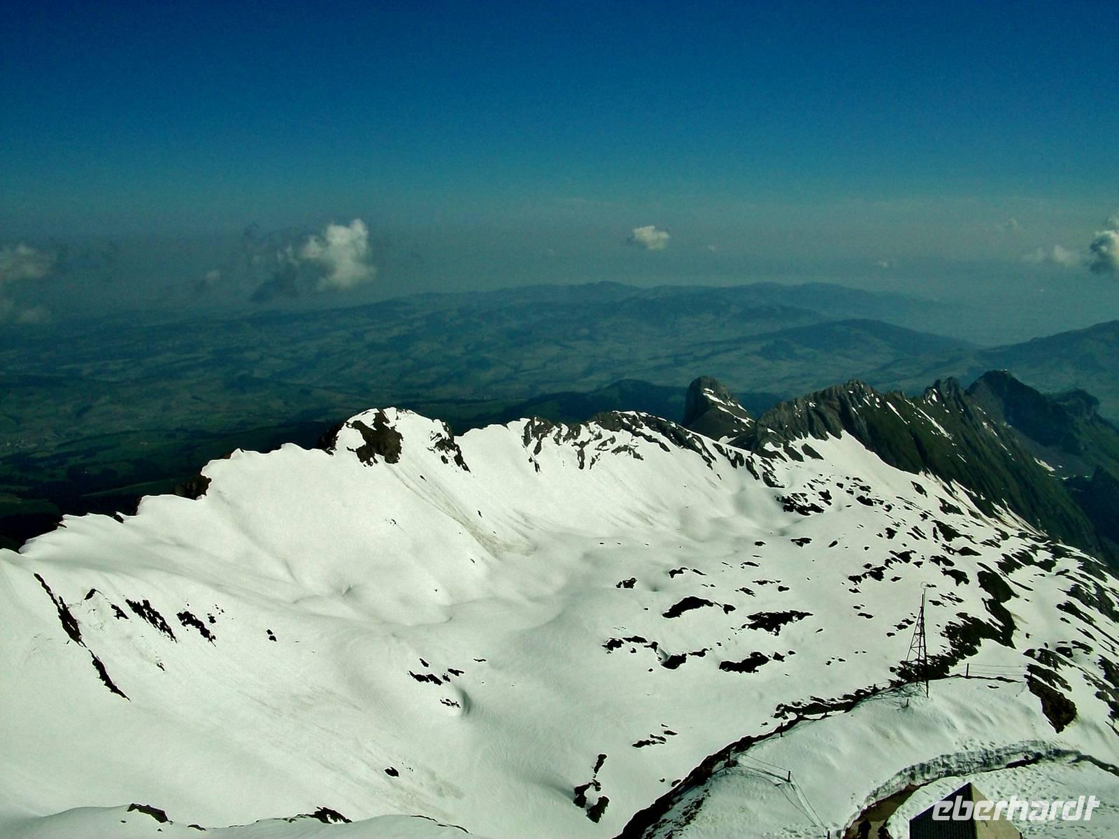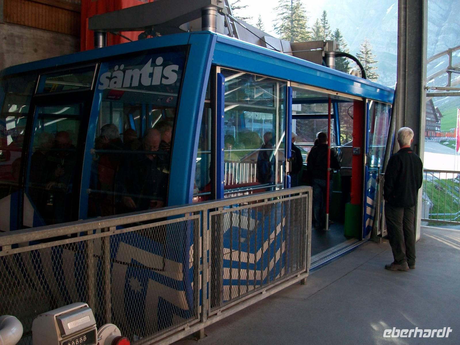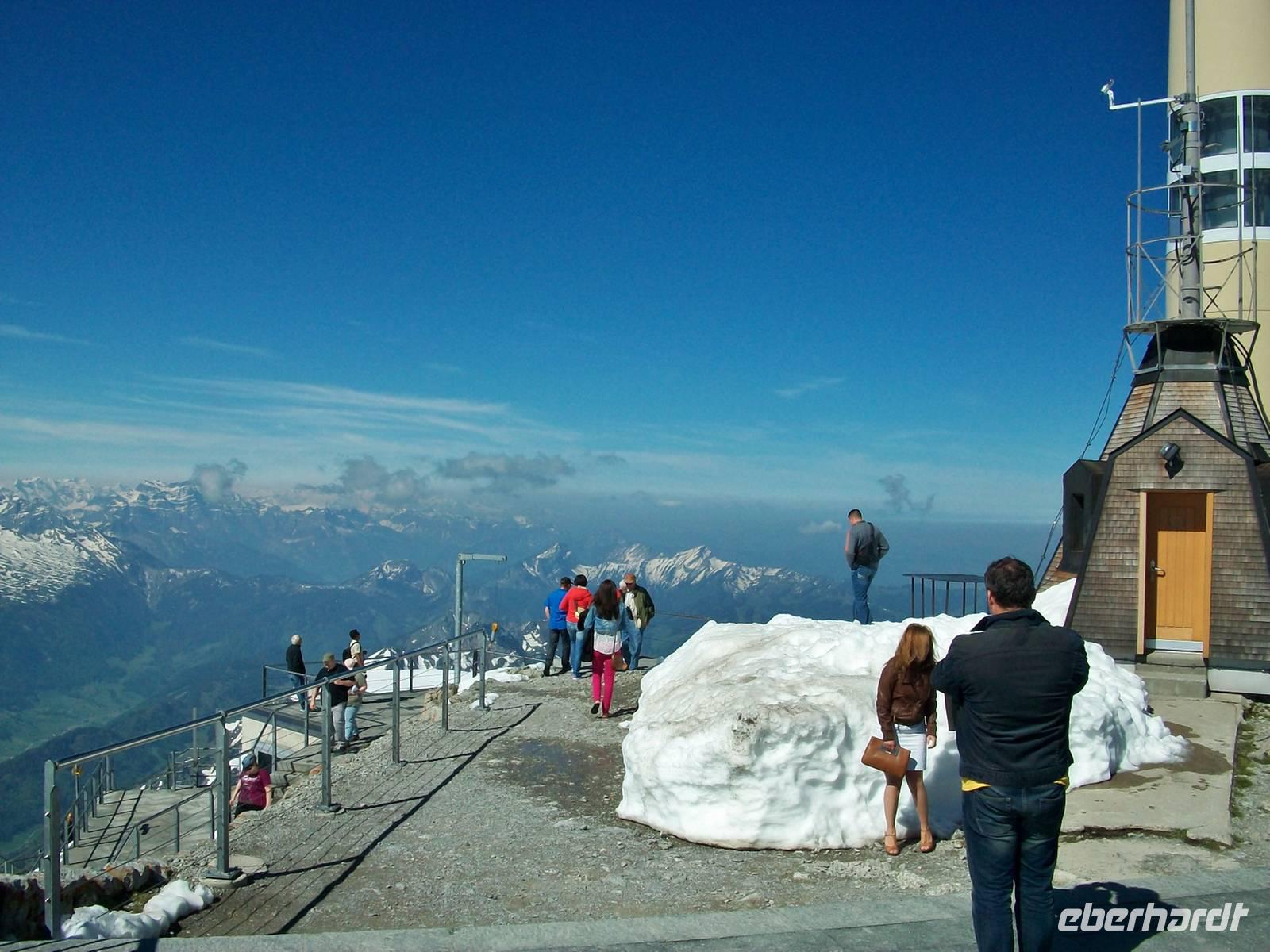 8.6.2013. Der Himmel ist fast wolkenlos als unsere Reisegruppe halb acht die Kabine der Säntisbahn besteigt. Erwartungsfroh haben sich die Gäste an den Fenstern aufgestellt und bald beginnt die Seilbahn ihre Fahrt. Alles unter uns wird kleiner und die Schneeberge kommen rasch näher. Nach knapp zehn Minuten sind wir oben auf über zweitausend Metern angelangt; im Panoramarestaurant sind Tische für uns reserviert und bald können wir unseren Appetit am reichhaltigen Buffet stillen. Dabei lassen wir unsere Blicke weit über die grandiose Bergwelt schweifen, das Auge kann sich dabei gar nicht satt sehen. Petrus gestattet uns einen weiten Blick, selbst die Viertausender von Eiger, Mönch und Jungfrau sind in der Ferne auszumachen.