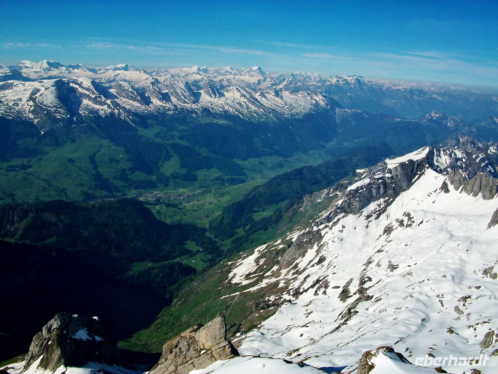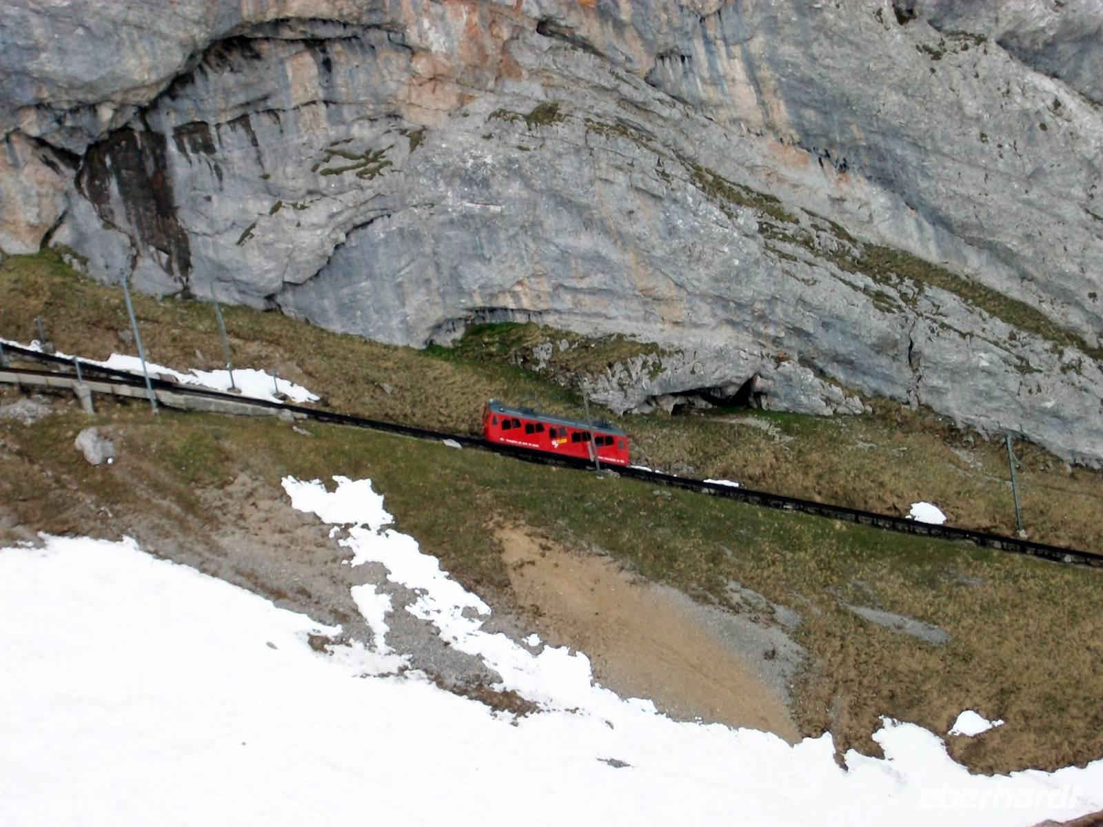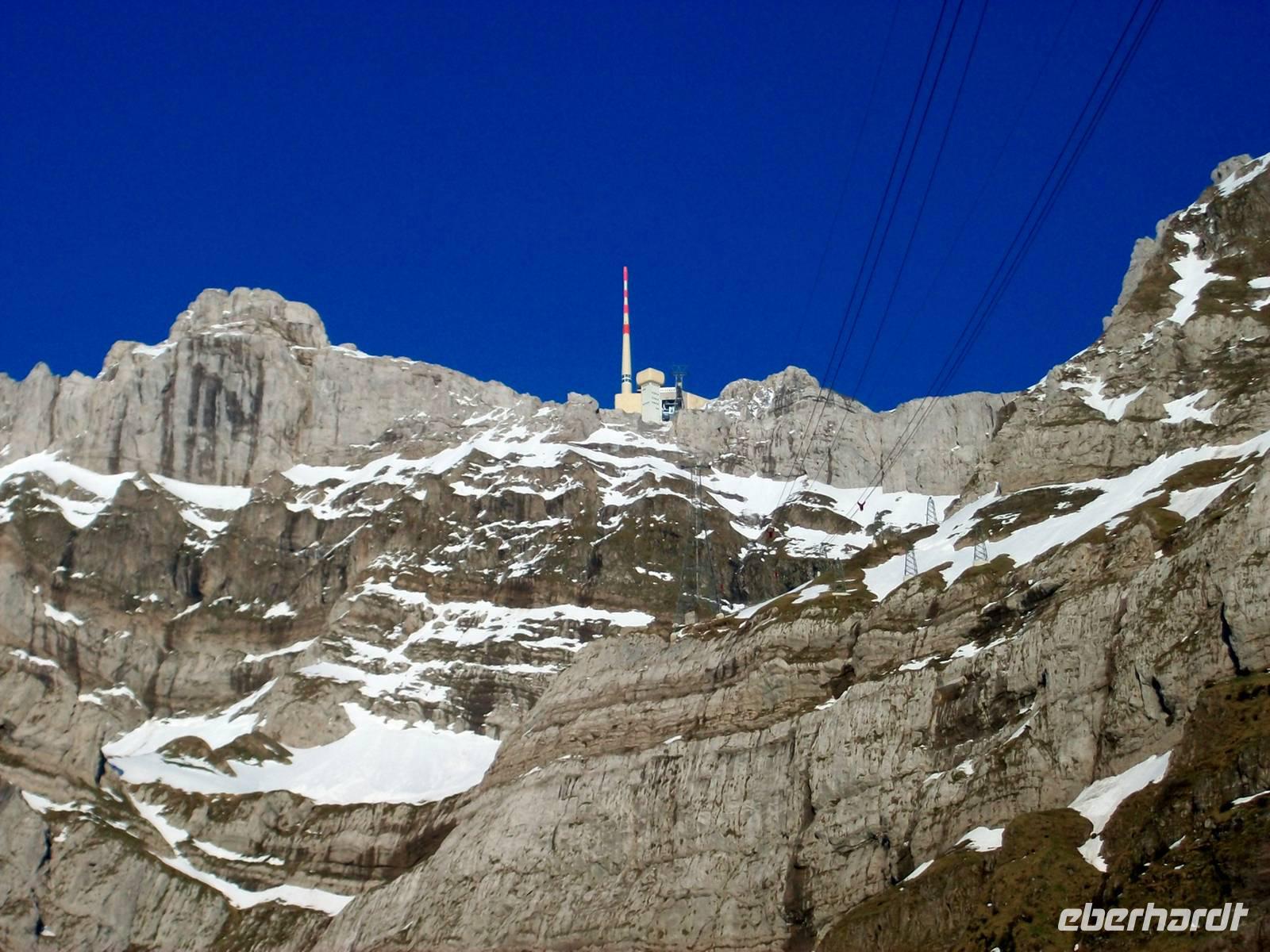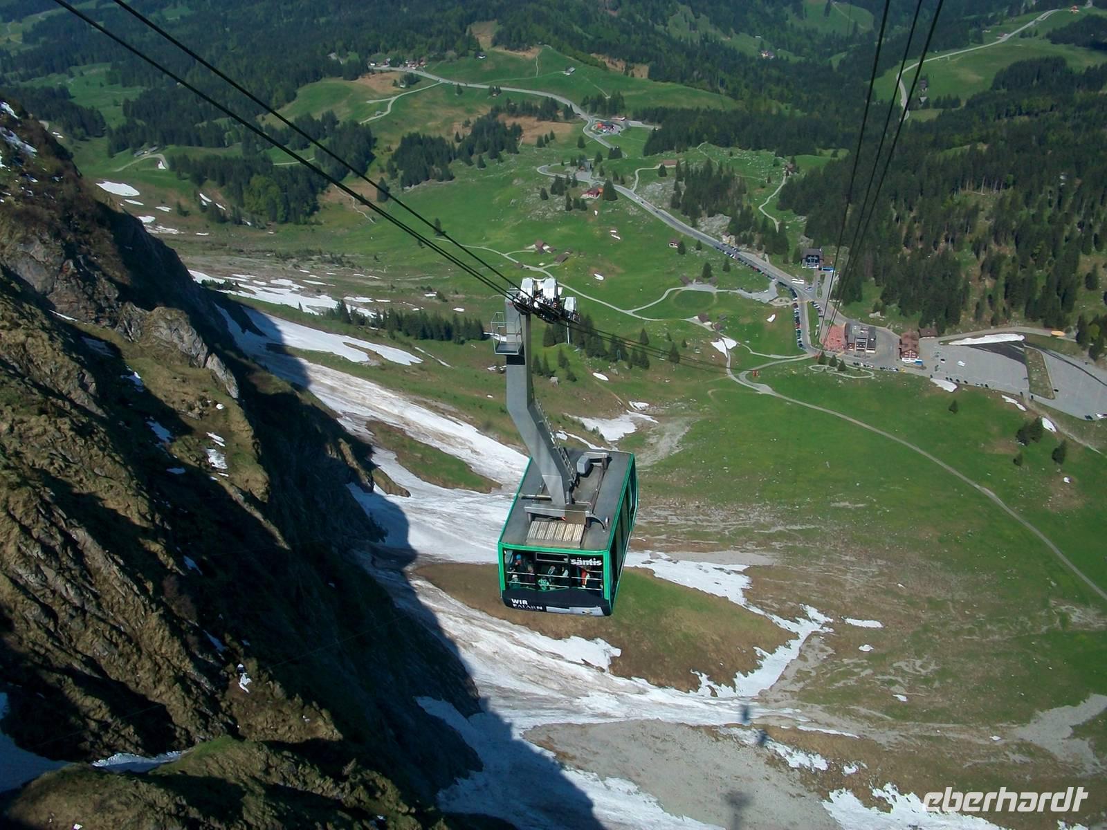 8.6.2013. Der Himmel ist fast wolkenlos als unsere Reisegruppe halb acht die Kabine der Säntisbahn besteigt. Erwartungsfroh haben sich die Gäste an den Fenstern aufgestellt und bald beginnt die Seilbahn ihre Fahrt. Alles unter uns wird kleiner und die Schneeberge kommen rasch näher. Nach knapp zehn Minuten sind wir oben auf über zweitausend Metern angelangt; im Panoramarestaurant sind Tische für uns reserviert und bald können wir unseren Appetit am reichhaltigen Buffet stillen. Dabei lassen wir unsere Blicke weit über die grandiose Bergwelt schweifen, das Auge kann sich dabei gar nicht satt sehen. Petrus gestattet uns einen weiten Blick, selbst die Viertausender von Eiger, Mönch und Jungfrau sind in der Ferne auszumachen.