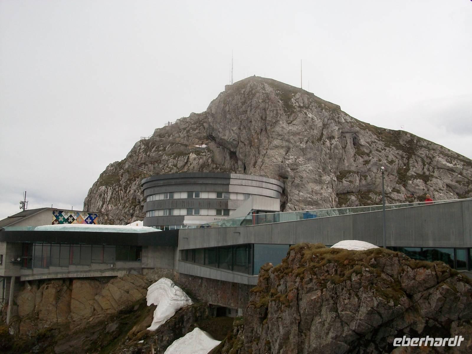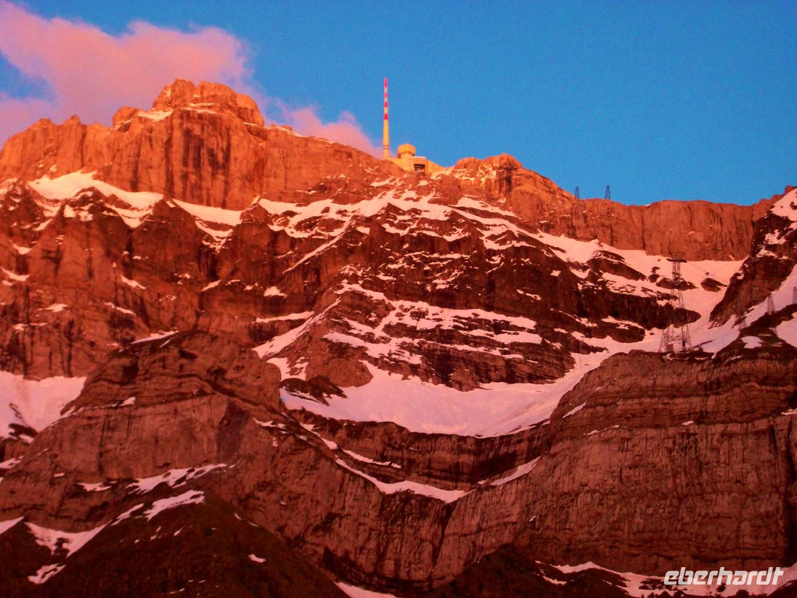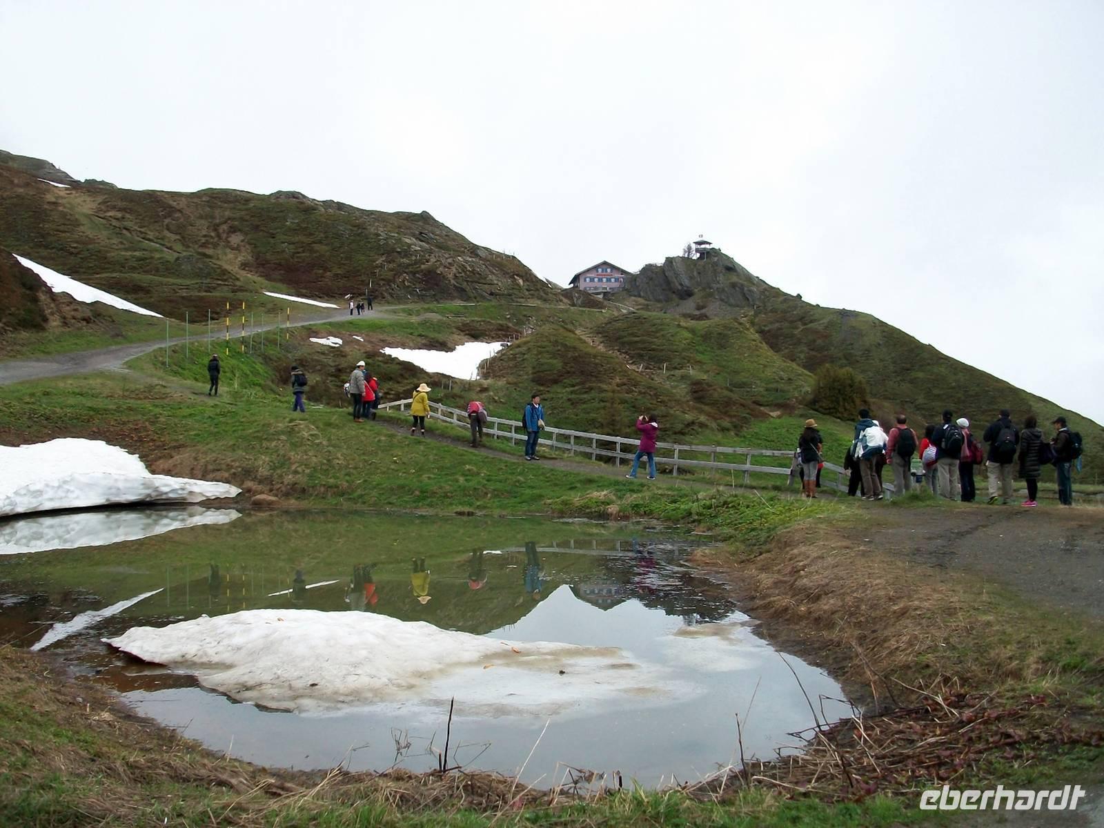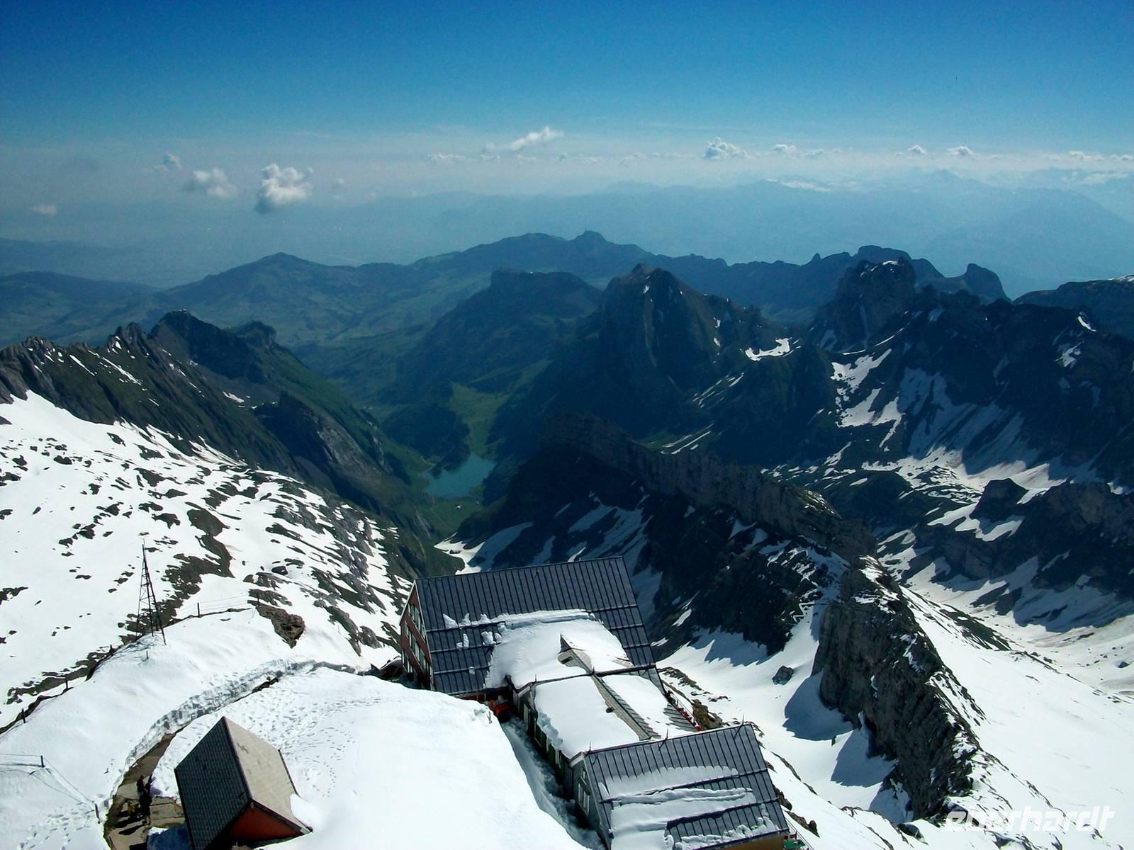 8.6.2013. Der Himmel ist fast wolkenlos als unsere Reisegruppe halb acht die Kabine der Säntisbahn besteigt. Erwartungsfroh haben sich die Gäste an den Fenstern aufgestellt und bald beginnt die Seilbahn ihre Fahrt. Alles unter uns wird kleiner und die Schneeberge kommen rasch näher. Nach knapp zehn Minuten sind wir oben auf über zweitausend Metern angelangt; im Panoramarestaurant sind Tische für uns reserviert und bald können wir unseren Appetit am reichhaltigen Buffet stillen. Dabei lassen wir unsere Blicke weit über die grandiose Bergwelt schweifen, das Auge kann sich dabei gar nicht satt sehen. Petrus gestattet uns einen weiten Blick, selbst die Viertausender von Eiger, Mönch und Jungfrau sind in der Ferne auszumachen.