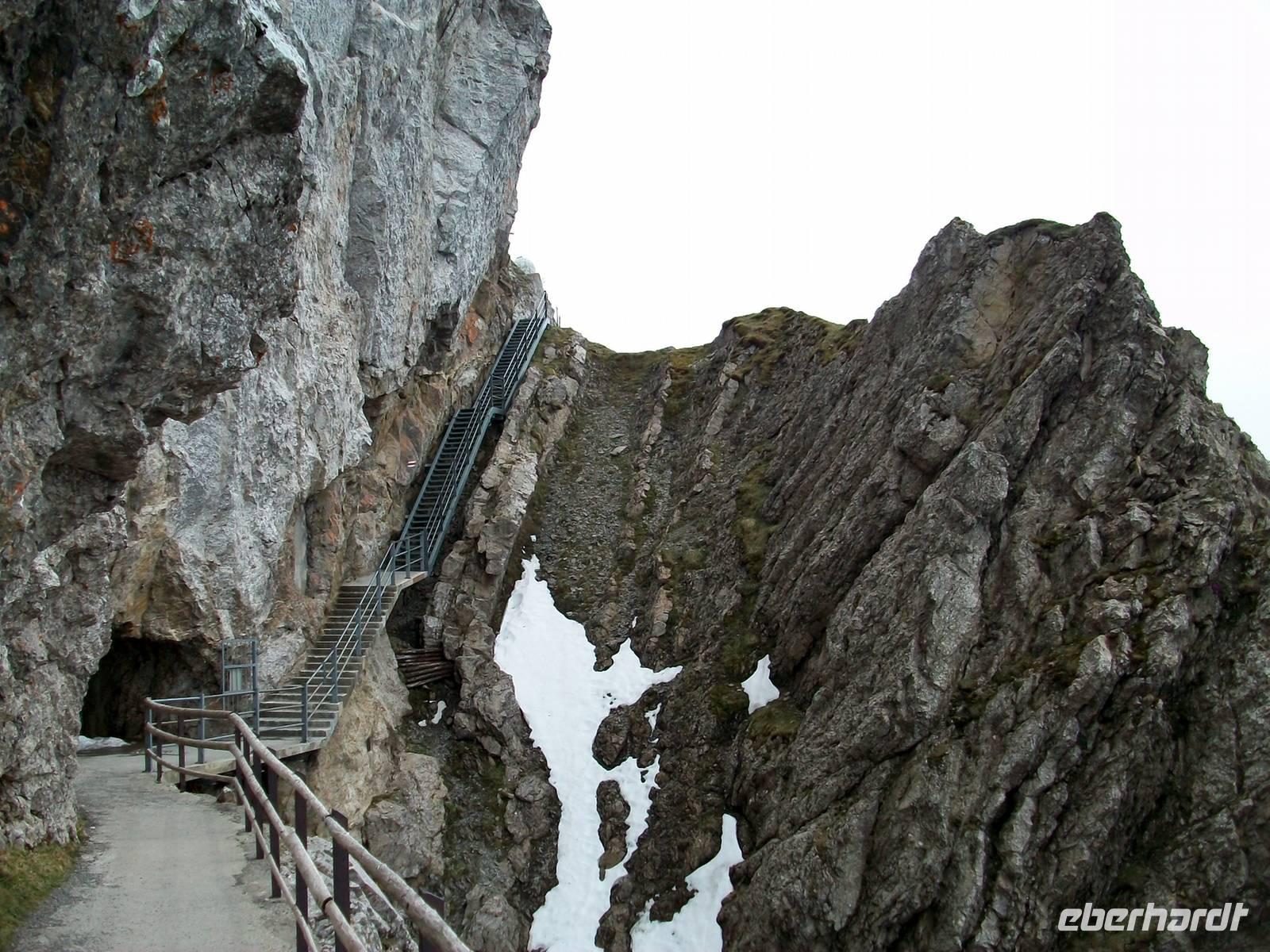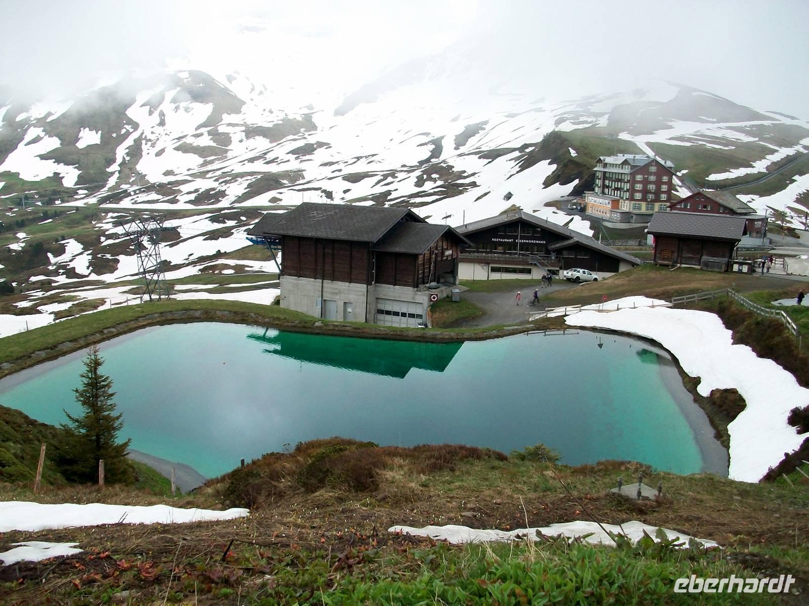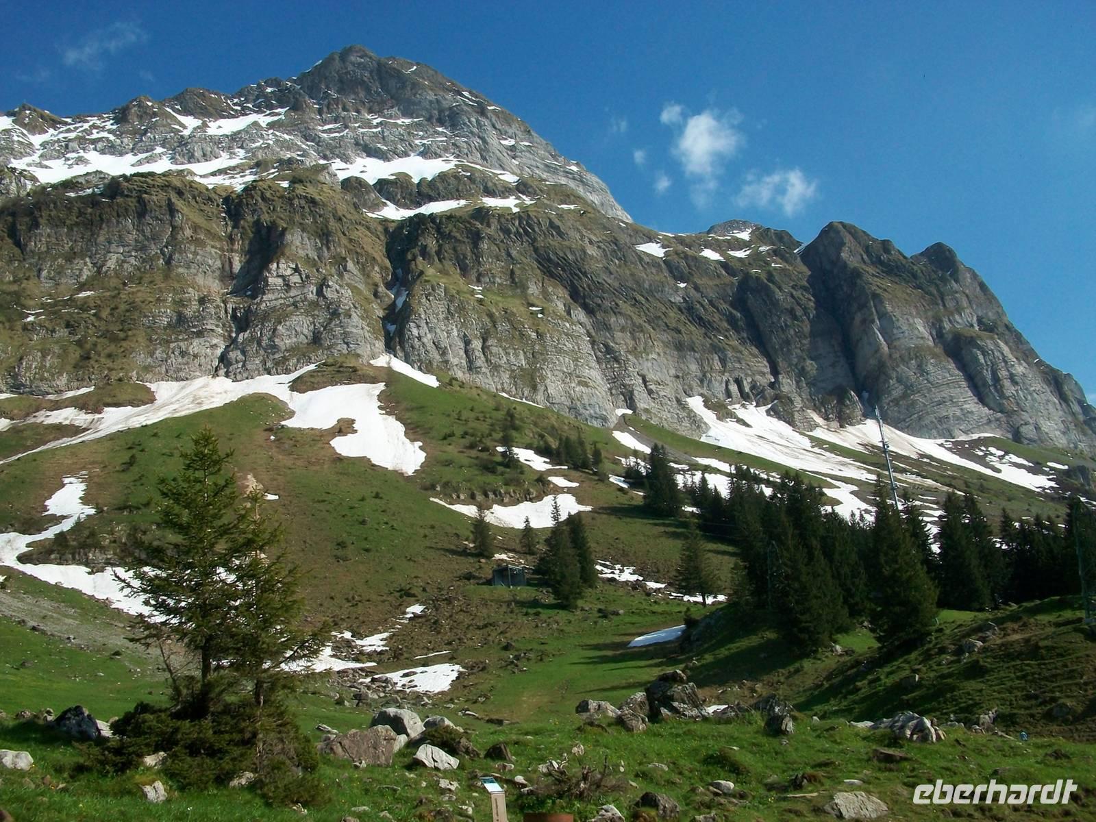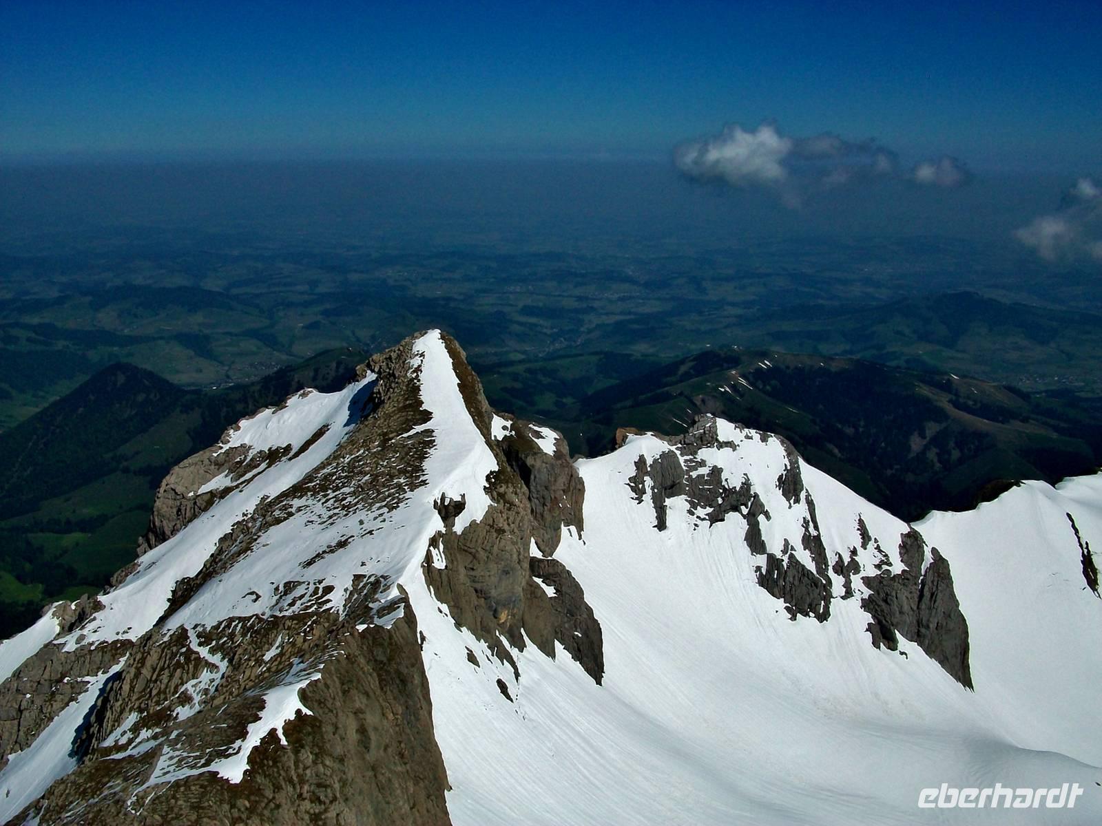 8.6.2013. Der Himmel ist fast wolkenlos als unsere Reisegruppe halb acht die Kabine der Säntisbahn besteigt. Erwartungsfroh haben sich die Gäste an den Fenstern aufgestellt und bald beginnt die Seilbahn ihre Fahrt. Alles unter uns wird kleiner und die Schneeberge kommen rasch näher. Nach knapp zehn Minuten sind wir oben auf über zweitausend Metern angelangt; im Panoramarestaurant sind Tische für uns reserviert und bald können wir unseren Appetit am reichhaltigen Buffet stillen. Dabei lassen wir unsere Blicke weit über die grandiose Bergwelt schweifen, das Auge kann sich dabei gar nicht satt sehen. Petrus gestattet uns einen weiten Blick, selbst die Viertausender von Eiger, Mönch und Jungfrau sind in der Ferne auszumachen.