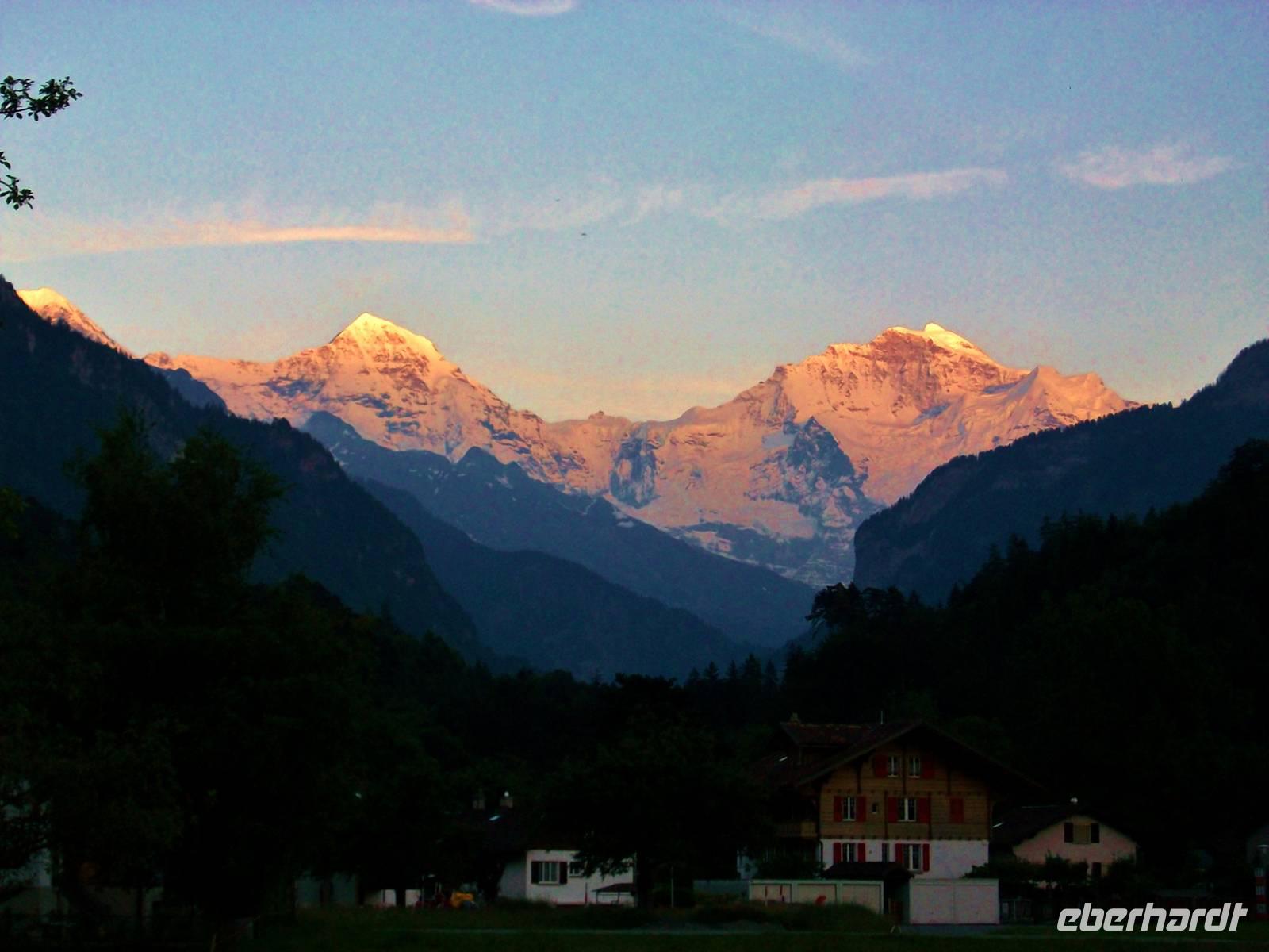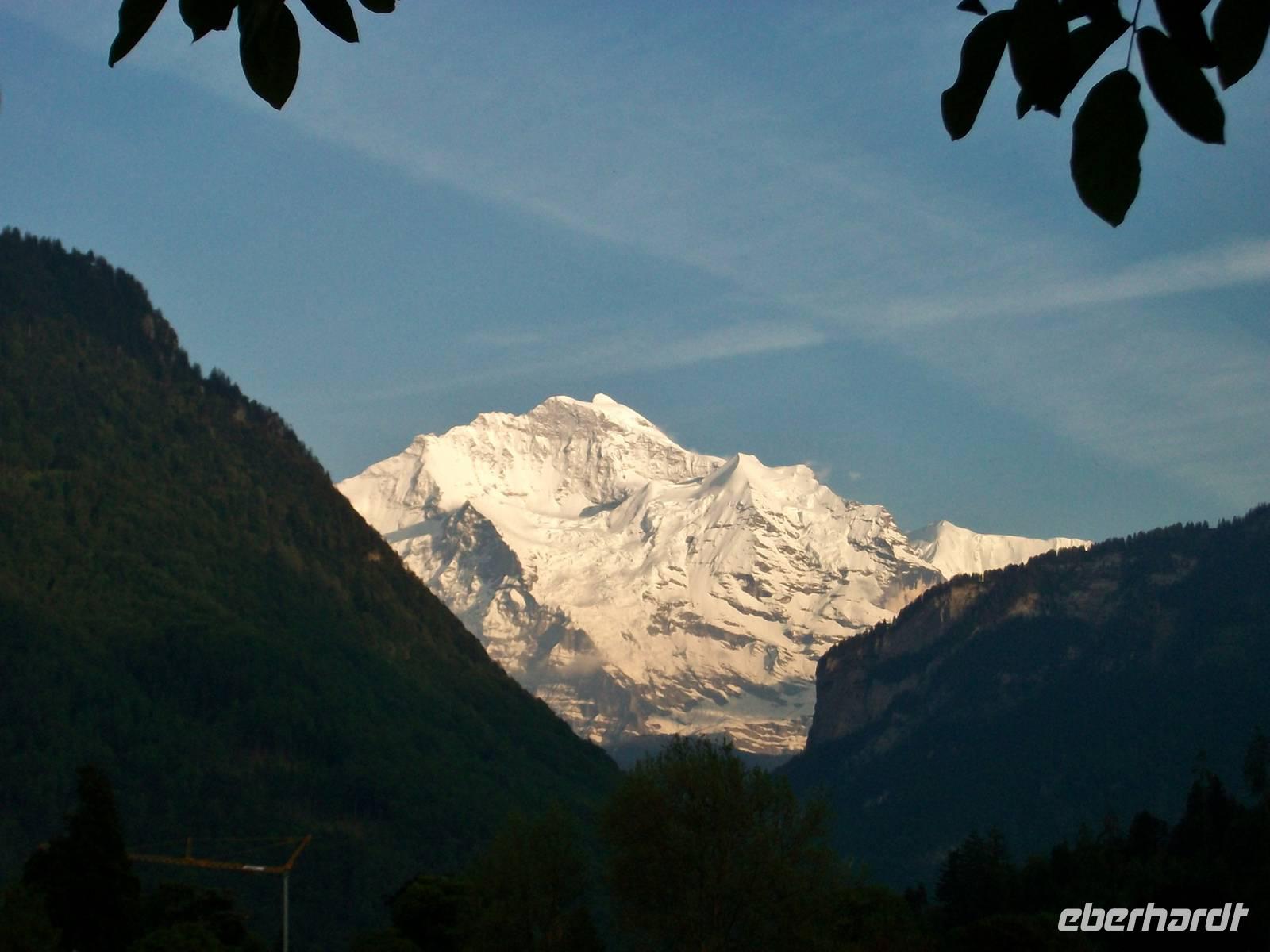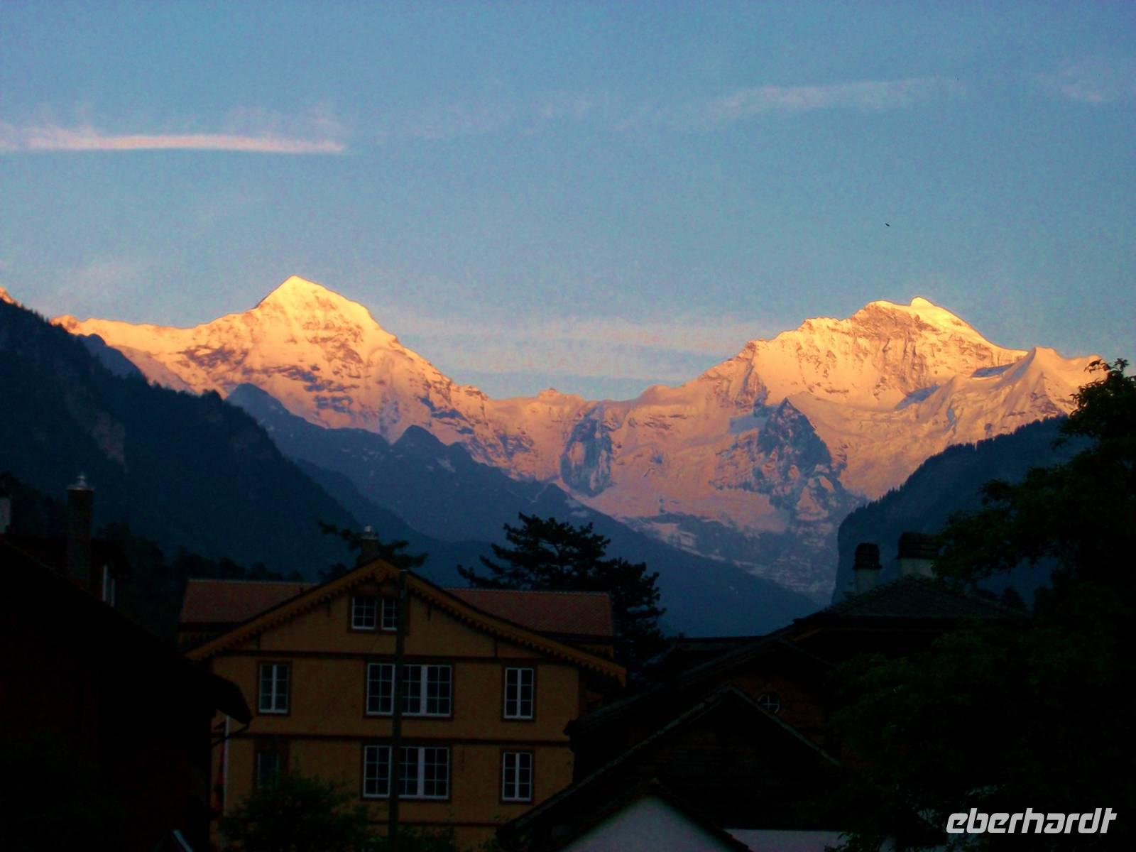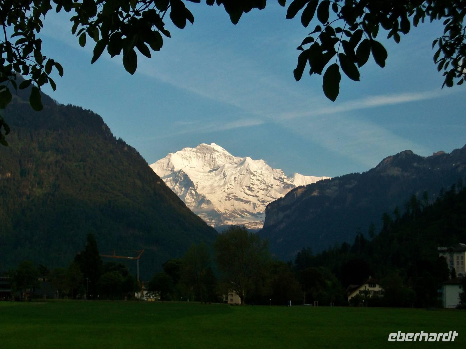 Das Wetter bleibt an diesem Nachmittag schön und am Abend ziehen die letzten Wolken heraus und von der Ortsmitte Interlakens können wir nun endlich auch einen ungetrübten Blick auf das Jungfraugebiet werfen.