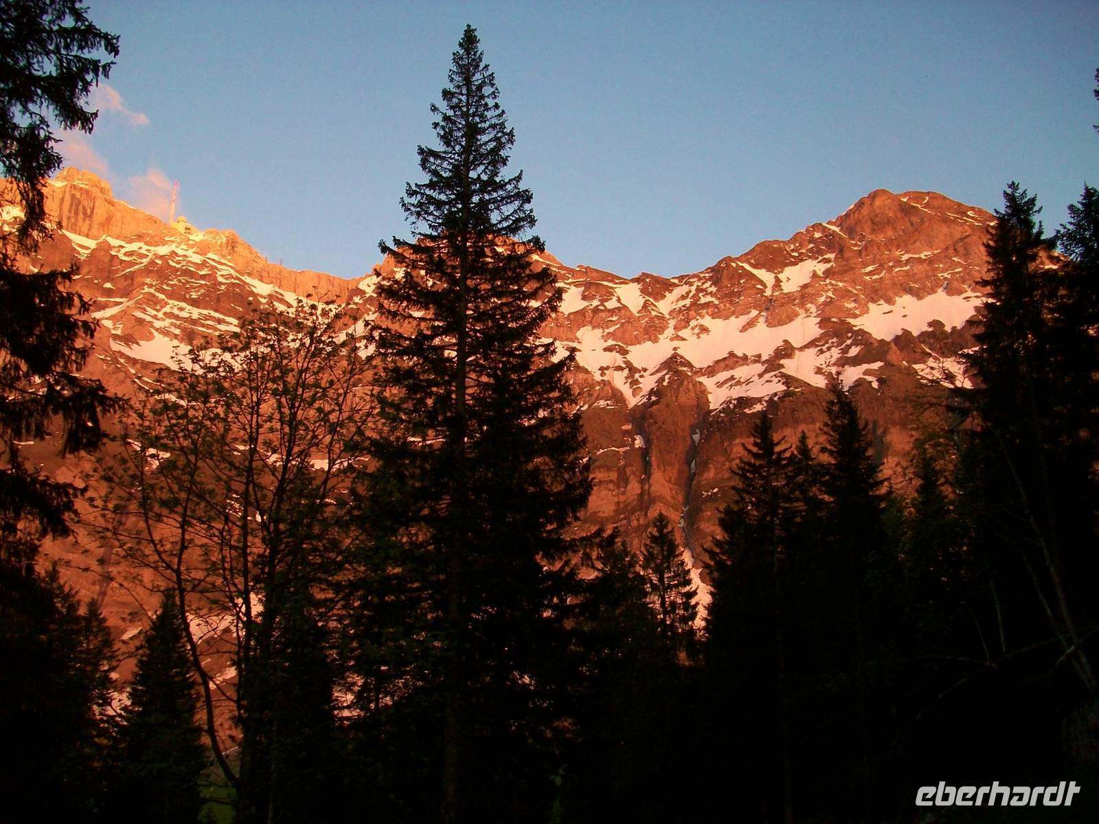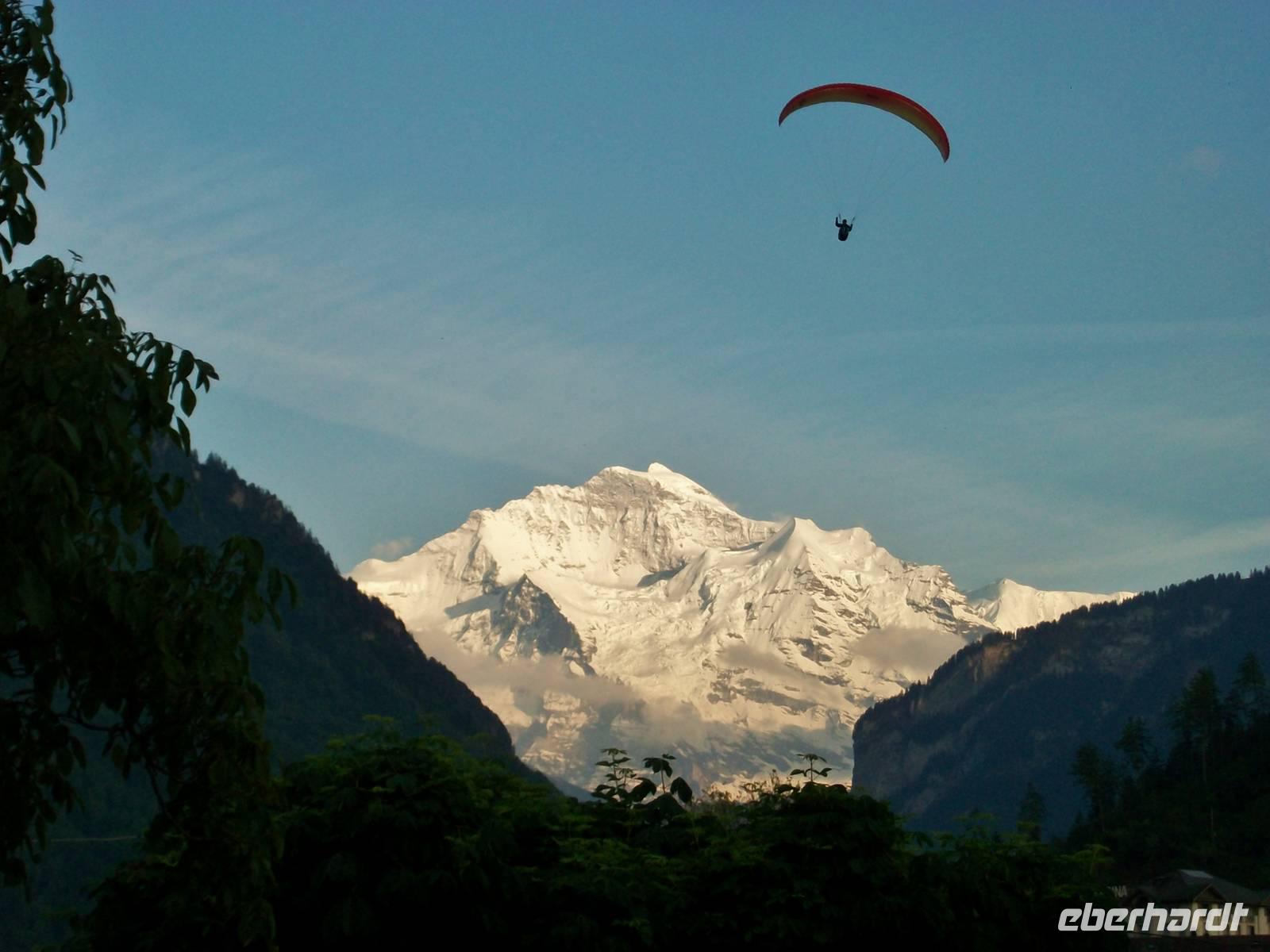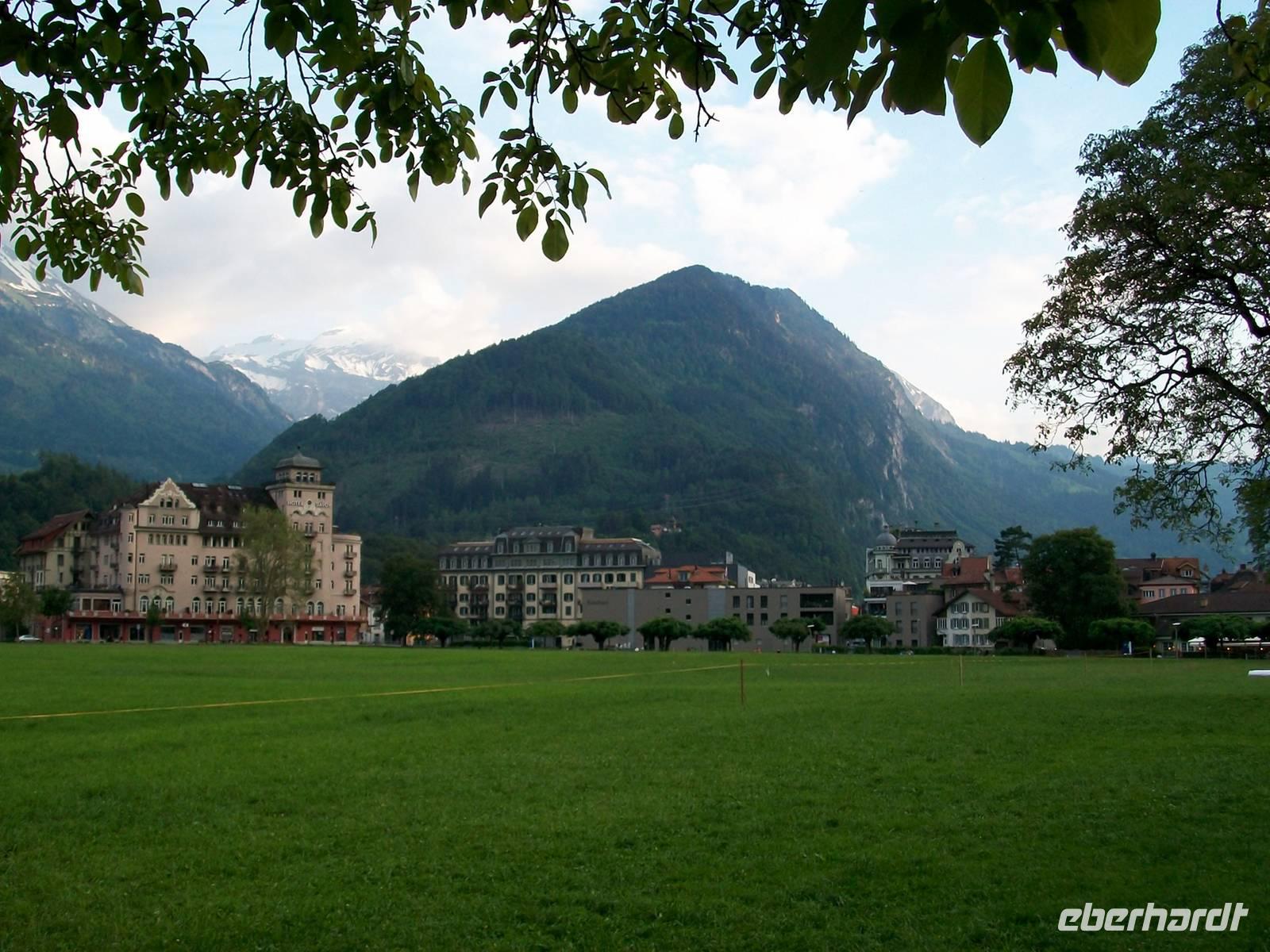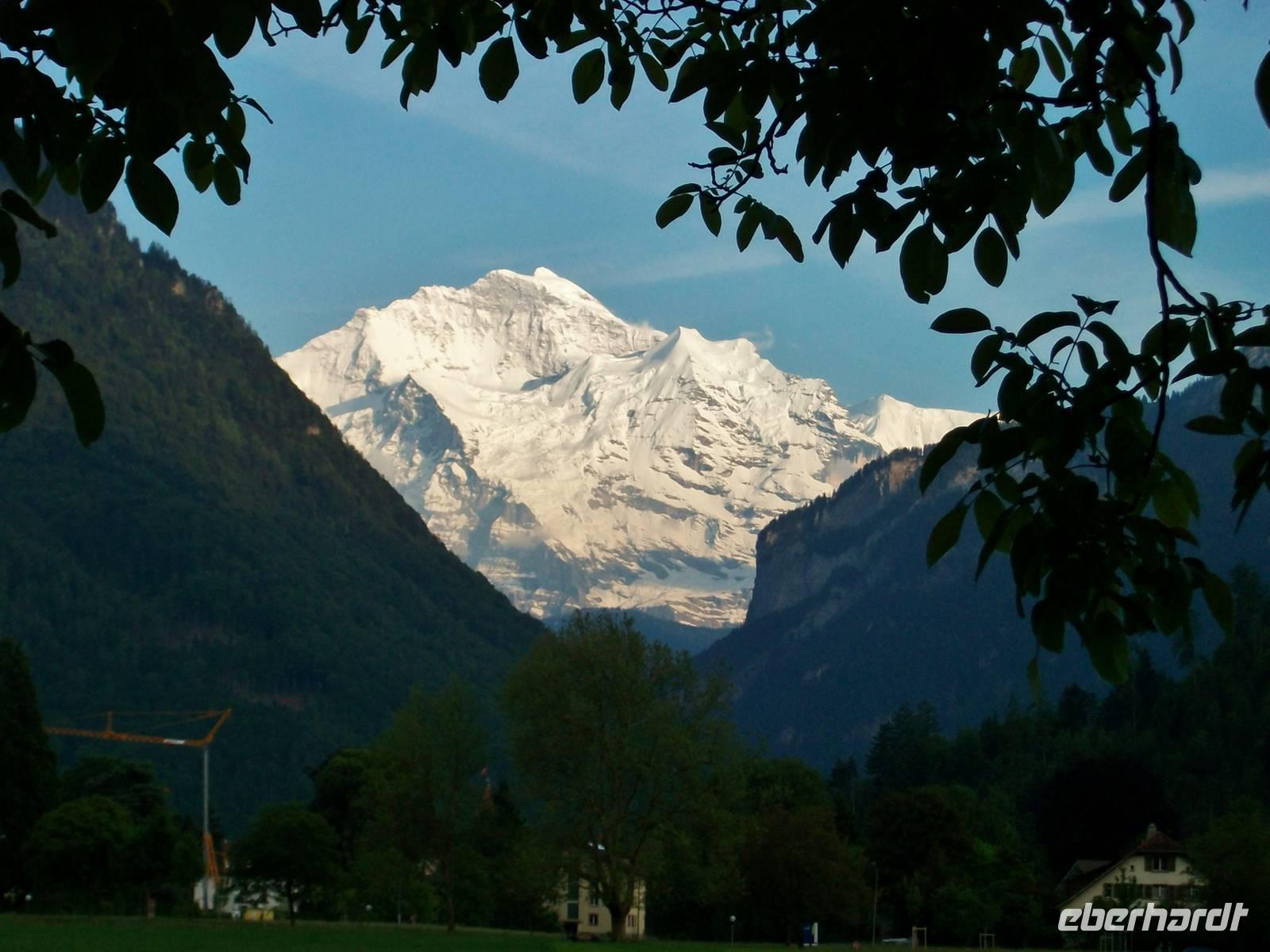 Das Wetter bleibt an diesem Nachmittag schön und am Abend ziehen die letzten Wolken heraus und von der Ortsmitte Interlakens können wir nun endlich auch einen ungetrübten Blick auf das Jungfraugebiet werfen.