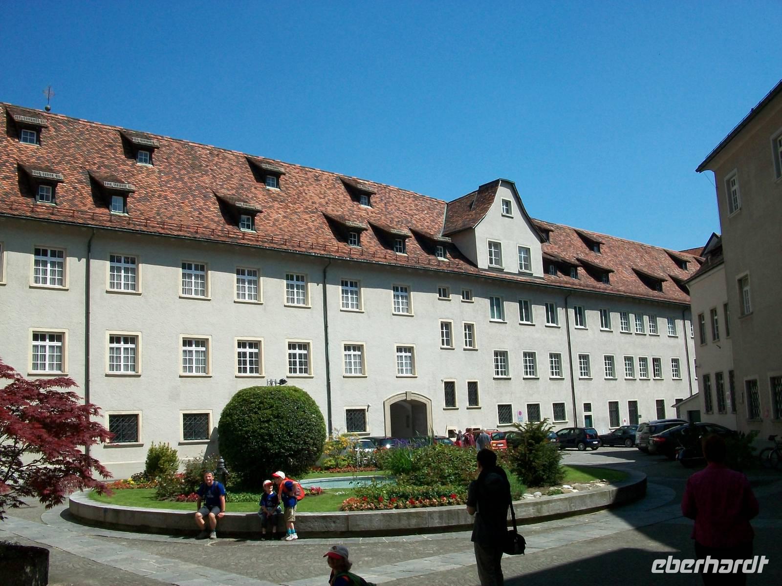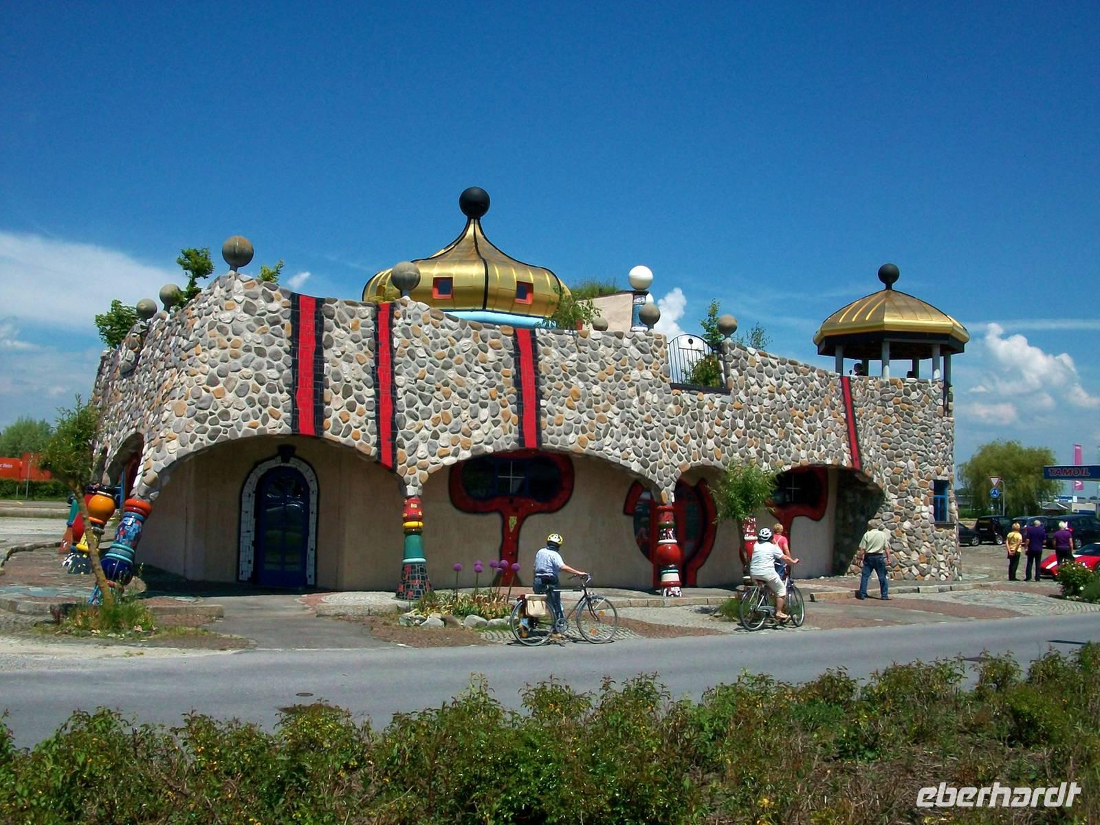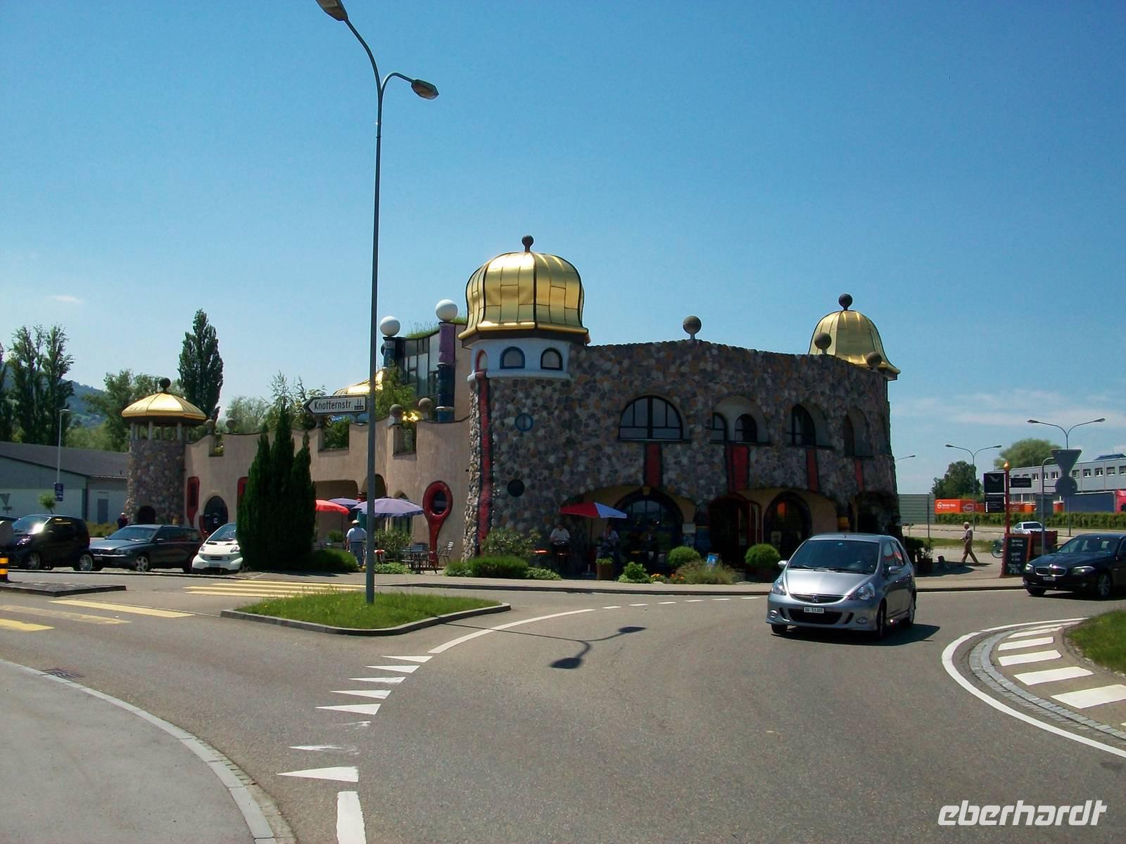 Am Nachmittag verlassen wir die Stadt um eine schöne Fahrt am Bodensee zu unternehmen. Dabei lacht uns die Sonne weiterhin zu, bald sehen wir auch die mächtige Fläche des Sees. Drei Länder teilen sich dieses große Gewässer: Deutschland, Österreich und die Schweiz. An diesem Nachmittag fahren wir dann fast am gesamten Seeufer auf Schweizer Seite entlang. Zuerst besuchen wir die originelle Markthalle die der bekannte Architekt Hundertwasser schuf. Mit den kuriosen Türmen und den bunten Farben scheint sie gar nicht hierher zu passen, aber dennoch fasziniert dieses Gebäude den Betrachter.