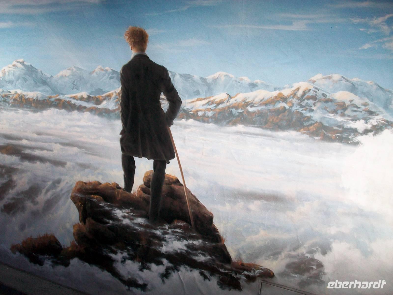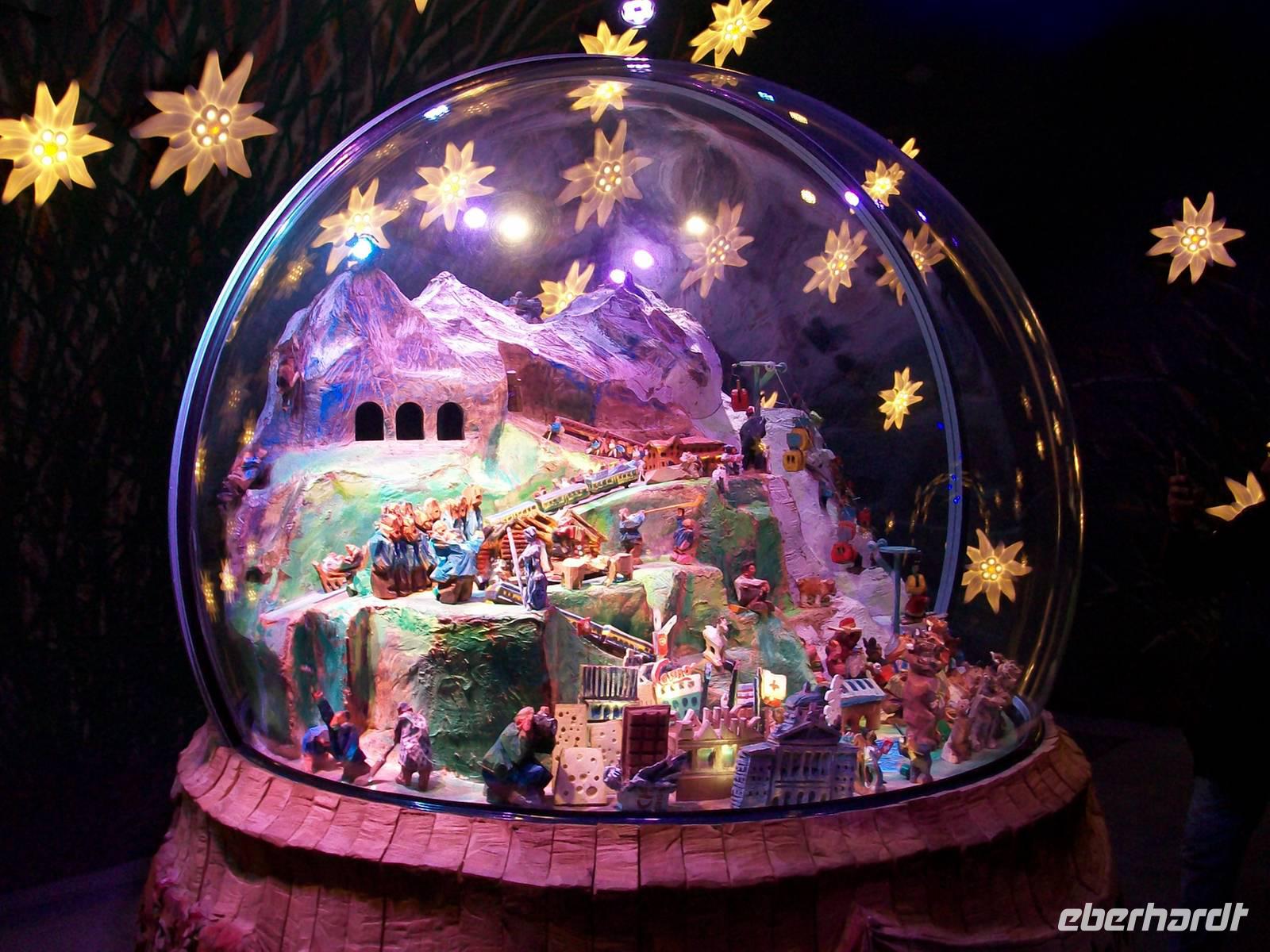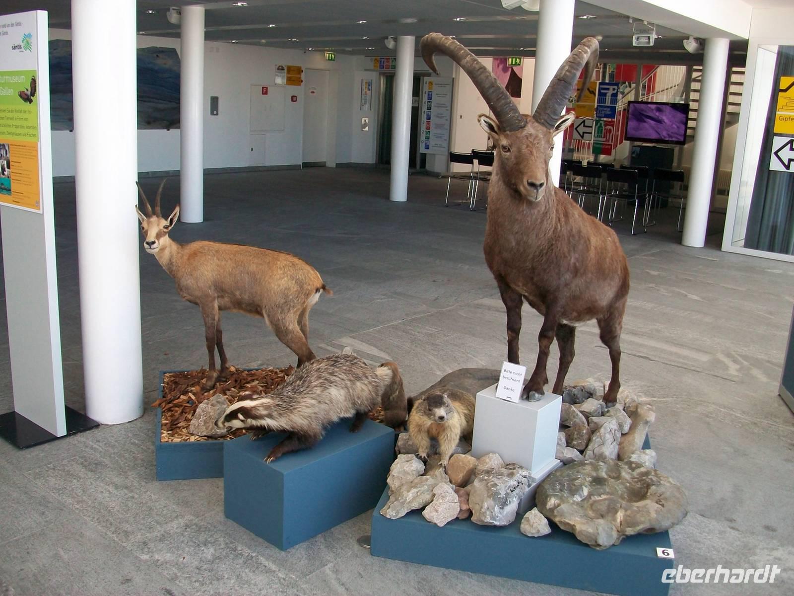 Aber hier oben kann man sich die Zeit auch anderweit gut vertreiben: es gibt einen schönen Eispalast mit skurrilen Skulpturen, ein 360° Kino in dem wir einen Flug über die Alpen genießen können, ein Laufband von dem der Betrachter verschiedene Blickwinkel der Schweiz kennenlernt, viele Cafés und Restaurants und verschiedene Möglichkeiten des Shoppings. Dabei geht der Blick immer wieder hinaus oder man ist auf dem Plateau oder dem Gletscher selbst unterwegs; hier sind wir im Reich des ewigen Schnees in dem auch die Skifahrer unterwegs sind.