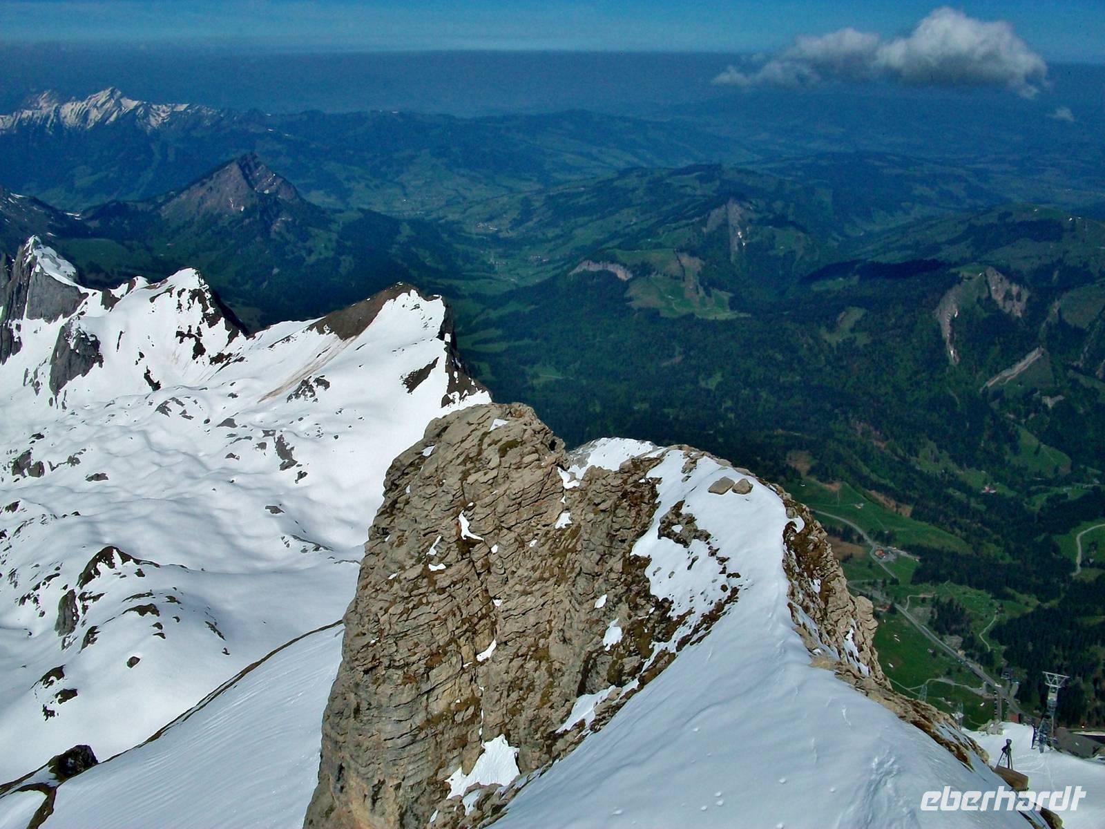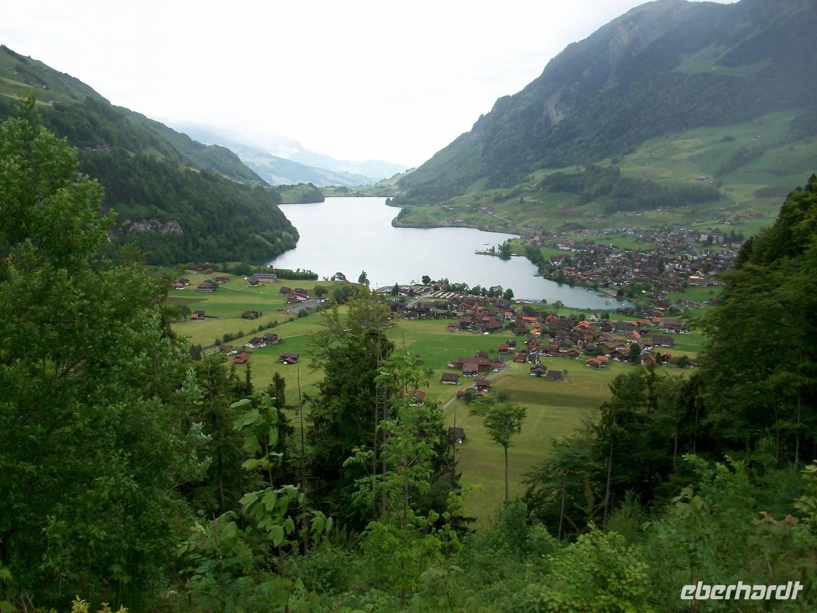 Tief unten sind die zwei Oberländer Seen zusehen, dazwischen die Stadt Interlaken und am anderen Ende des Tals steigen die Berge auf. Sehr beeindruckend ist der Blick hinüber zu den Schneebergen von Eiger, Mönch und Jungfrau. Diese Formation erstrahlt im hellen Weiß frisch gefallenen Schnees und bildet gleichsam einen überwältigenden Kontrast zum Blau des Himmels und dem Grün im Tal- wunderschön!