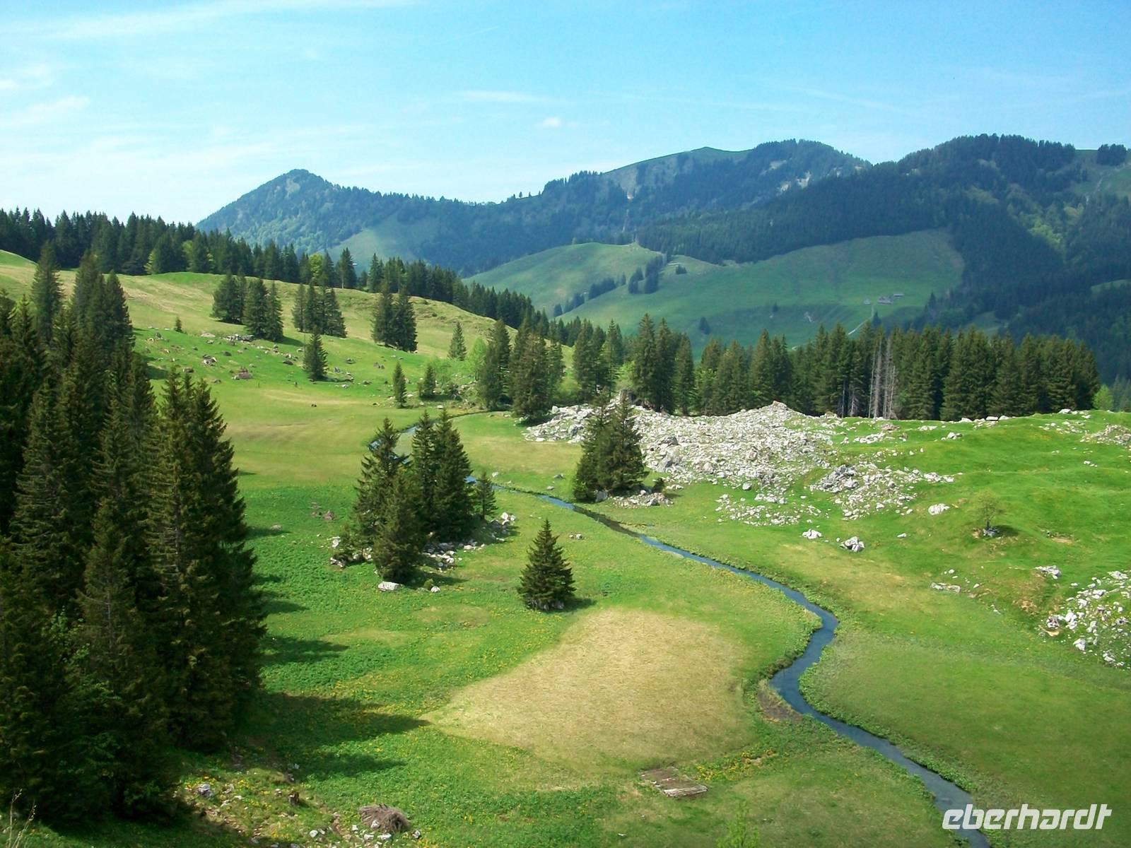 Nicht lange, und es erheben sich vor unseren Augen die Allgäuer Alpen und bald sind wir auch an der österreichischen Grenze angelangt. Nun sind wir richtig in den Bergen, voraus erstreckt sich das Rheintal, wir gelangen aber am Bodensee entlang in das Appenzeller Land. Die Sonne bescheint dabei eine reizvolle Szenerie: im Hintergrund ist schon die mächtige Wand des Säntisgebirges zu sehen mit vielen Schneefeldern; hier unten stehen die grünen Frühlingswiesen in bunter Pracht- alles das gibt einen wunderschönen Kontrast.
