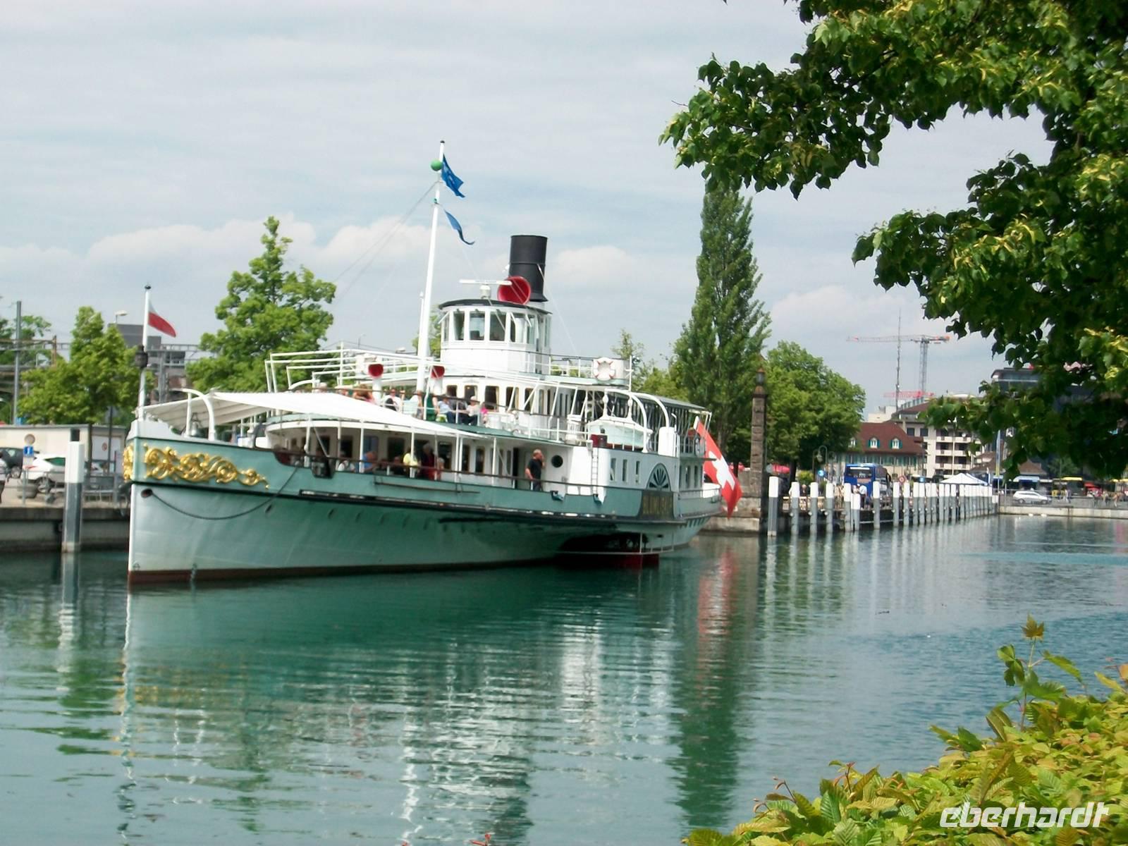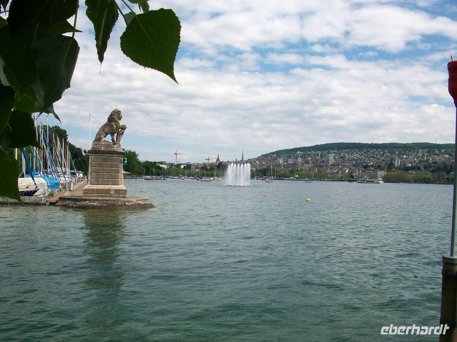 9.6.2013. Heute hat sich das Säntisgebirge hinter einer Schicht dicker Wolken versteckt. Dadurch fällt der Abschied von dieser schönen Ecke auch nicht so schwer. Bald sind wir unten im Tal angelangt und erklimmen wenig später ein sanftes Mittelgebirge. Es ist das Toggenburg mit seinen lieblichen Erhebungen, bald ist auch schon der Zürichsee zu sehen. An seinem Ufer gelangen wir zur Stadt selbst, hier werden wir schon von unserer Stadtführerin erwartet. Dann beginnt die Rundfahrt in dieser schönen Stadt; zuerst gelangen wir hinunter zur Uferpromenade und können den Blick über Stadt und See schweifen lassen. Dann geht es bergauf, von einer schönen Aussichtsterrasse haben wir die Stadt zu unseren Füßen. Auch wenn der Himmel sich heute etwas bezogen hat, die Sonne bekommt hin und wieder doch ihre Chance und es ist angenehm warm.