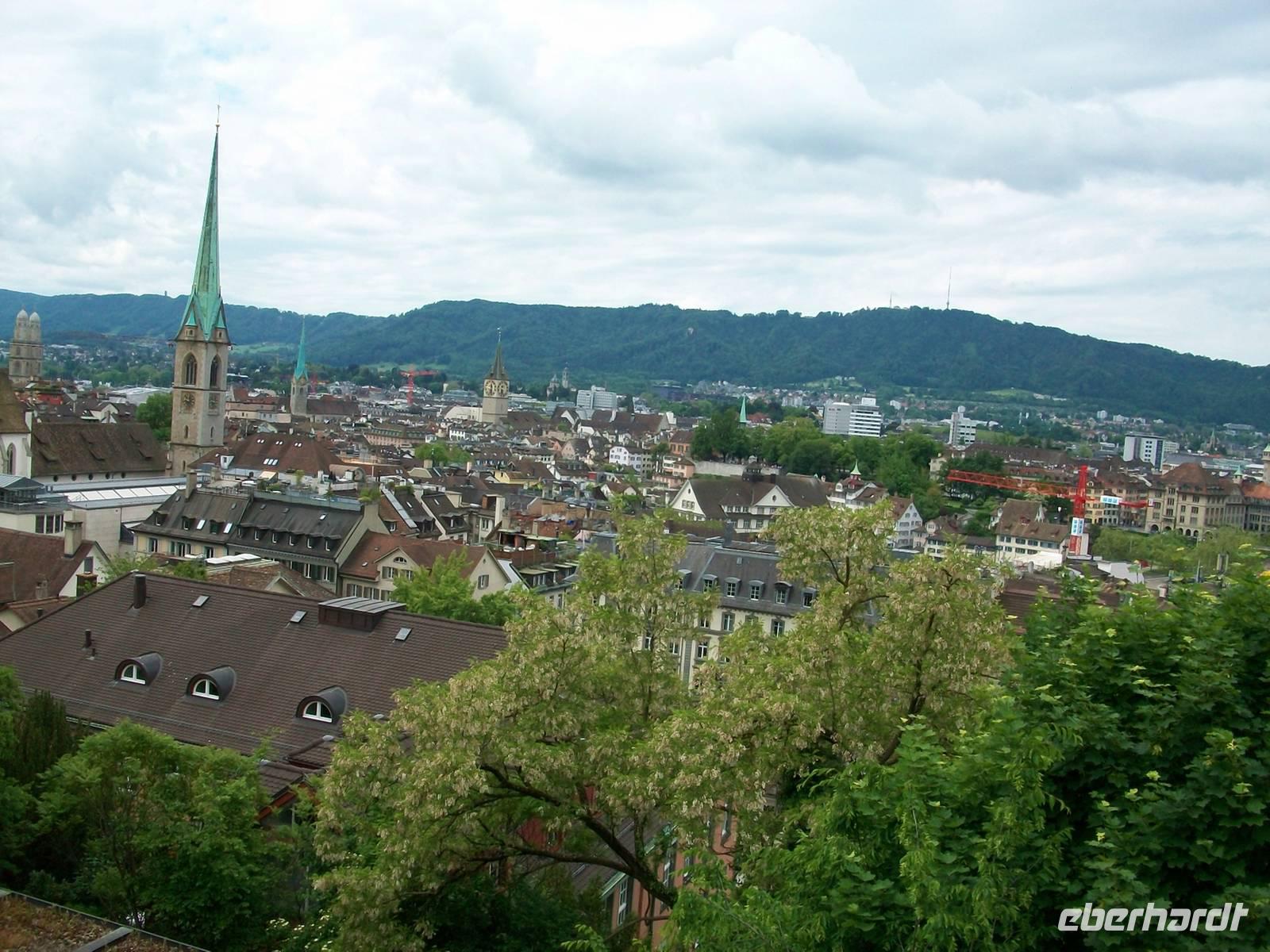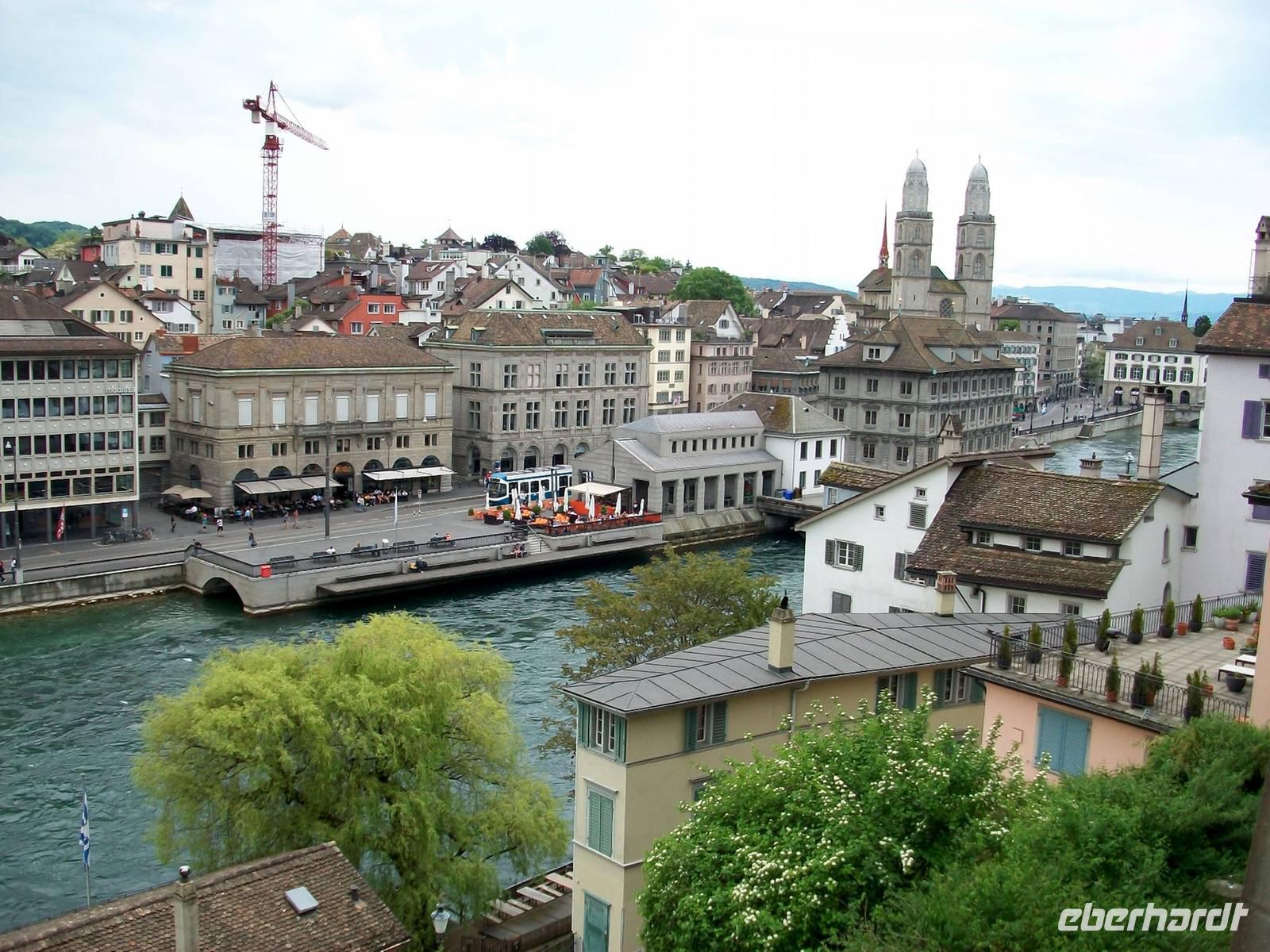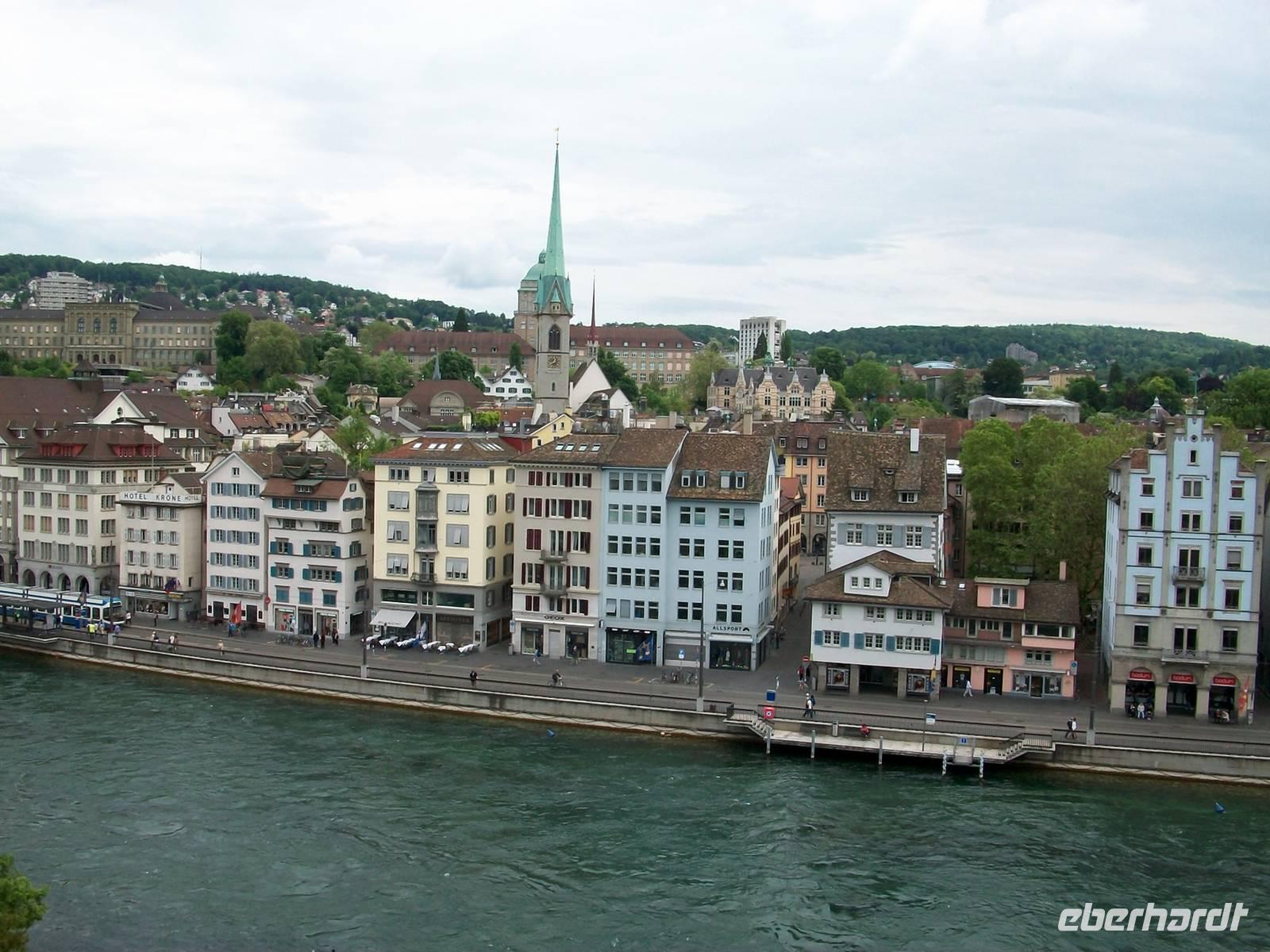 Dann geht es hinunter zum Fraumünster, hier endet die Rundfahrt. Nun beginnt ein kleiner Spaziergang durch den ältesten Teil der Stadt, vom Aussichtspunkt am Lindenhof haben wir einen schönen Blick auf diesen Teil der Stadt der von den zwei mächtigen Türmen des Großmünsters dominiert wird, hier predigte einst der Reformator Zwingli.