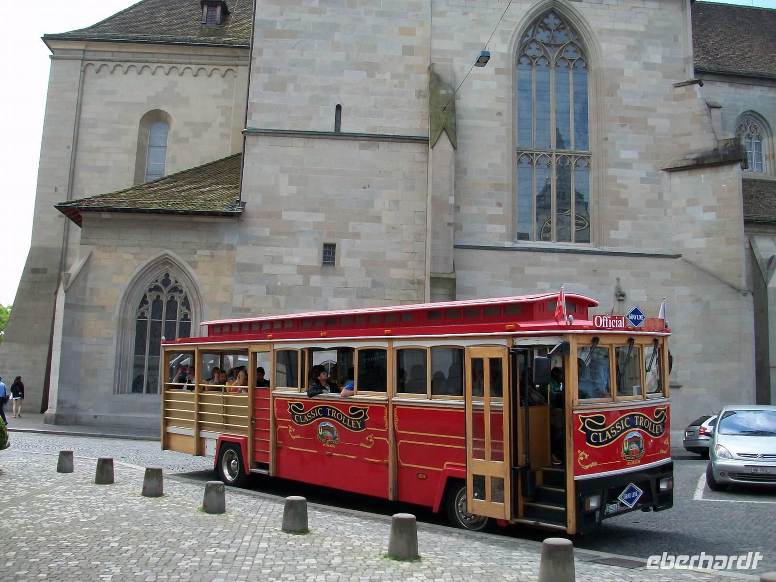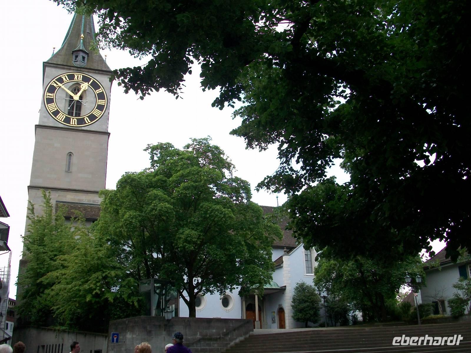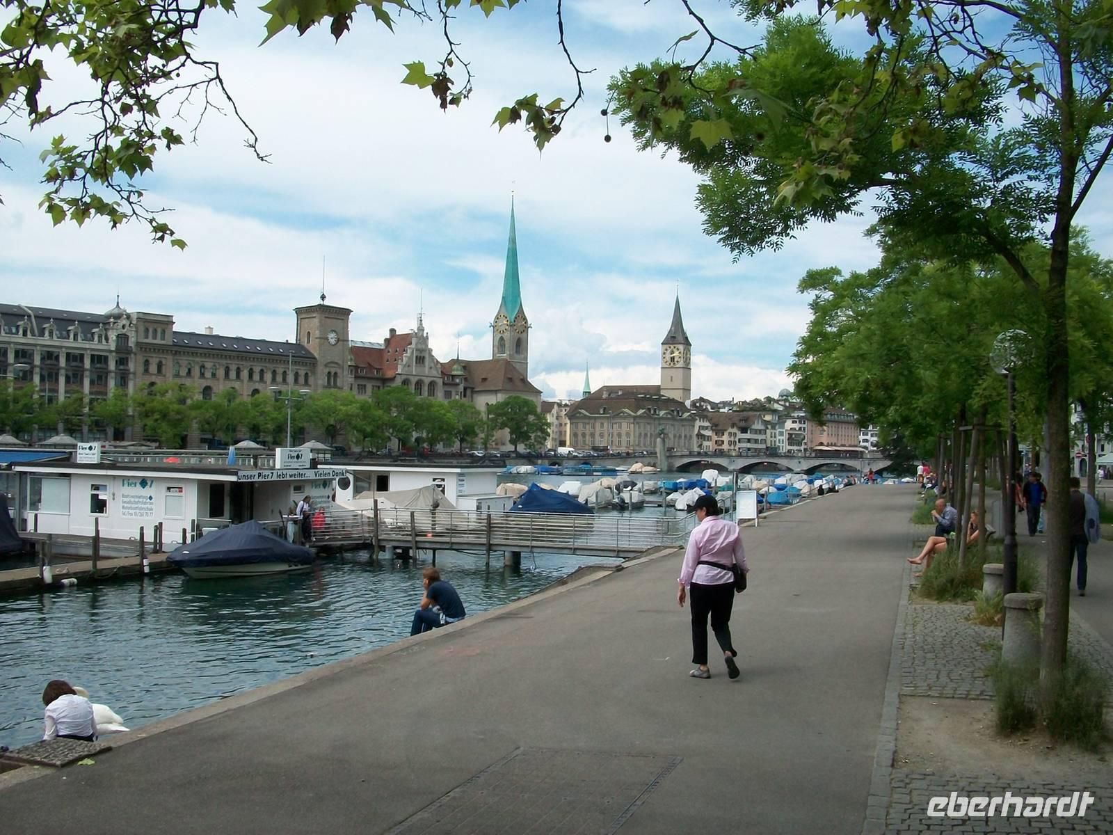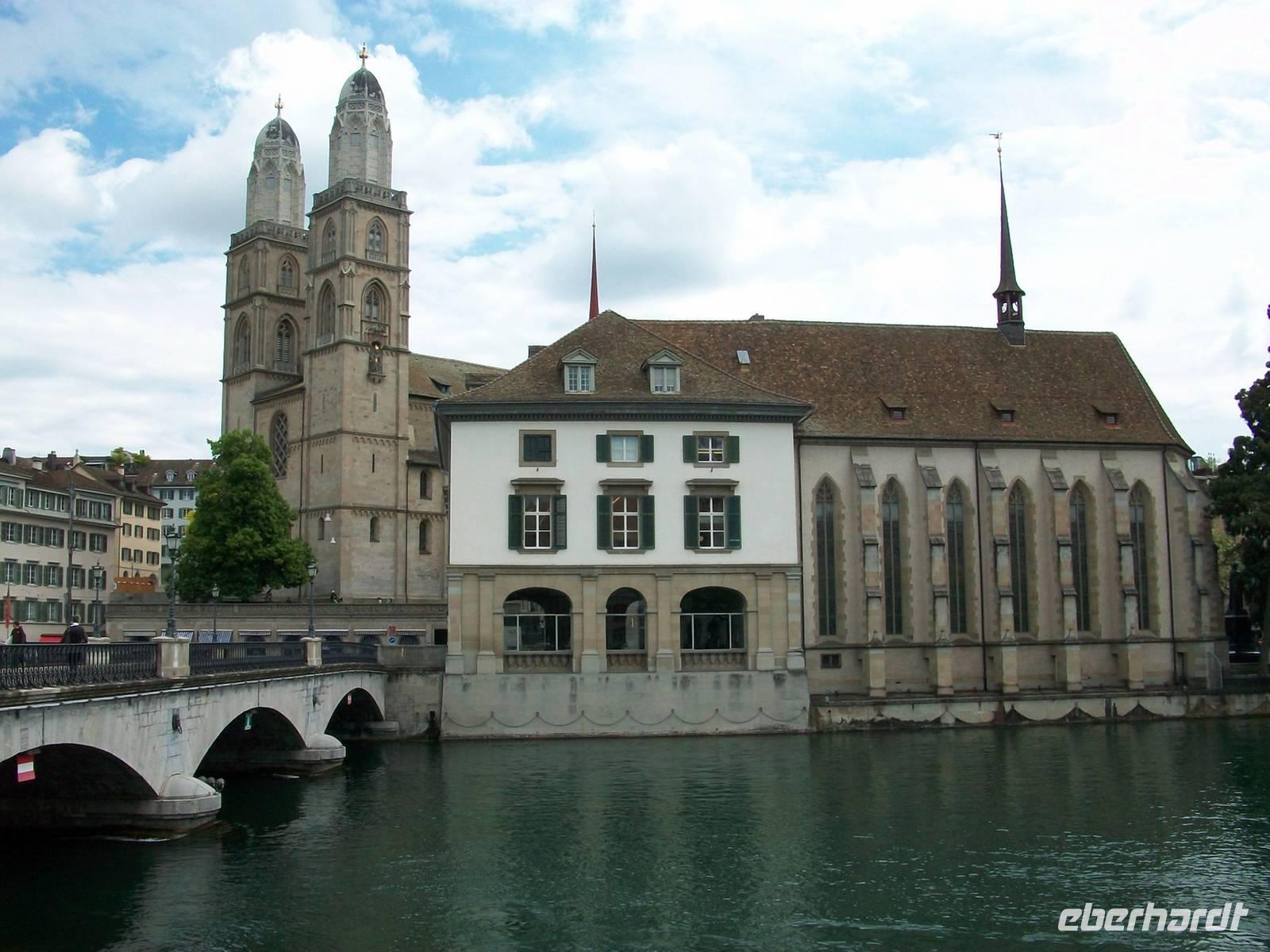 Dann geht es hinunter zum Fraumünster, hier endet die Rundfahrt. Nun beginnt ein kleiner Spaziergang durch den ältesten Teil der Stadt, vom Aussichtspunkt am Lindenhof haben wir einen schönen Blick auf diesen Teil der Stadt der von den zwei mächtigen Türmen des Großmünsters dominiert wird, hier predigte einst der Reformator Zwingli.
