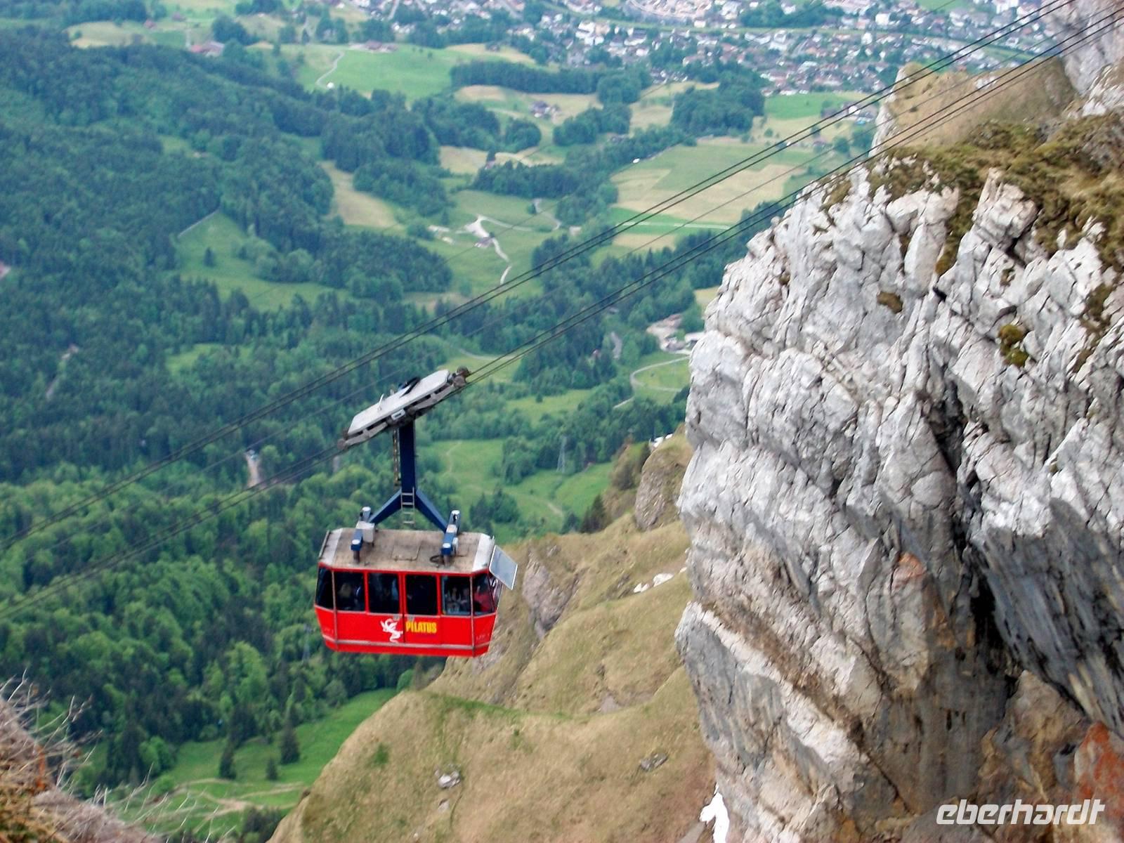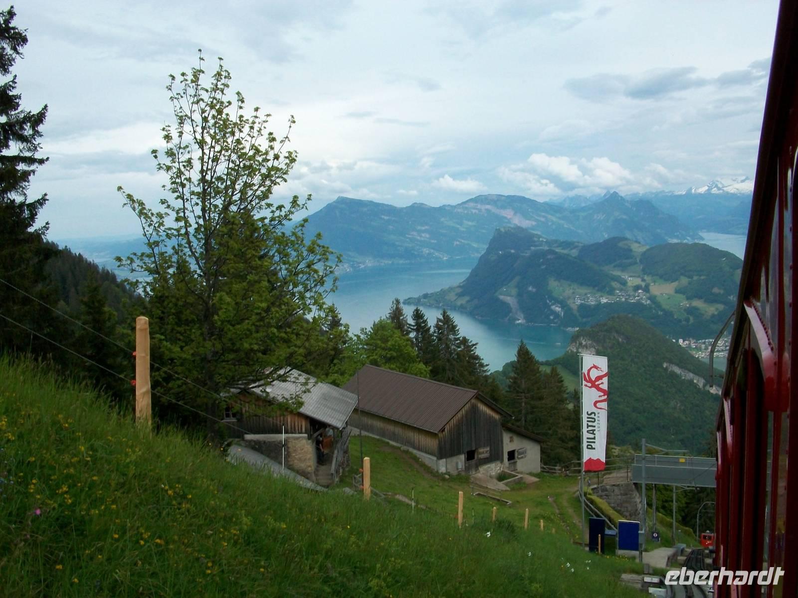 10.6.2013. Das angekündigte Tief zieht in der Nacht über uns hinweg und bringt am Morgen hier auf dem Pilatus erst mal dicken Nebel. Wir sind in den Wolken, auch als wir uns gegen zehn alle wieder treffen; nun geht es mit der Luftseilbahn erst einmal hinunter nach Kriens und von dort mit dem Bus nach Luzern. Die bange Frage für heute ist: wie wird das Wetter als wir inmitten dicker Wolken die Kabine der Seilbahn betreten?