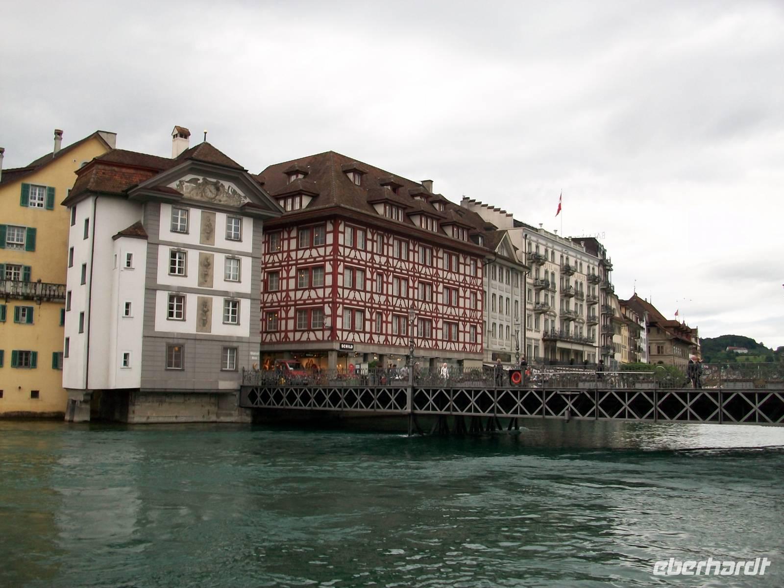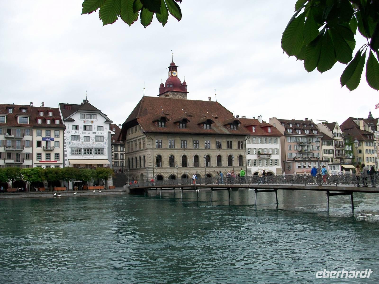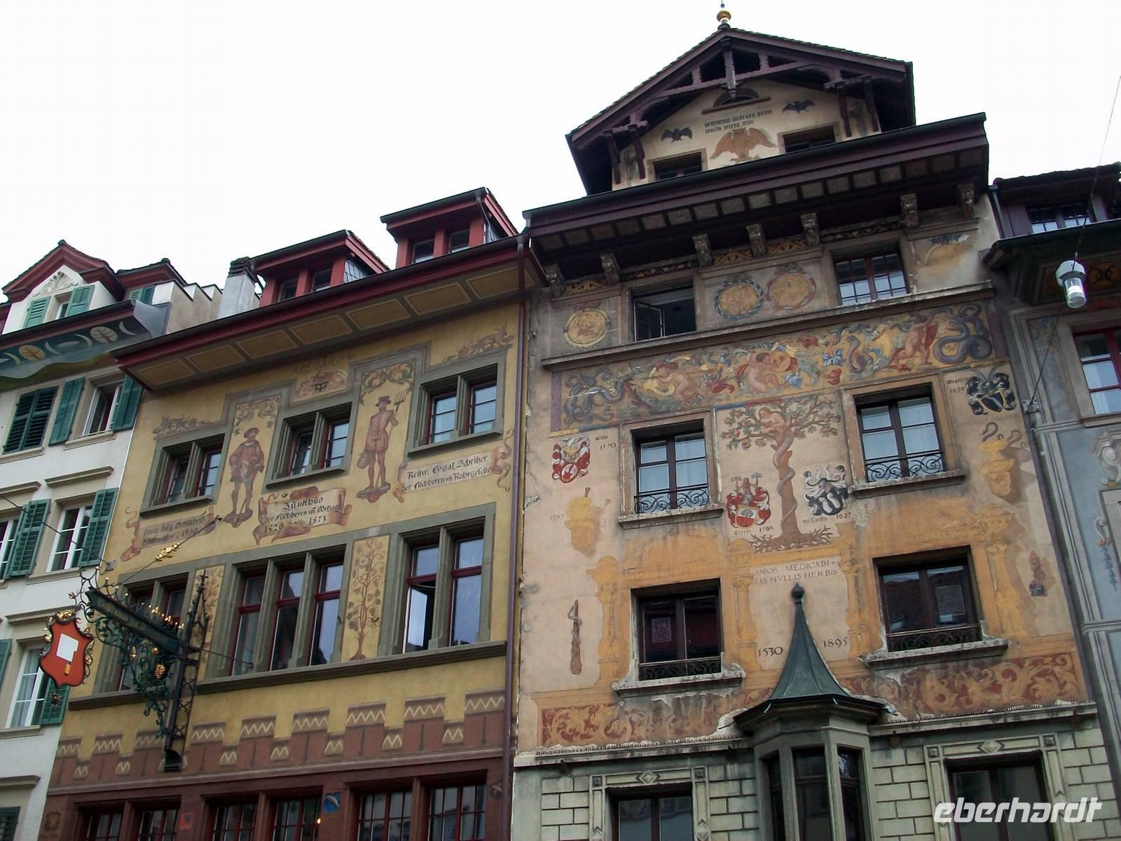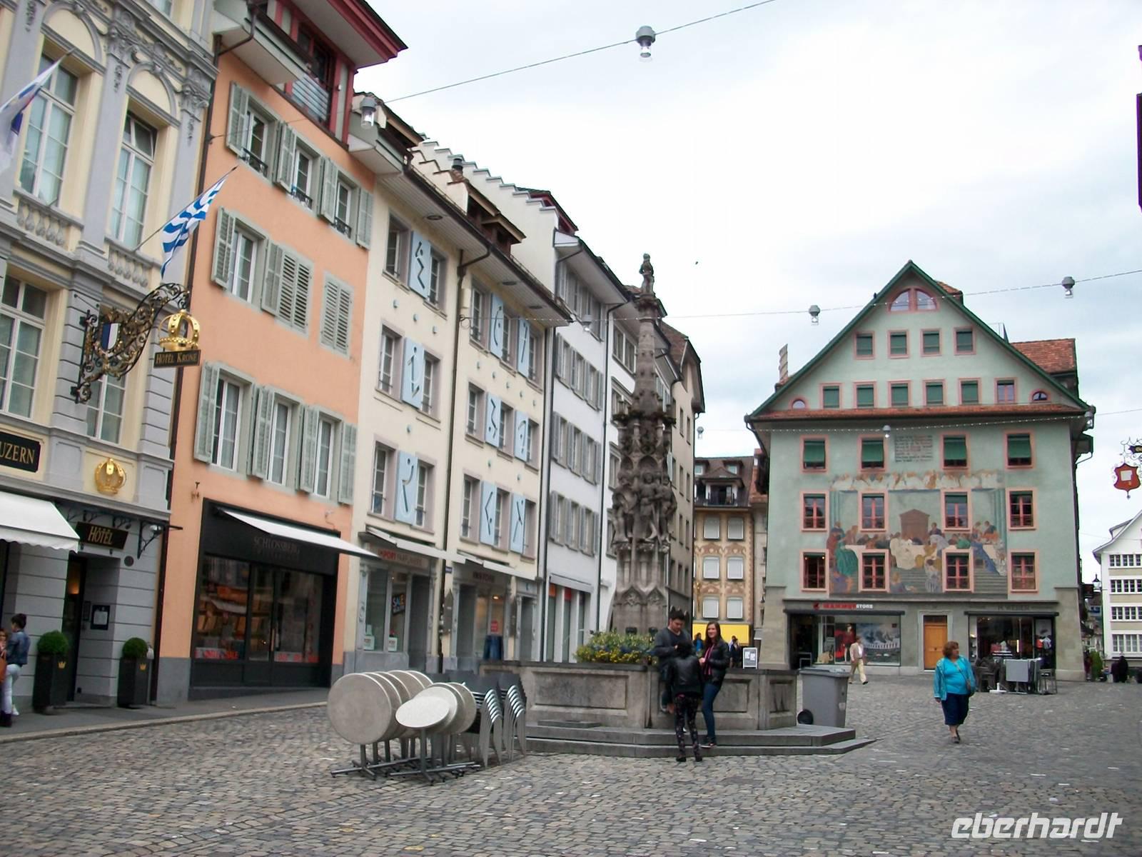 Quer über die Reuss verläuft die Kapellbrücke, sie war einst Teil der Stadtbefestigung. Interessant sind die Geschichten die unsere Führerin hierzu erzählen kann. Am anderen Ufer angelangt, schauen wir in die schmuckvolle Jesuitenkirche hinein und sind dann bald wieder in der Altstadt unterwegs. Die Häuser tragen zum Teil einen schönen Freskenschmuck und immer durch schmale Gassen und schöne Plätze verläuft unser Rundgang.
