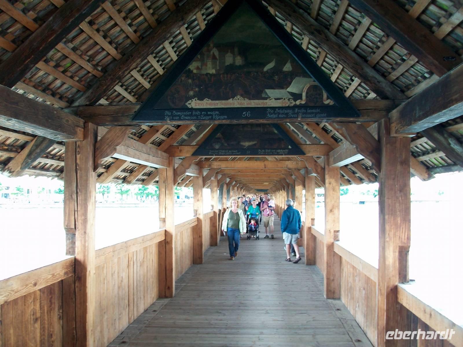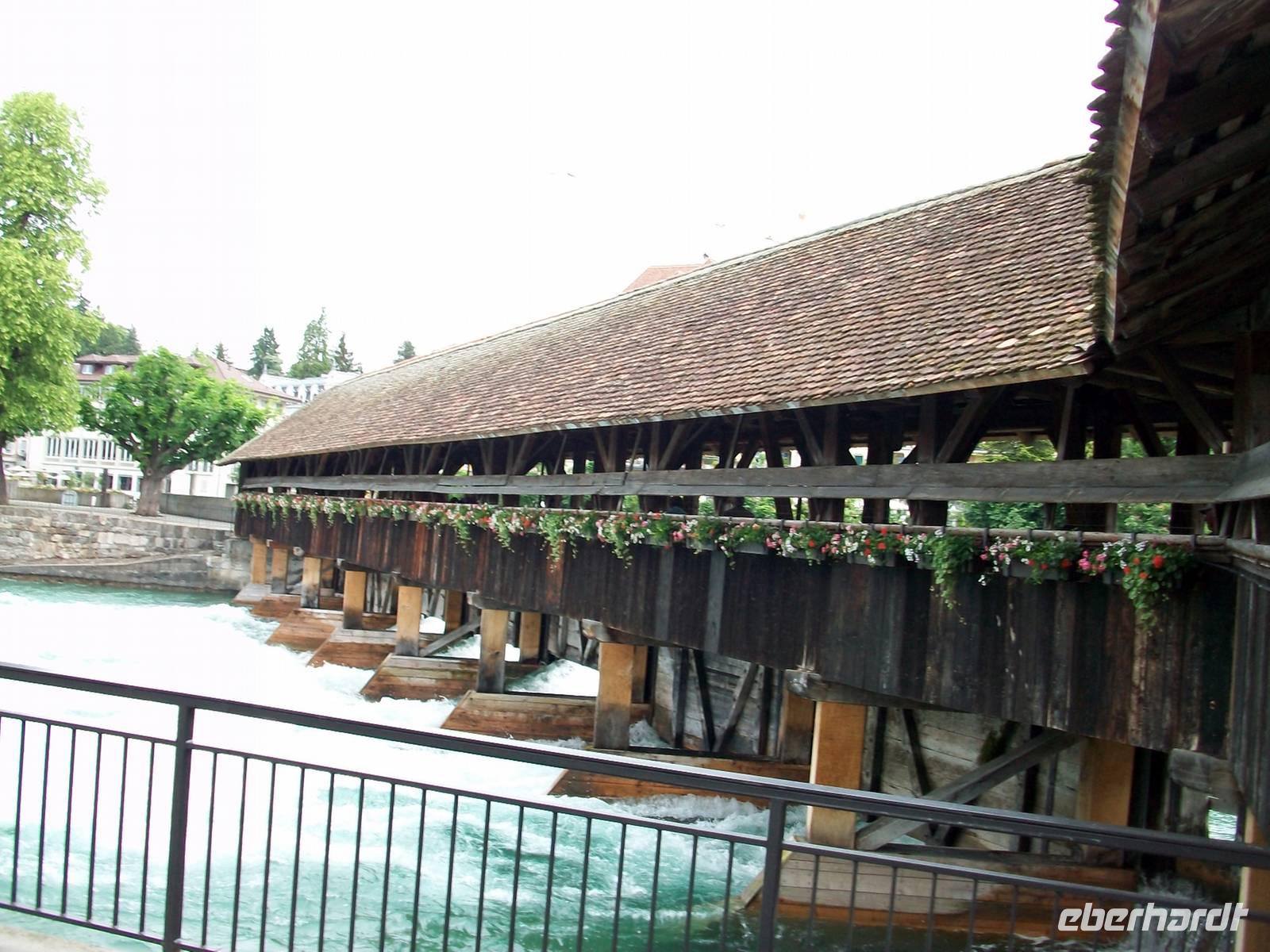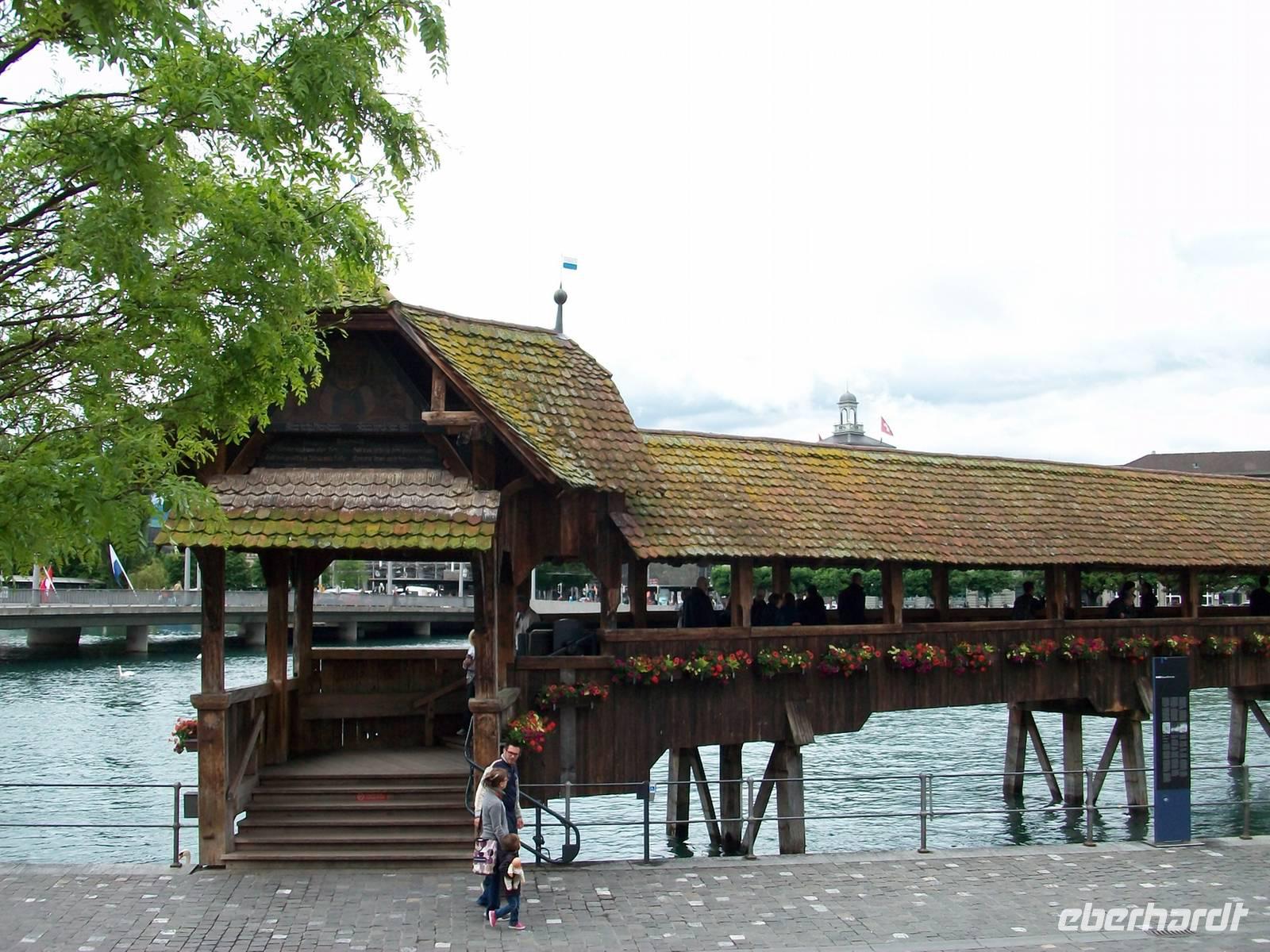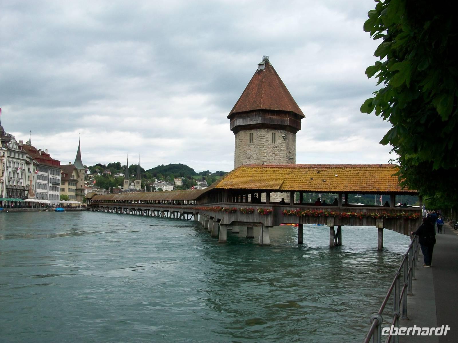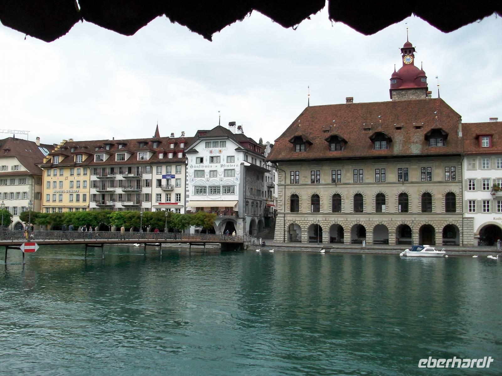 Quer über die Reuss verläuft die Kapellbrücke, sie war einst Teil der Stadtbefestigung. Interessant sind die Geschichten die unsere Führerin hierzu erzählen kann. Am anderen Ufer angelangt, schauen wir in die schmuckvolle Jesuitenkirche hinein und sind dann bald wieder in der Altstadt unterwegs. Die Häuser tragen zum Teil einen schönen Freskenschmuck und immer durch schmale Gassen und schöne Plätze verläuft unser Rundgang.