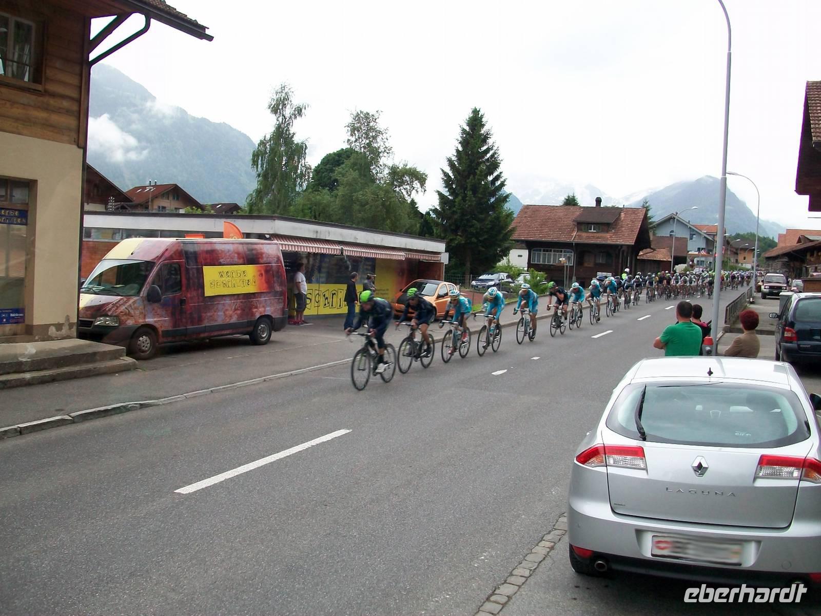 Kurz nach drei verlassen wir Luzern, der Weg führt uns nun bergauf zum Brünigpass. Wir gelangen am Sarner- und Lungernsee vorbei hinauf auf gut tausend Meter, hier sind wir nun im Berner Oberland angekommen. Schon von oben sehen wir die Aare und den Brienzer See. Entlang seines nördlichen Ufers führt uns die romantische Fahrt in Richtung Interlaken, unserem heutigen Ziel. Dann kommen uns Motorradfahrer entgegen, es sind Polizisten die uns zum Parken animieren. Bald wissen wir auch den Grund: uns kommen die Sportler der „Tour de Suisse" entgegen; es ist das wichtigste Radrennen der Schweiz und wir sitzen im Bus dabei sozusagen in der ersten Reihe. Mit einem Rauschen kommt uns das Hauptfeld entgegen und man konnte gar nicht schnell genug schauen, so schnell waren die Sportler vorüber.