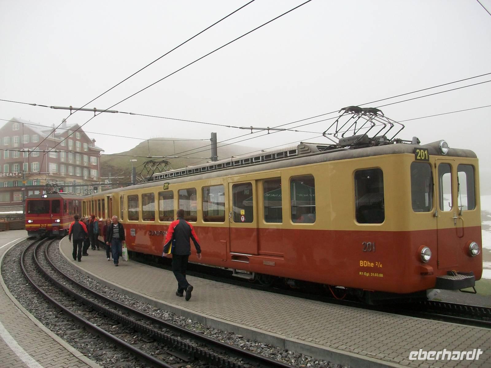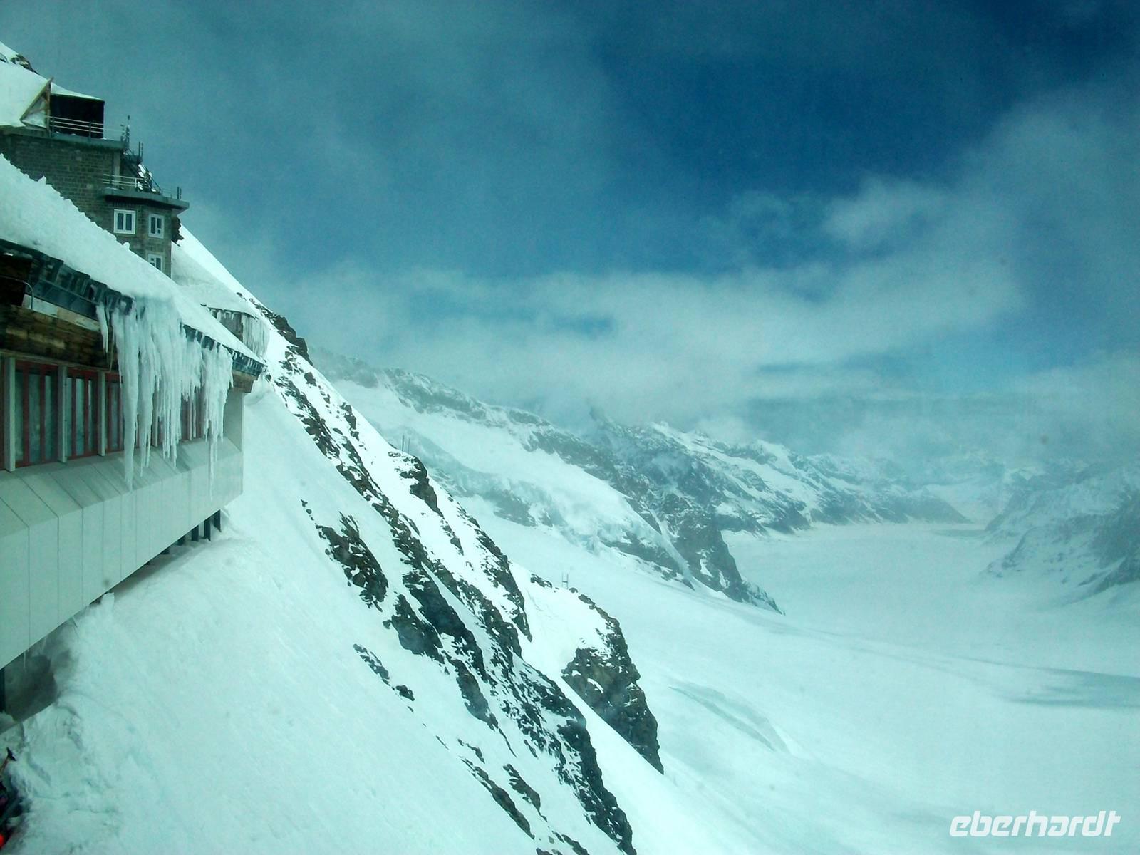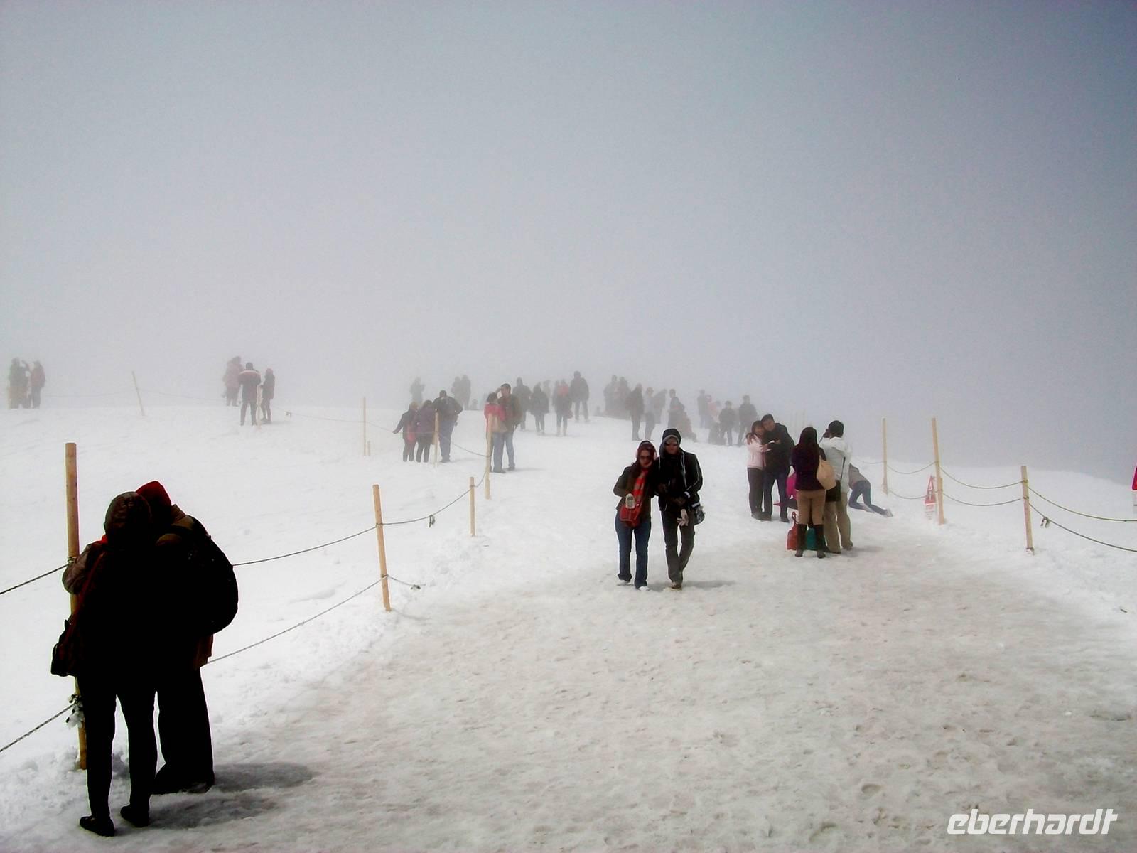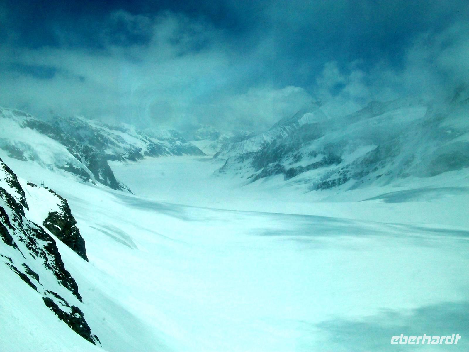 Hier steigen wir nun in den für uns reservierten Wagen ein, pünktlich 10.05 Uhr starten wir und sind bald im Tal der Lütschine unterwegs. Vor uns tauchen schon die ersten Wolkenlücken auf und kurz vor Grindelwald werfen wir einen ersten Blick auf das sonnenbeschienene Jungfraugebiet. In diesem Ort wechseln wir nun den Zug, er wird uns zur Kleinen Scheidegg bringen; ziemlich rasch ändert sich aber die Sicht und wir sind im wabernden Gebräu der Wolken verschwunden. Ein Aufenthalt zum Akklimatisieren, und dann geht es die letzte Etappe empor zum Jungfraujoch. Bald sind wir im Berg verschwunden, die Fahrt verläuft unterirdisch und als wir oben anlangen sind wir auf rund 3 500 Metern über dem Meeresspiegel. Wir gelangen zur großen Halle und haben auch kurz einen Blick auf die hochalpine Schneewelt über die sich ein dunkelblauer Himmel gespannt hat, dabei gießt die Sonne ihre goldenen Strahlen über das glitzernde Weiß aus. Doch von einem zum anderen Augenblick hat sich eine Wolke in den Berg geschoben und taucht alles leider viel zu schnell in undurchdringlichen Nebel. Dabei wird es heute auch bleiben, die sonnigen Abschnitte sind kurz, aber sie kommen, und wer Geduld hat kann dennoch phantastische Bilder schießen.