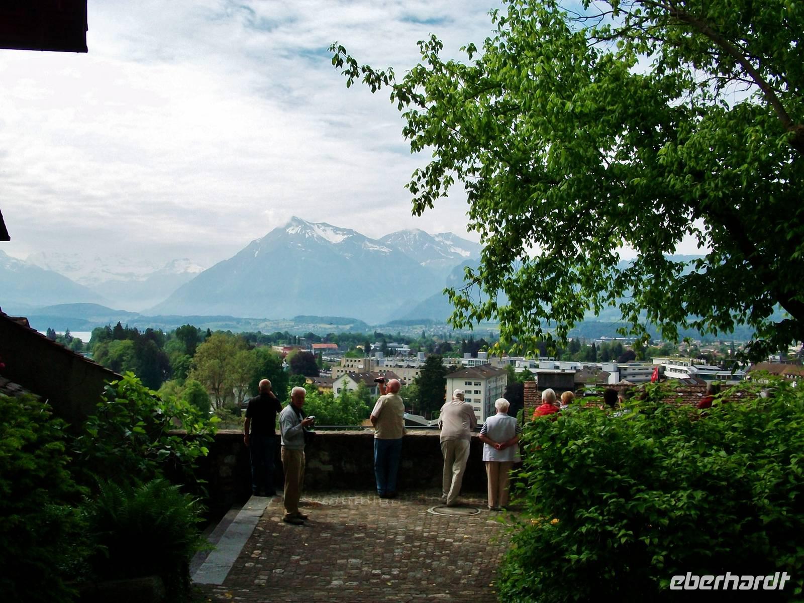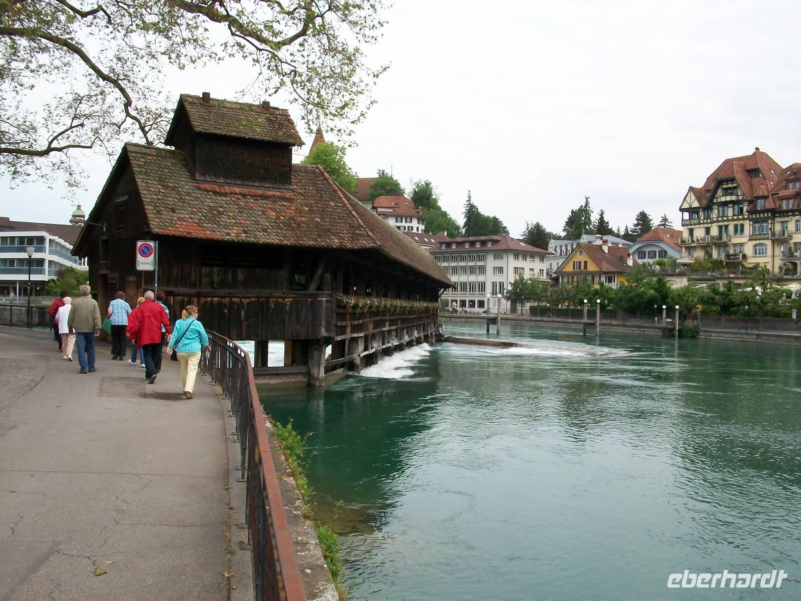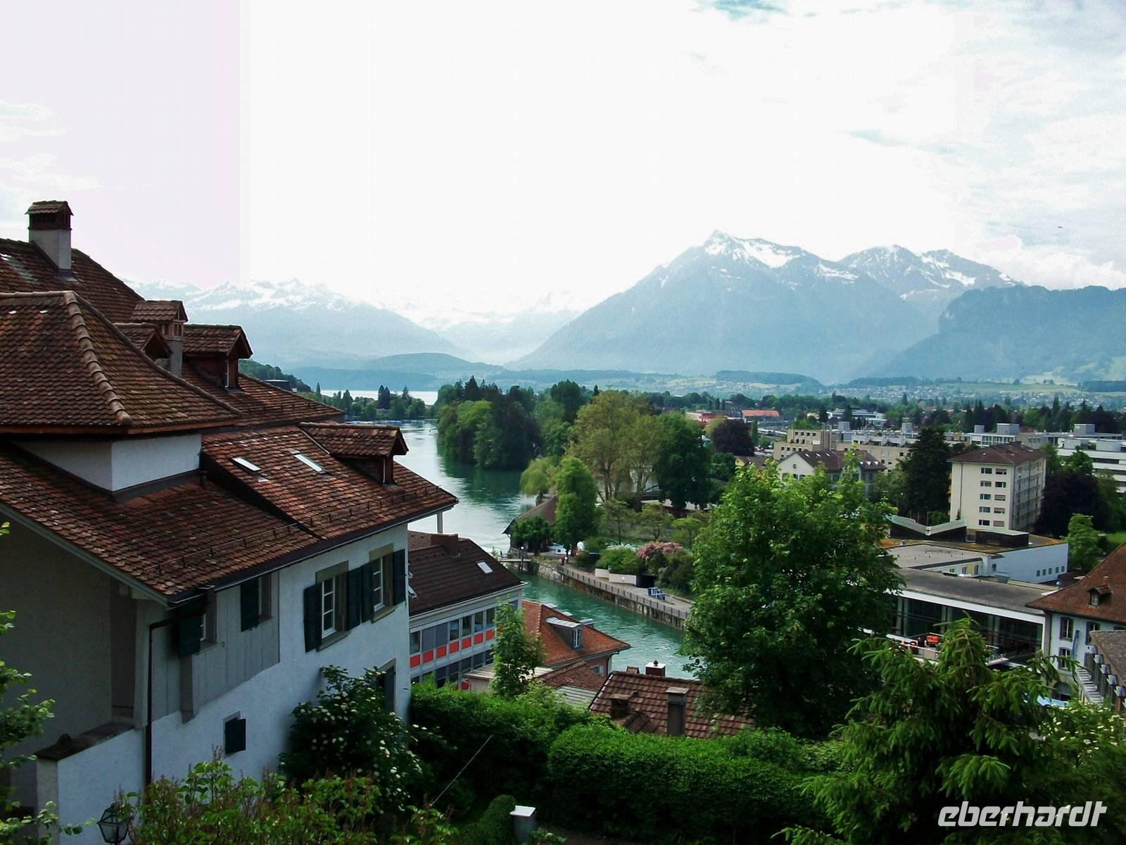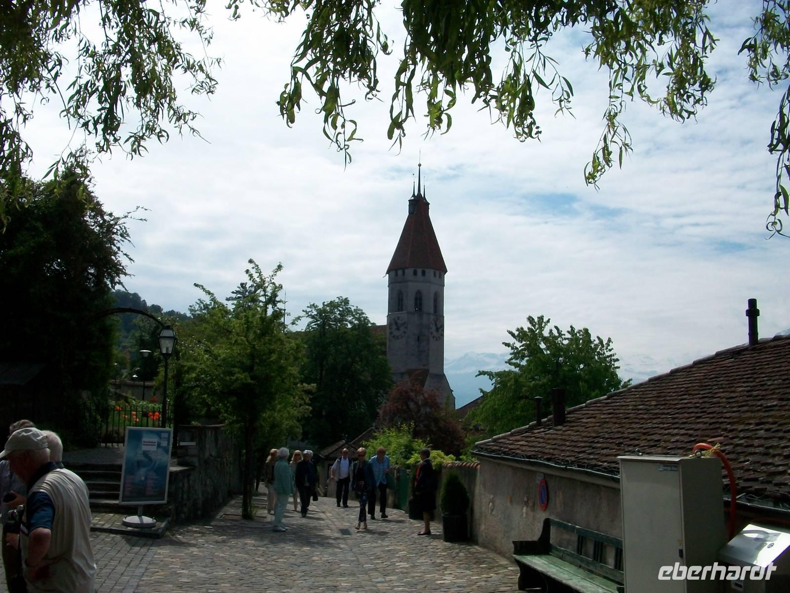 Die Fahrt führt uns entlang der Süduferstraße, bald öffnet sich der Einschnitt zum Kandertal und über allen thront die Riesenpyramide des Berges Niesen. Pünktlich kommen wir in Thun an, unsere Führerin Frau Mettler, ist auch schon da und nun kann sie beginnen, die schöne wie stimmungsvolle Tour durch Thun. Diese Stadt wird durchflossen von der Aare die hier den Thuner See verlässt und ihre grünen Fluten in weitem Bogen der Bundeshauptstadt Bern zusendet.