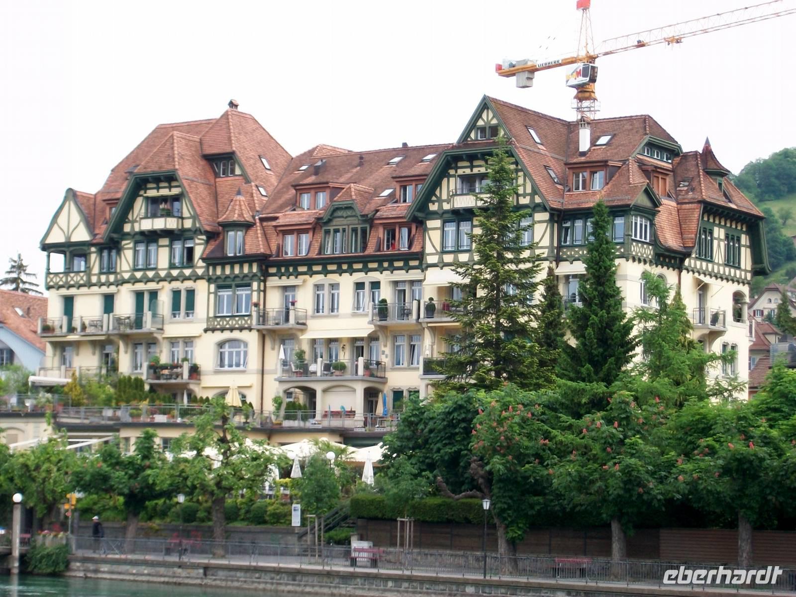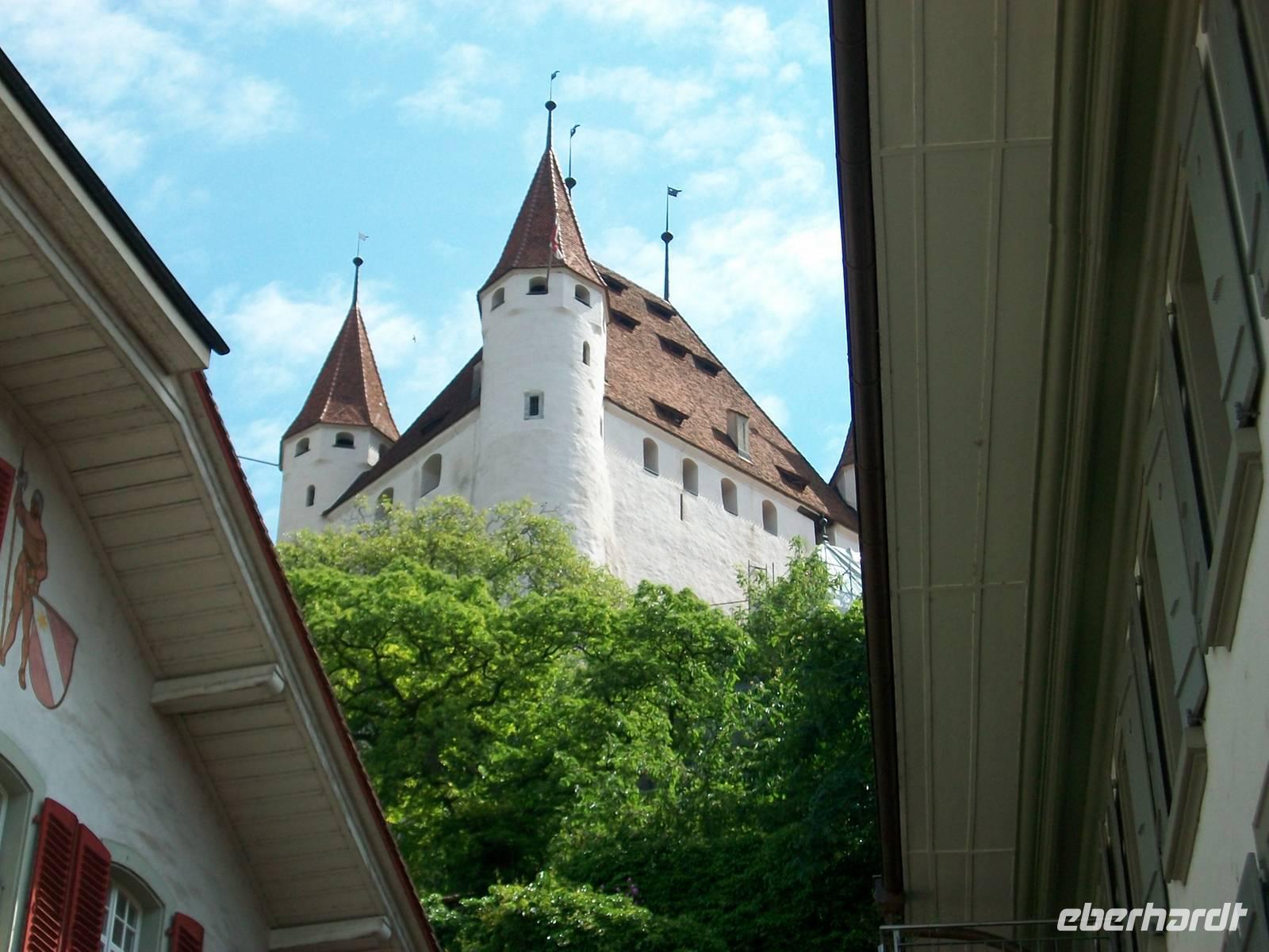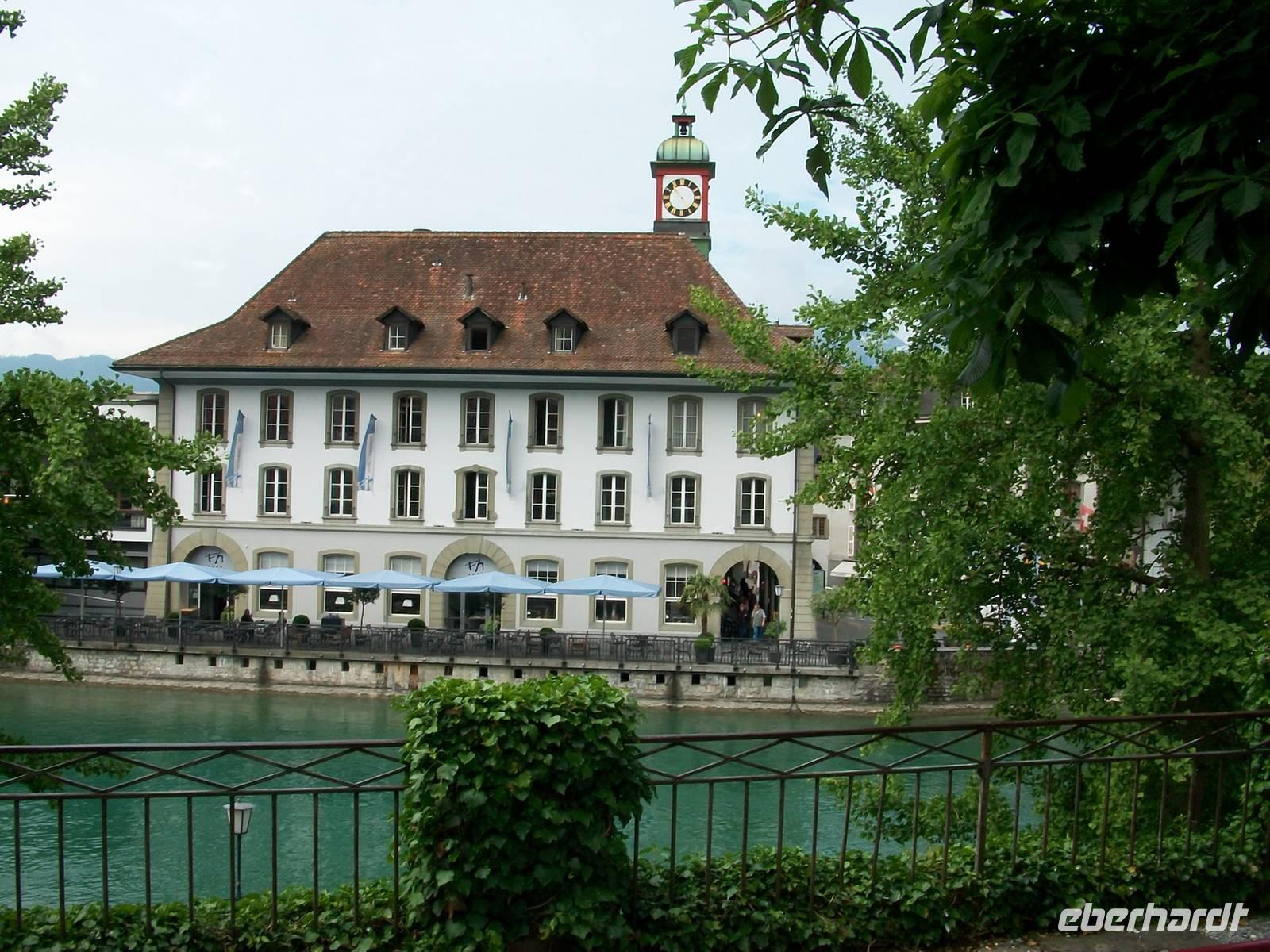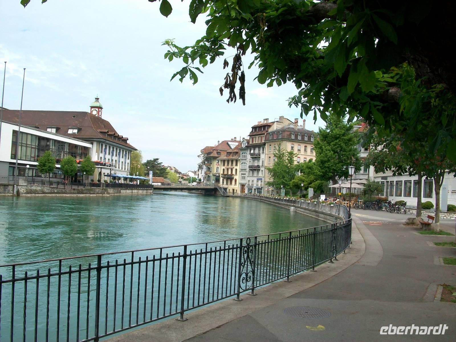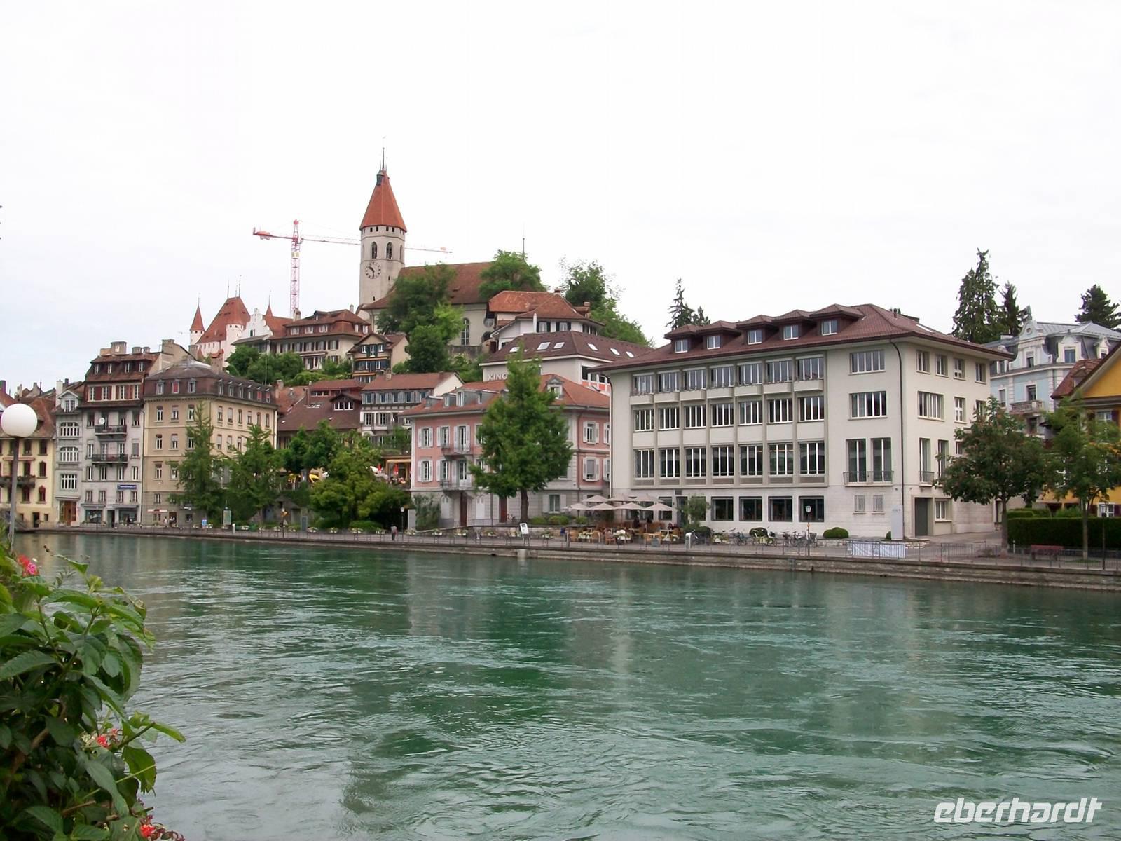 Die Fahrt führt uns entlang der Süduferstraße, bald öffnet sich der Einschnitt zum Kandertal und über allen thront die Riesenpyramide des Berges Niesen. Pünktlich kommen wir in Thun an, unsere Führerin Frau Mettler, ist auch schon da und nun kann sie beginnen, die schöne wie stimmungsvolle Tour durch Thun. Diese Stadt wird durchflossen von der Aare die hier den Thuner See verlässt und ihre grünen Fluten in weitem Bogen der Bundeshauptstadt Bern zusendet.