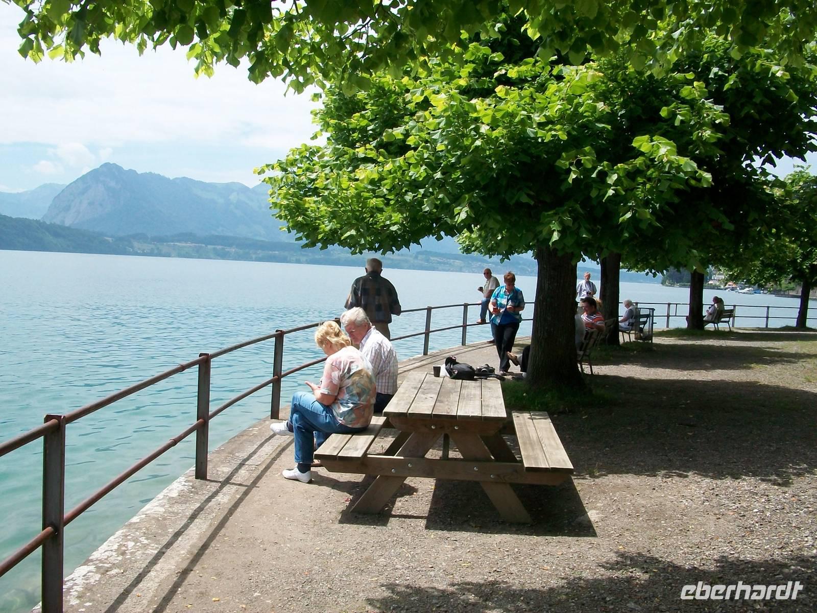 Die Rückfahrt nehmen wir über die Norduferstraße des Thuner Sees, hier ist es besonders romantisch. An einem schönen Plätzchen, mit Bänken am See, legen wir eine Kaffeepause ein und können bei einem kleinem Snack einen weiten Blick werfen auf den malerischen See, der umgeben ist von den Bergen des Berner Oberlandes. Dabei verwöhnen uns die warmen Strahlen der Nachmittagssonne, sie werfen ein schimmerndes Glitzern auf das Wasser.