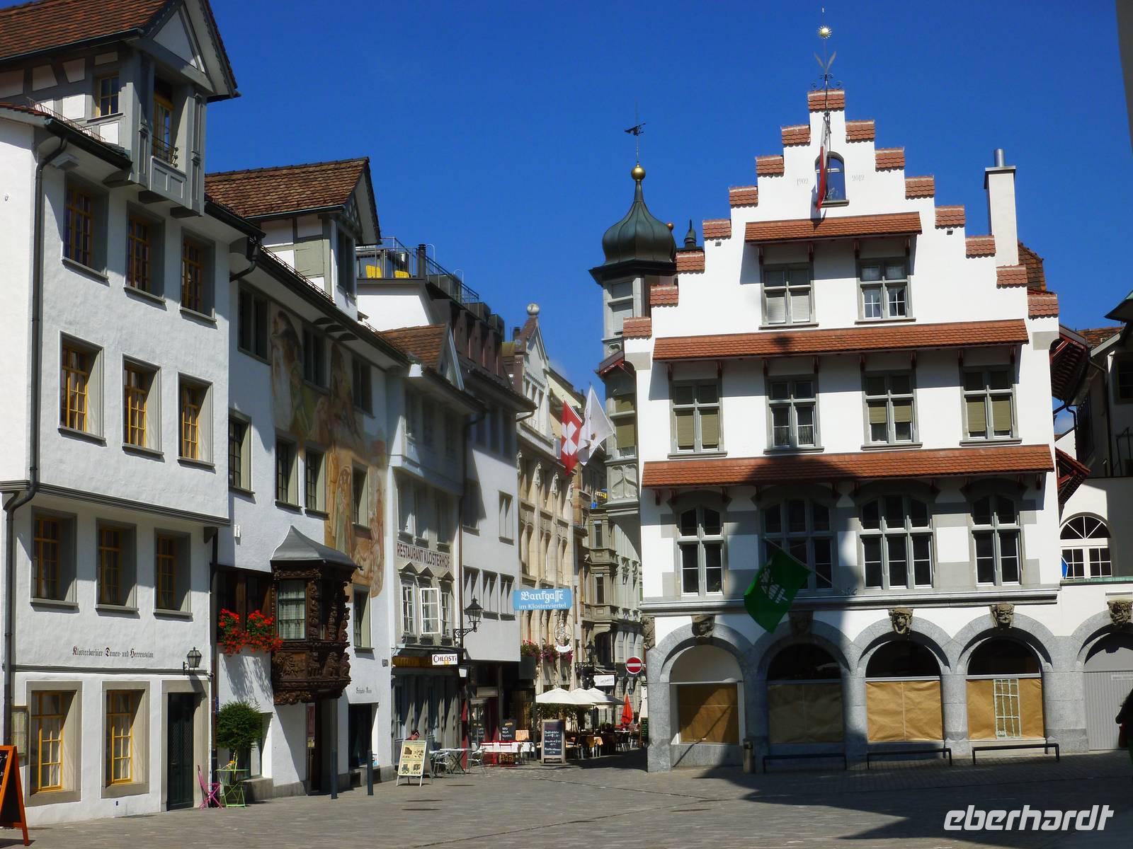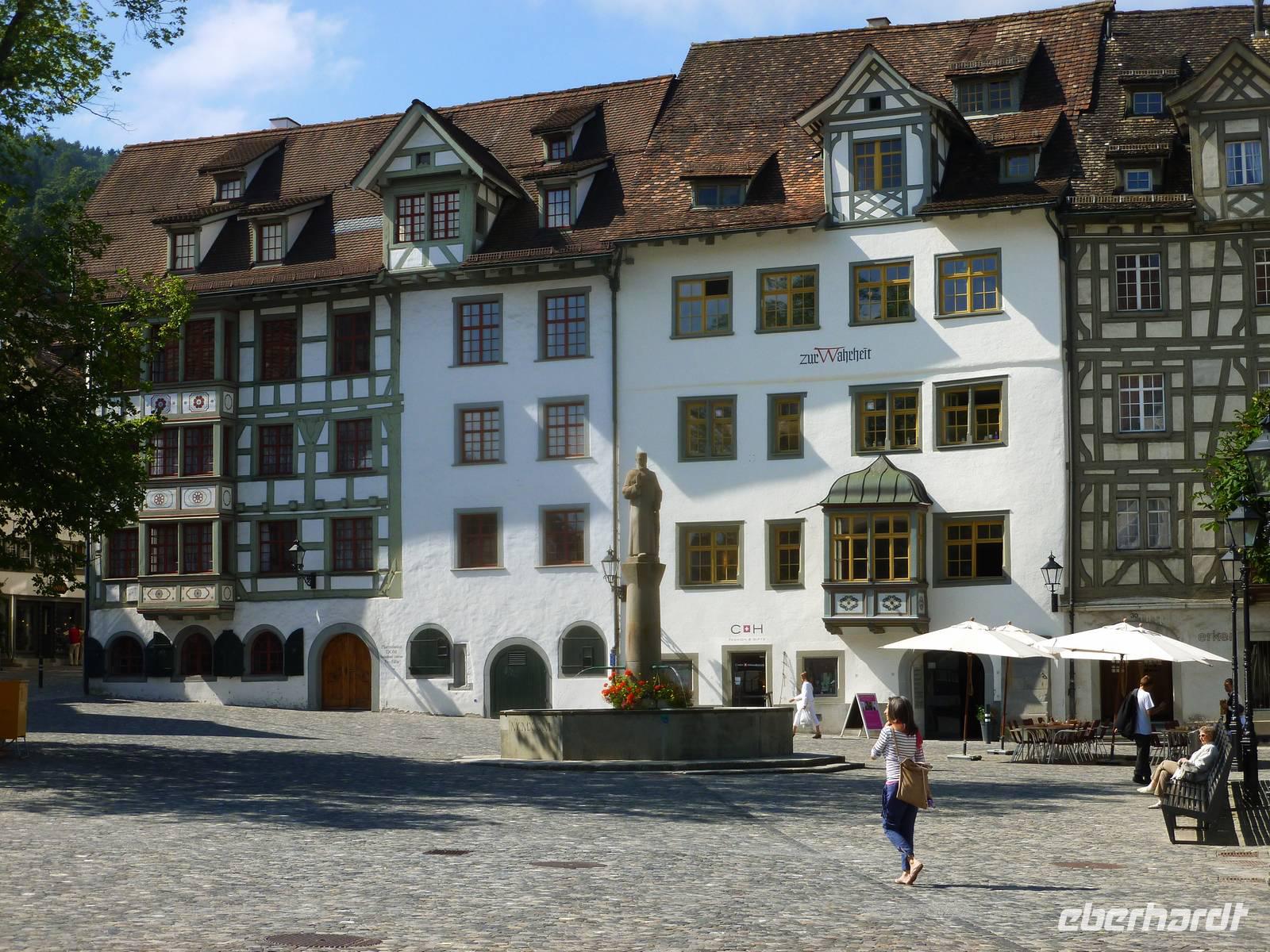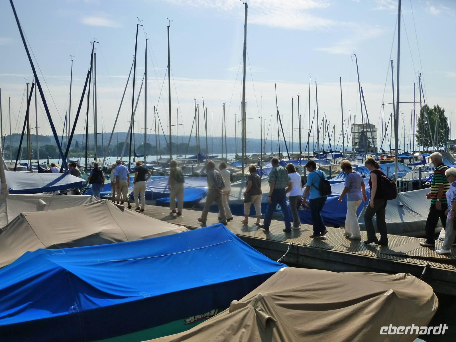 Nach einer erholsamen Nacht auf der Schwägalp unternahmen wir unseren ersten Tagesausflug. Am Vormittag ging es erst einmal in das nur etwa 35 Kilometer entfernte St. Gallen. Die Stadt liegt südwestlich vom Bodensee in einem schmalen Hochtal der Voralpen und ist sowohl der wirtschaftliche Mittelpunkt als auch das kulturelle Zentrum der Nordostschweiz. Im 7. Jahrhundert gründete hier der irische Wandermönch Gallus eine Einsiedelei. Aus dieser entstand dann Anfang des 8. Jahrhunderts ein Kloster und bald darauf unter dem Abt Otmar die Benediktinerabtei, die vom 9. bis zum 11. Jahrhundert eine Hochblüte erlebte und durch Schule und Bibliothek zu einem der kulturellen Höhepunkte nördlich der Alpen wurde. Aus einer um das Kloster entstandenen Handwerkersiedlung entwickelte sich letztendlich die Stadt. Wir erlebten eine Stadtführung und erfuhren hier natürlich viel über die Stadtgeschichte. Besonders beeindruckend war für die meisten von uns der Besuch der berühmten Stiftsbibliothek, die eine bemerkenswerte Innenarchitektur und überaus reichhaltige Bücherbestände aufweist. Am frühen Nachmittag erreichten wir dann die Gegend nördlich von St. Gallen - nämlich den Bodensee. Unseren ersten Stopp legten wir in der Nähe von Altenrhein ein. Dort befindet sich nämlich die herrliche Hundertwasser-Markthalle, die wir selbstverständlich sehen mussten. Am südlichen Bodensee-Ufer entlang und somit über Rorschach erreichen wir das kleine Städtchen Arbon. Arbon weist eine Reihe von Sehenswürdigkeiten auf. Besonders die Altstadt, mit ihren mannigfaltig verwinkelten Gassen, hält einiges an mittelalterlicher Geschichte Arbons präsent. Die Gebäude aus den umliegenden Quartieren stammen hauptsächlich aus der Zeit der Industrialisierung. Das Arboner Schloss mit Schlossturm gehört mit zu den bedeutendsten Sehenswürdigkeiten von Arbon und ist gleichzeitig ihr Wahrzeichen. Es handelt sich hierbei ursprünglich um eine Burg mit Bergfried. Der deutlich ältere Bergfried ist am grauen Gemäuer zu erkennen und stammt aus dem Jahr 993. Hier in Arbon schlenderten wir die Promenade entlang und genossen einfach das Flair des Bodensees. Nach einem erlebnisreichen Tag waren wir am frühen Abend auf der Schwägalp zurück. Einige von uns nutzten die Gelegenheit und unternahmen noch einen kleinen Spaziergang auf einem der zahlreichen markierten Wege.