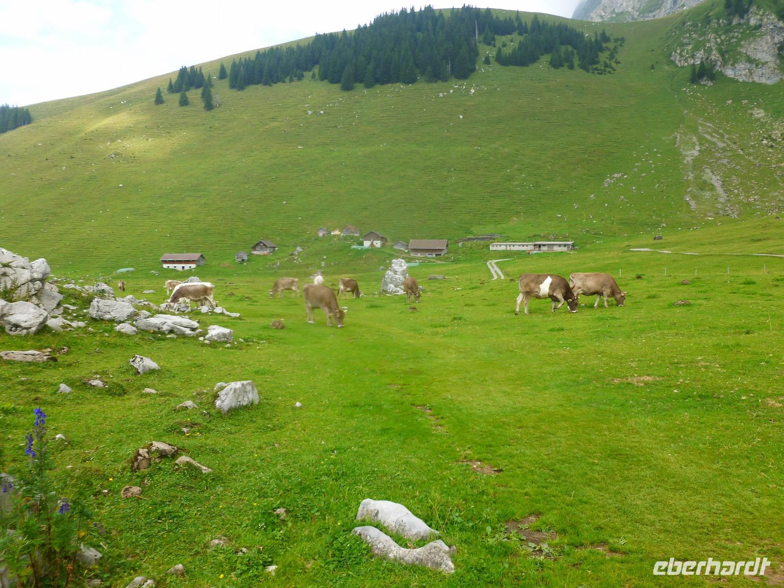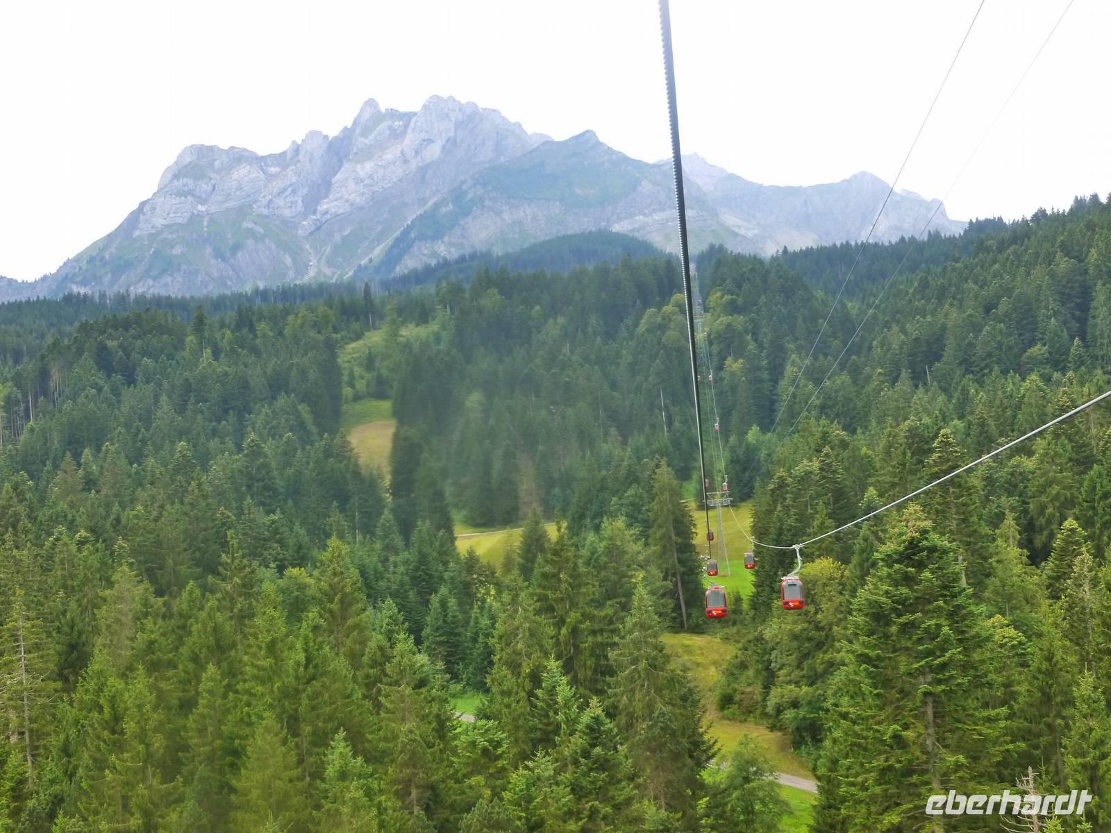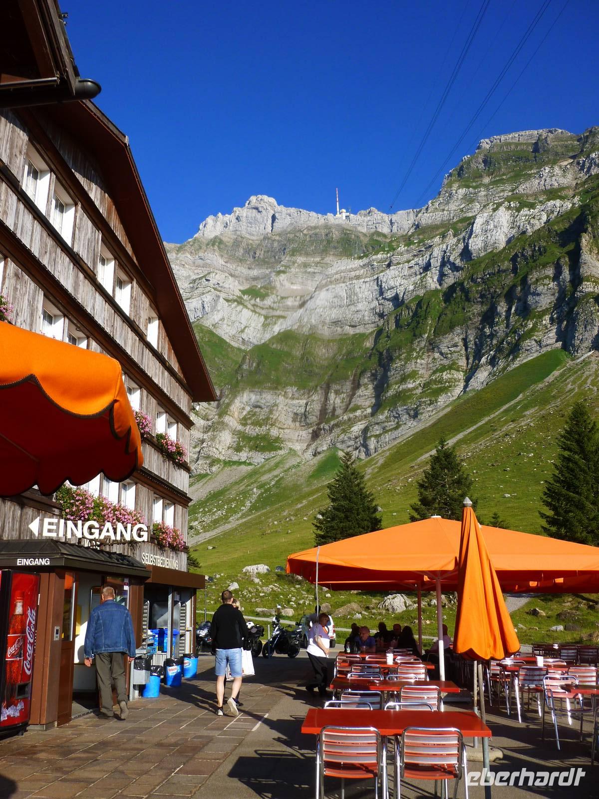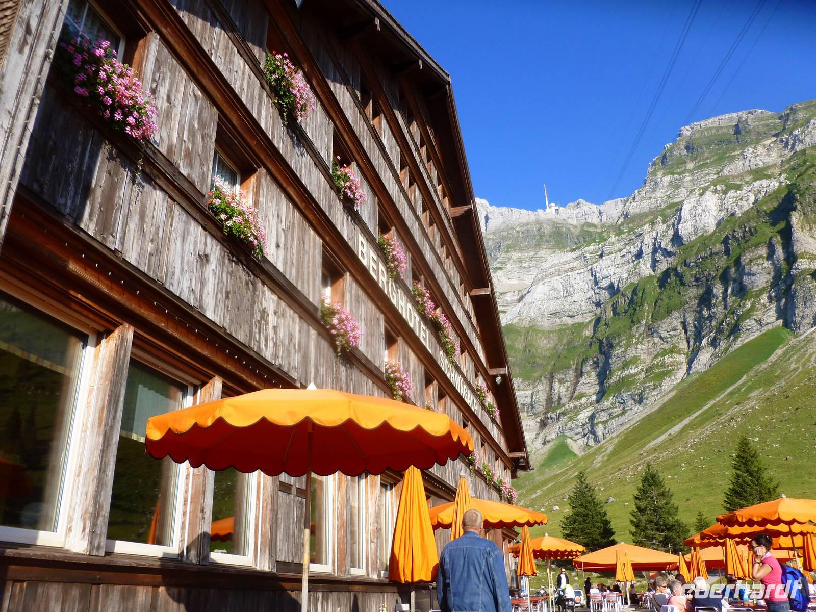 Aufgrund der knapp 700 Kilometer langen Fahrtstrecke von Dresden bis zur Schwägalp im Appenzeller Land ging es bereits um 6 Uhr in Dresden los. In der Nähe von Münchberg war unsere Reisegruppe mit insgesamt 37 Personen schließlich komplett. Die Fahrt führte uns nun weiter über Nürnberg, Feuchtwangen, Ulm, Memmingen und Lindau zum Bodensee. Das Wetter war optimal und so ging es für uns ein kleines Stück dem Bodensee entlang, bereits bei Lindau verließen wir somit die Autobahn. Doch leider gab es kurz nach der deutsch-österreichischen Grenze einen Mega-Stau und somit entschlossen wir uns kurzerhand, zurück auf die Autobahn und somit durch den 6,7 Kilometer langen Pfändertunnel zu fahren. Kurze Zeit später erreichten wir Höchst, den österreichischen Grenzort zur Schweiz und nur der Alte Rhein trennte uns nunmehr von St. Margarethen, dem schweizerischen Grenzort. Nach einer längeren Pause in St. Margarethen, hier können wir übrigens unsere Euros in Schweizer Franken umtauschen, brachen wir zu unserer letzten Etappe des heutigen Tages auf. Von hier war es jetzt nur noch ein Katzensprung zur Schwägalp. Wir wählten die Route über St. Gallen und Herisau, also fuhren wir das Appenzeller Land aus nördlicher Richtung an. Am frühen Abend erreichten wir schließlich unser Hotel für die nächsten drei Nächte - das Berghotel Schwägalp! Das Berghotel Schwägalp liegt auf einer Höhe von knapp 1.400 Metern und abseits von jeglichem Großstadtlärm. Die einzigen Nachbarn hier sind glückliche Schweizer Kühe!