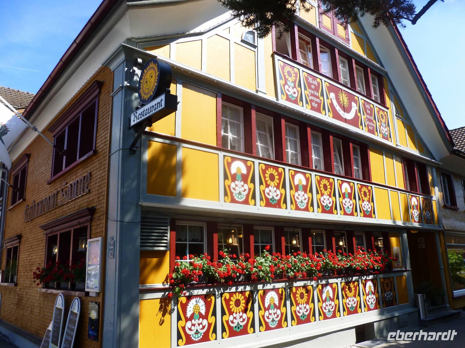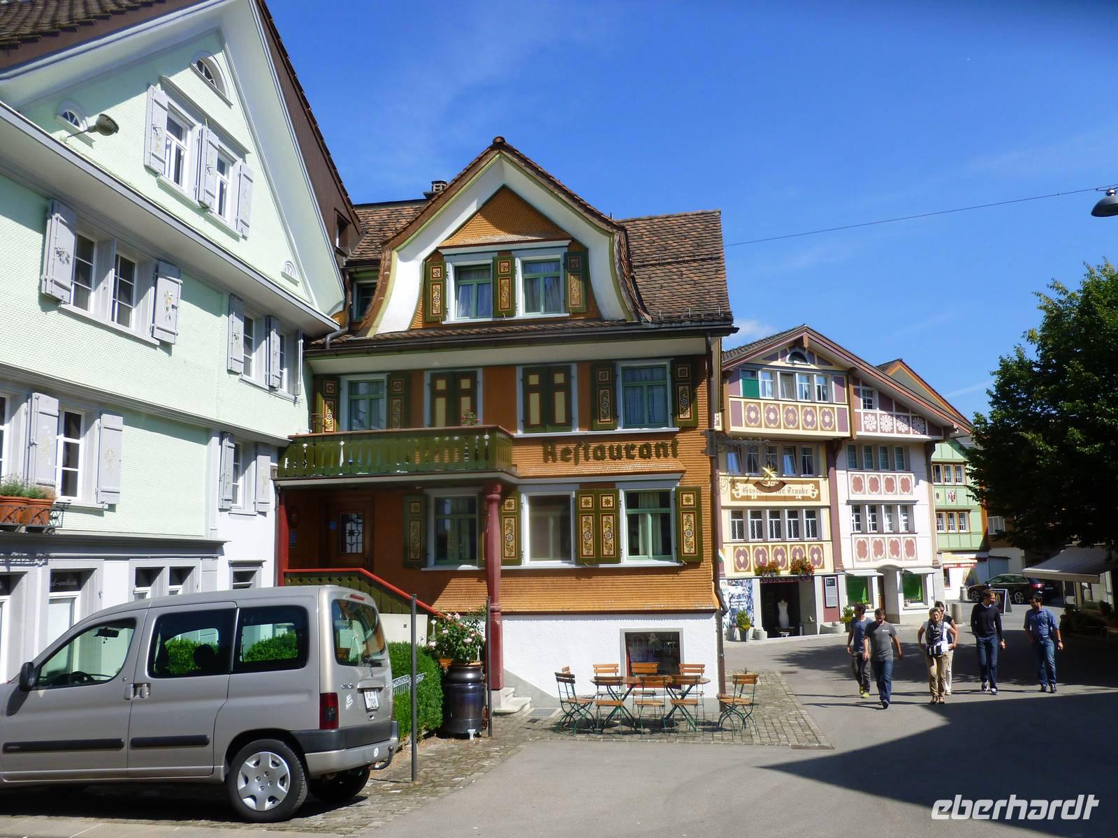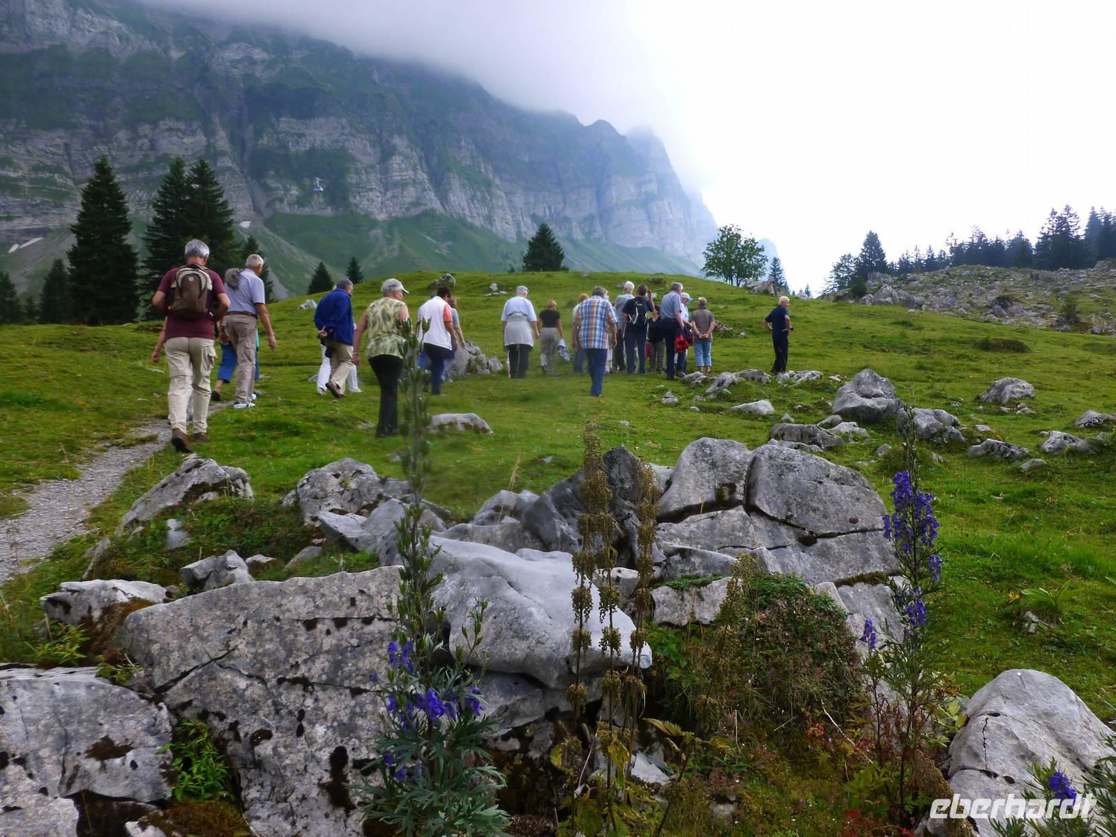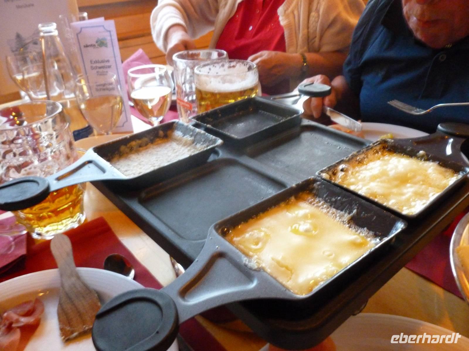 Gleich am Morgen fuhren wir hinauf auf den 2.502 Meter hohen Säntis, den höchsten Gipfel des Alpstein-Massivs. Mit der 1935 in Betrieb genommenen Säntis-Schwebebahn ging es hoch hinaus. Das Wetter ist vielversprechend und auf dem Säntis genossen wir tolle Blicke auf die umliegenden Berge. Bei schönem Wetter bietet sich nämlich vom Gipfel des Säntis eine überwältigende Rundsicht auf die Vorarlberger, Bündner, Glarner und Urner Alpen sowie über den Bodensee hinaus bis weit ins schwäbische Land. Wir stärkten uns erst einmal mit einem reichhaltigen Bergfrühstück. Anschließend konnten wir auf dem Säntisgipfel mal hinter die Kulissen schauen, denn während einer Führung ging es sogar in den 123 Meter hohen Sendemasten hinein, der von der Swisscom betrieben wird. Viele interessante Daten und Fakten erklärte man uns und auch ein kleiner Film über den Säntis wurde uns gezeigt. Nachdem wir am späten Vormittag wieder auf der Schwägalp angekommen waren, ging es gleich weiter nach Appenzell, dem Hauptort des Halbkantons Appenzell-Innerrhoden. In dem gut erhaltenen Ortskern, besonders an der malerischen Hauptgasse, zeigt sich immer wieder gepflegte Tradition. Zwischen schmucken bemalten Holzhäusern mit geschwungenen Giebeln stehen Steinbauten aus dem 16. Jahrhundert. Nach einem ausgiebigen Stadtspaziergang besuchten wir die Appenzeller Alpenbitter AG. Der Appenzeller ist das Hauptprodukt der Appenzeller Alpenbitter AG. Er genießt nicht nur in Appenzell, sondern in der ganzen Schweiz einen fast 100%igen Bekanntheitsgrad, der auf zwei Gründe zurückzuführen ist, die gleichzeitig auch die Philosophie dieses Familienbetriebs widerspiegeln - höchstmögliche Qualität und die ausschließliche Verwendung von natürlichen Rohstoffen. Natürlich durften wir den Appenzeller Kräuterlikör, das Aushängeschild des Unternehmens, auch kosten und gut gelaunt unternahmen die meisten Gäste unserer Gruppe dann am Nachmittag eine Wanderung auf der Schwägalp. Unser einheimischer Wanderführer Albert begleitete uns auf dieser etwa 1,5-stündigen Tour und erzählte uns viele wissenswerte Dinge über das Leben, die Tier- und Pflanzenwelt auf der Alm. Naja, auf halber Strecke gab es dann auch nochmals eine kleine Aufmunterung - den echten Appenzeller Kräuterschnaps! So genossen wir unterwegs eine kleine Stärkung und der Rückkehr zum Berghotel stand nichts mehr im Wege. Zum Abendessen gab es heute übrigens eine echte Schweizer Spezialität - Raclette. Das Wort Raclette leitet sich vom Französischen ab (racler = schaben). Um Raclette zuzubereiten, wird ein großer halbierter Käse an der Schnittfläche erhitzt und die geschmolzene Oberfläche jeweils abgeschabt; zu jeder Portion isst man eine Pellkartoffel und pikanten Zutaten. Einfach lecker...!