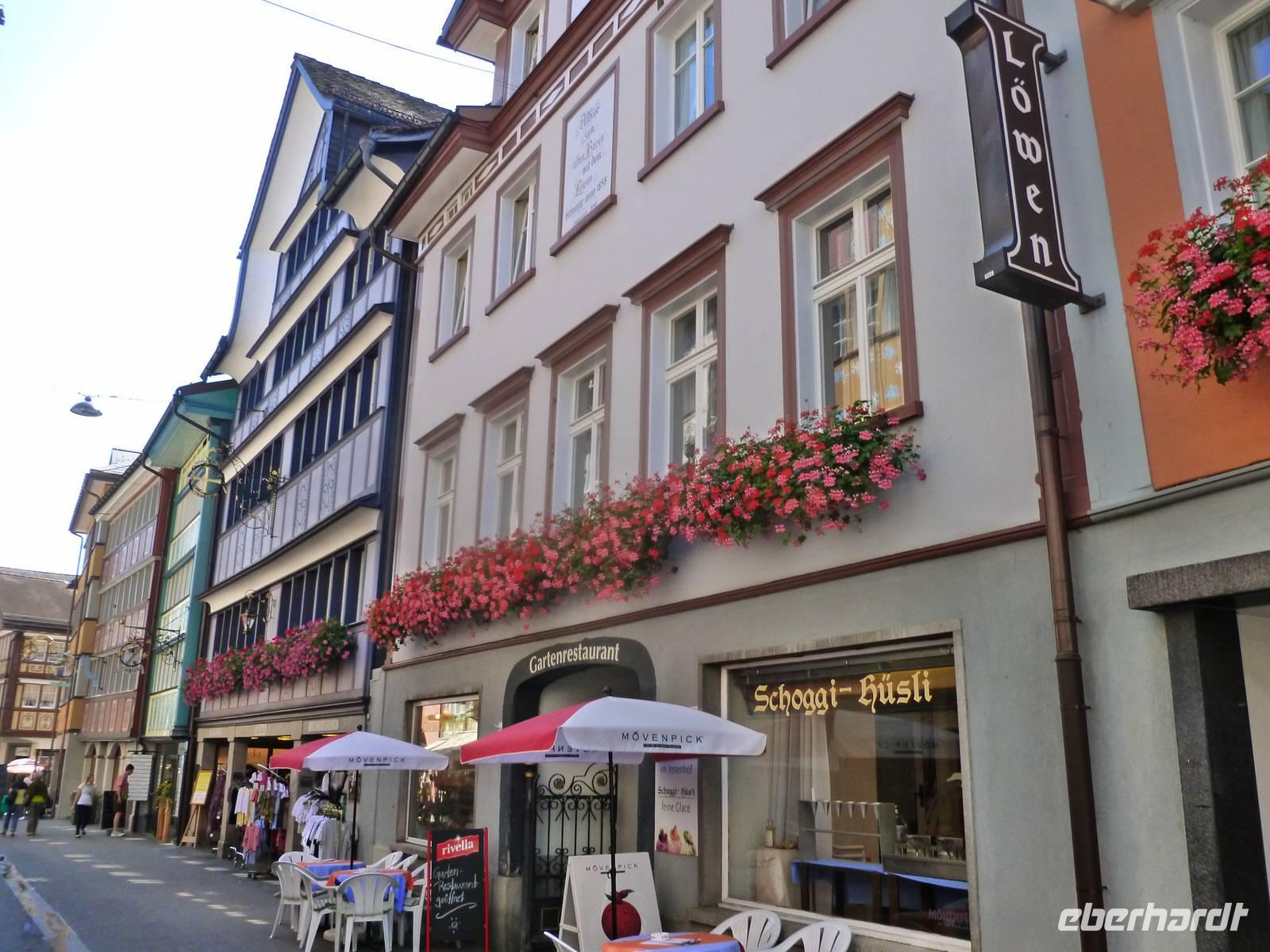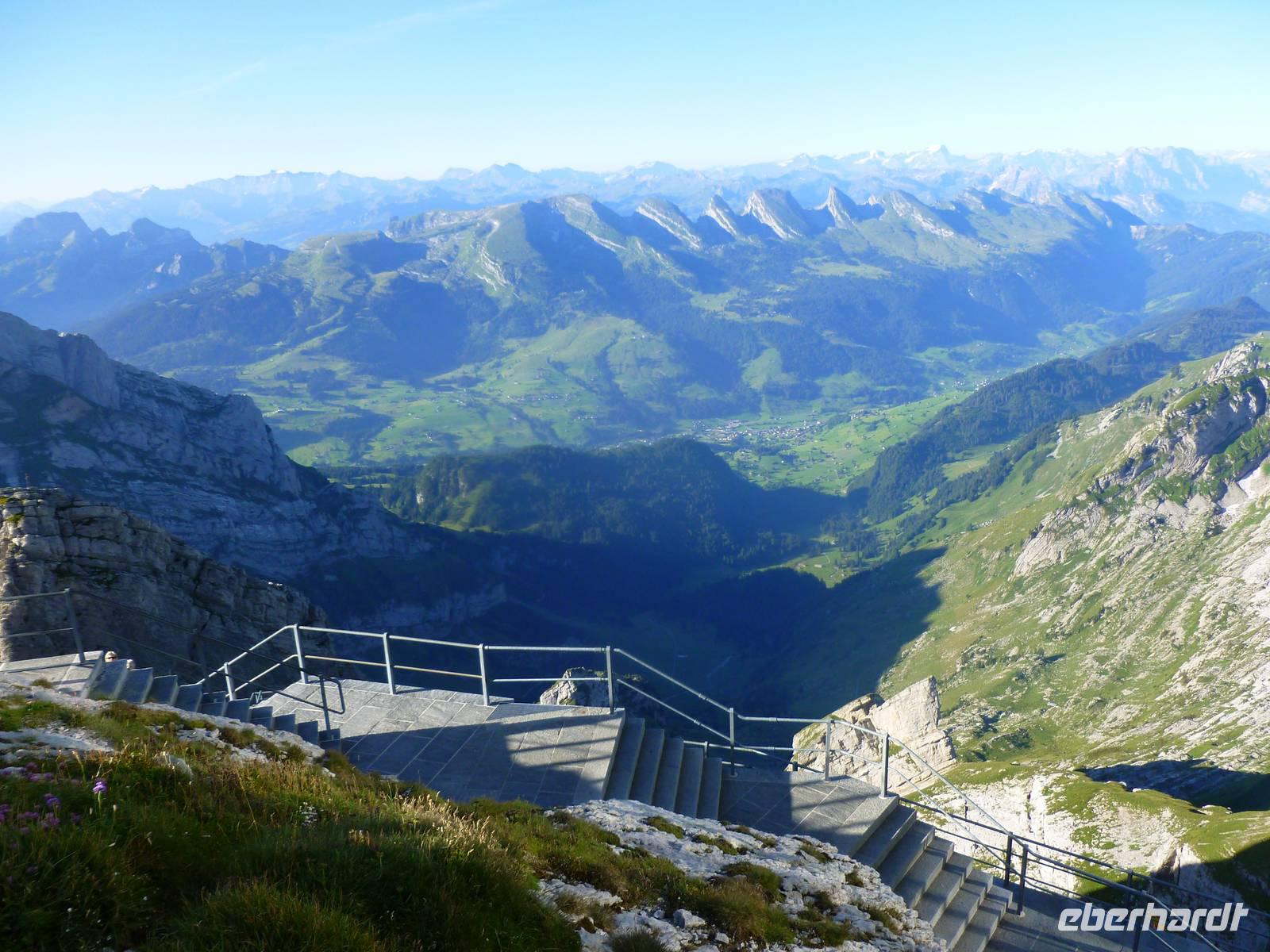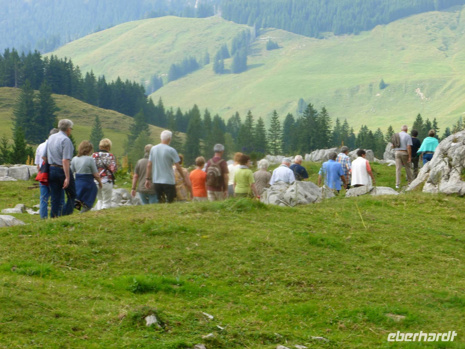 Gleich am Morgen fuhren wir hinauf auf den 2.502 Meter hohen Säntis, den höchsten Gipfel des Alpstein-Massivs. Mit der 1935 in Betrieb genommenen Säntis-Schwebebahn ging es hoch hinaus. Das Wetter ist vielversprechend und auf dem Säntis genossen wir tolle Blicke auf die umliegenden Berge. Bei schönem Wetter bietet sich nämlich vom Gipfel des Säntis eine überwältigende Rundsicht auf die Vorarlberger, Bündner, Glarner und Urner Alpen sowie über den Bodensee hinaus bis weit ins schwäbische Land. Wir stärkten uns erst einmal mit einem reichhaltigen Bergfrühstück. Anschließend konnten wir auf dem Säntisgipfel mal hinter die Kulissen schauen, denn während einer Führung ging es sogar in den 123 Meter hohen Sendemasten hinein, der von der Swisscom betrieben wird. Viele interessante Daten und Fakten erklärte man uns und auch ein kleiner Film über den Säntis wurde uns gezeigt. Nachdem wir am späten Vormittag wieder auf der Schwägalp angekommen waren, ging es gleich weiter nach Appenzell, dem Hauptort des Halbkantons Appenzell-Innerrhoden. In dem gut erhaltenen Ortskern, besonders an der malerischen Hauptgasse, zeigt sich immer wieder gepflegte Tradition. Zwischen schmucken bemalten Holzhäusern mit geschwungenen Giebeln stehen Steinbauten aus dem 16. Jahrhundert. Nach einem ausgiebigen Stadtspaziergang besuchten wir die Appenzeller Alpenbitter AG. Der Appenzeller ist das Hauptprodukt der Appenzeller Alpenbitter AG. Er genießt nicht nur in Appenzell, sondern in der ganzen Schweiz einen fast 100%igen Bekanntheitsgrad, der auf zwei Gründe zurückzuführen ist, die gleichzeitig auch die Philosophie dieses Familienbetriebs widerspiegeln - höchstmögliche Qualität und die ausschließliche Verwendung von natürlichen Rohstoffen. Natürlich durften wir den Appenzeller Kräuterlikör, das Aushängeschild des Unternehmens, auch kosten und gut gelaunt unternahmen die meisten Gäste unserer Gruppe dann am Nachmittag eine Wanderung auf der Schwägalp. Unser einheimischer Wanderführer Albert begleitete uns auf dieser etwa 1,5-stündigen Tour und erzählte uns viele wissenswerte Dinge über das Leben, die Tier- und Pflanzenwelt auf der Alm. Naja, auf halber Strecke gab es dann auch nochmals eine kleine Aufmunterung - den echten Appenzeller Kräuterschnaps! So genossen wir unterwegs eine kleine Stärkung und der Rückkehr zum Berghotel stand nichts mehr im Wege. Zum Abendessen gab es heute übrigens eine echte Schweizer Spezialität - Raclette. Das Wort Raclette leitet sich vom Französischen ab (racler = schaben). Um Raclette zuzubereiten, wird ein großer halbierter Käse an der Schnittfläche erhitzt und die geschmolzene Oberfläche jeweils abgeschabt; zu jeder Portion isst man eine Pellkartoffel und pikanten Zutaten. Einfach lecker...!