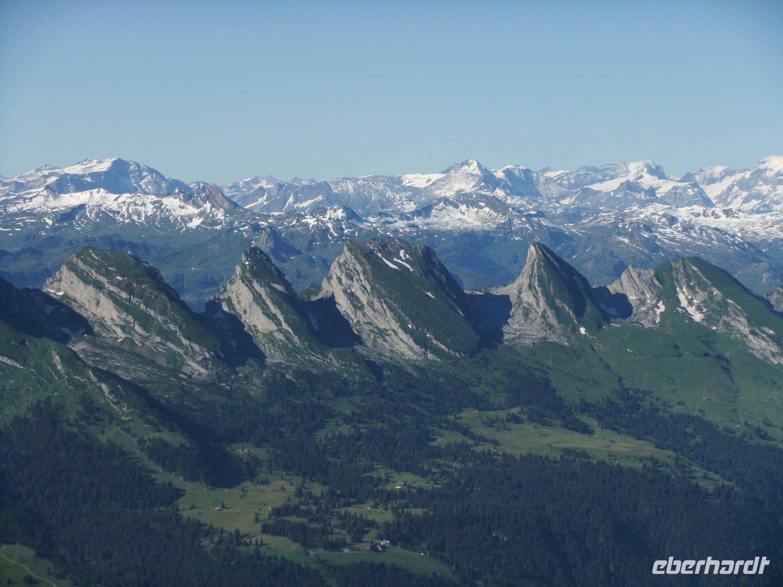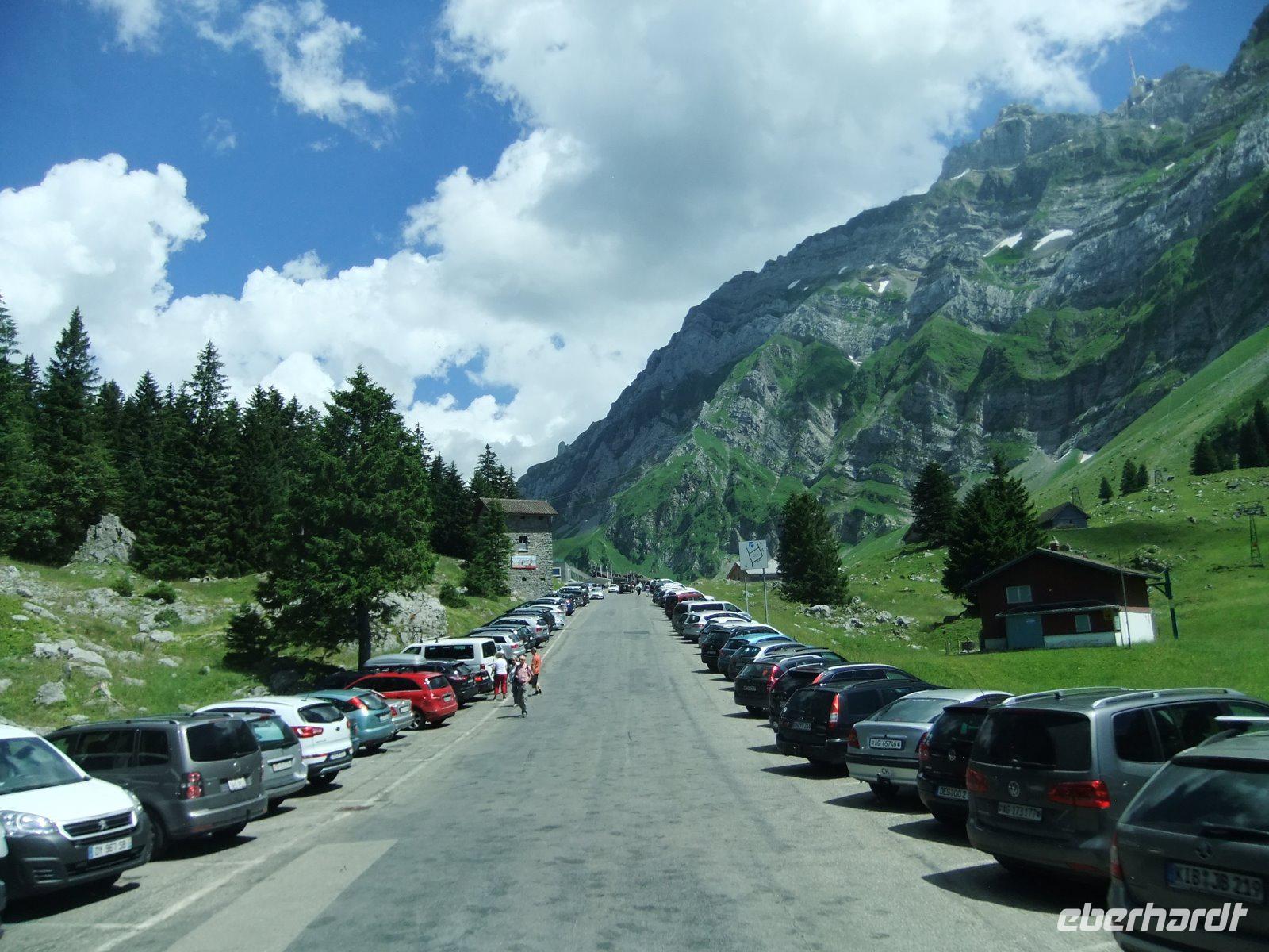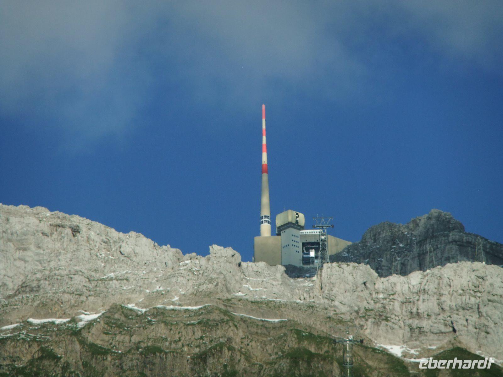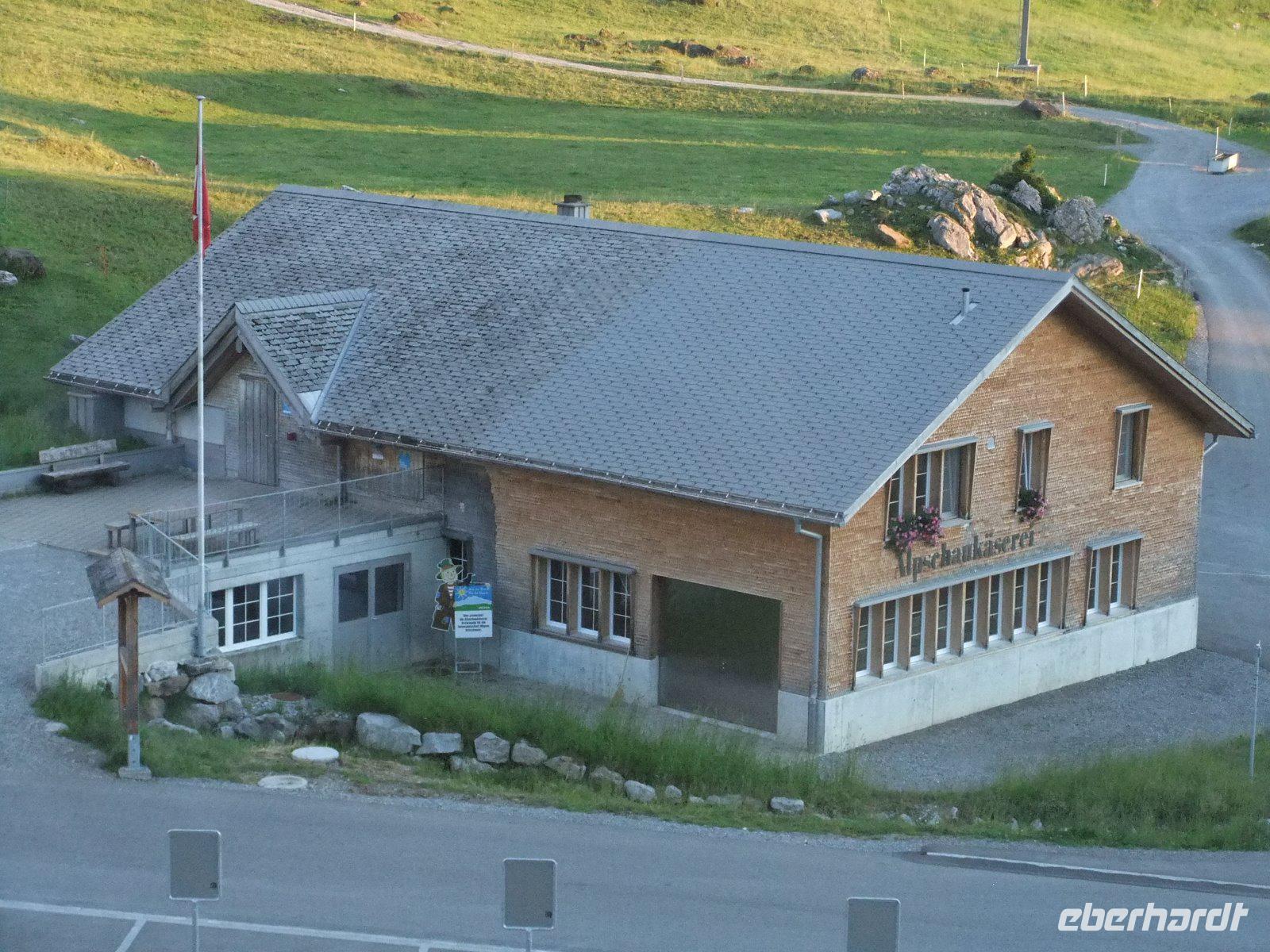 34 Eberhardt-Gäste freuen sich auf eine Reise in die Schweiz. Pünktlich stehen alle an den Zustiegsstellen und anfangs kommen wir auch gut voran. Dann aber, so erfahren wir von Chauffeur Mike, wird ein Stau angekündigt mit 1,5 Stunden Wartezeit. Wir verlassen die Autobahn und fahren durch das Neue Fränkische Seenland und Nördlingen. So erreichen wir fast pünktlich unsere letzte Zustiegsstelle bei Ulm. Von hier geht es weiter nach Lindau, wo ein Tankstopp eingelegt wird. Dann fahren wir durch den Pfändertunnel und durch das Rheintal. Wir sehen an der gegenüberliegenden Talseite das Schloss Vaduz, biegen aber bald ins Toggenburg ab, wo der Skispringer Simon Amman seine Heimat hat. Linkerhand präsentieren sich uns die Gipfel der Churfirsten, rechterhand grüßt bald der Säntis. Nun geht es hinauf zur Schwägalp. Im neuen Hotel auf 1370 m Höhe werden wir schon erwartet. Schnell sind die Zimmer bezogen und bald treffen wir uns zum Abendessen im Restaurant.