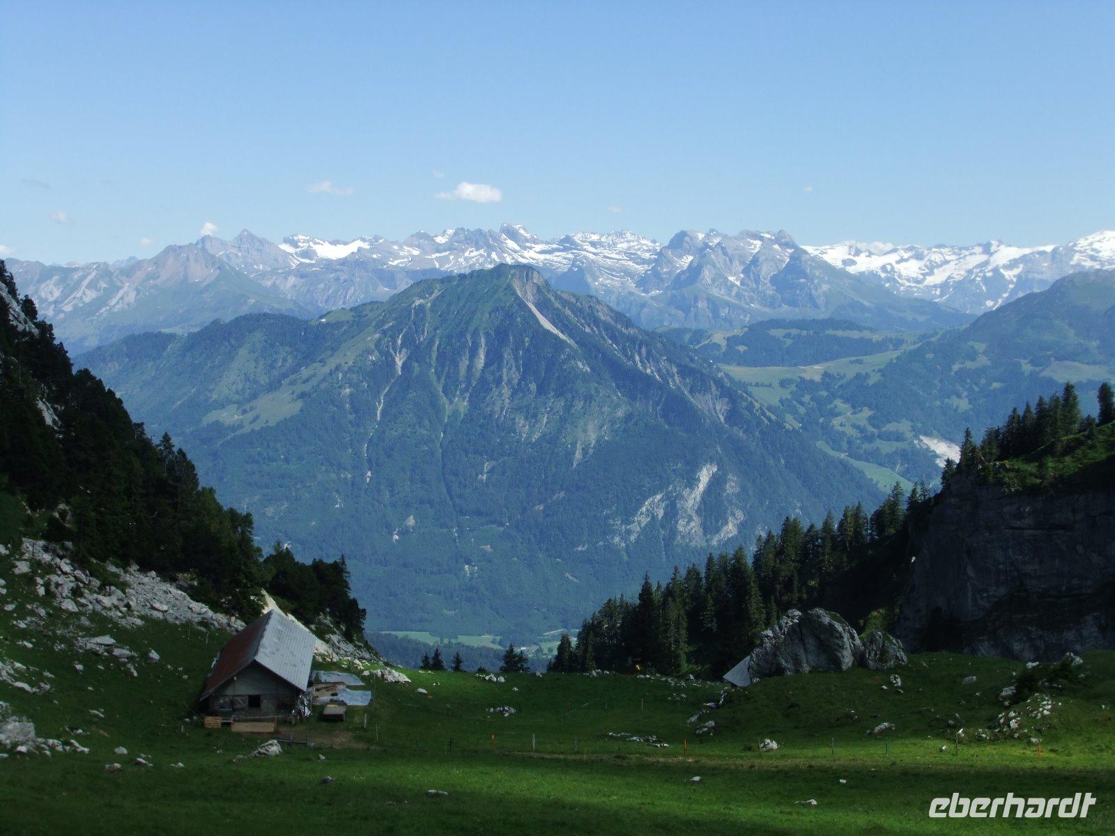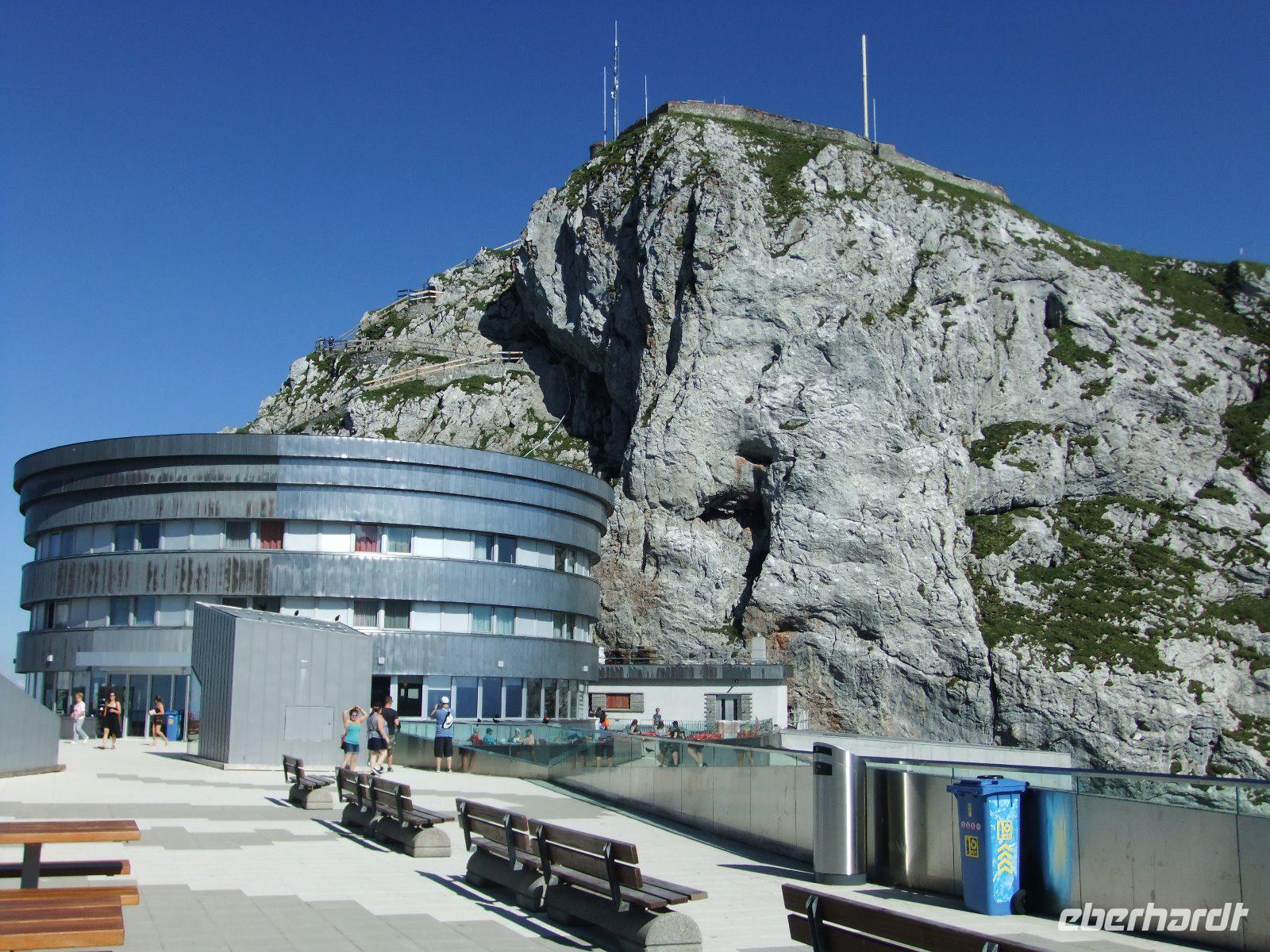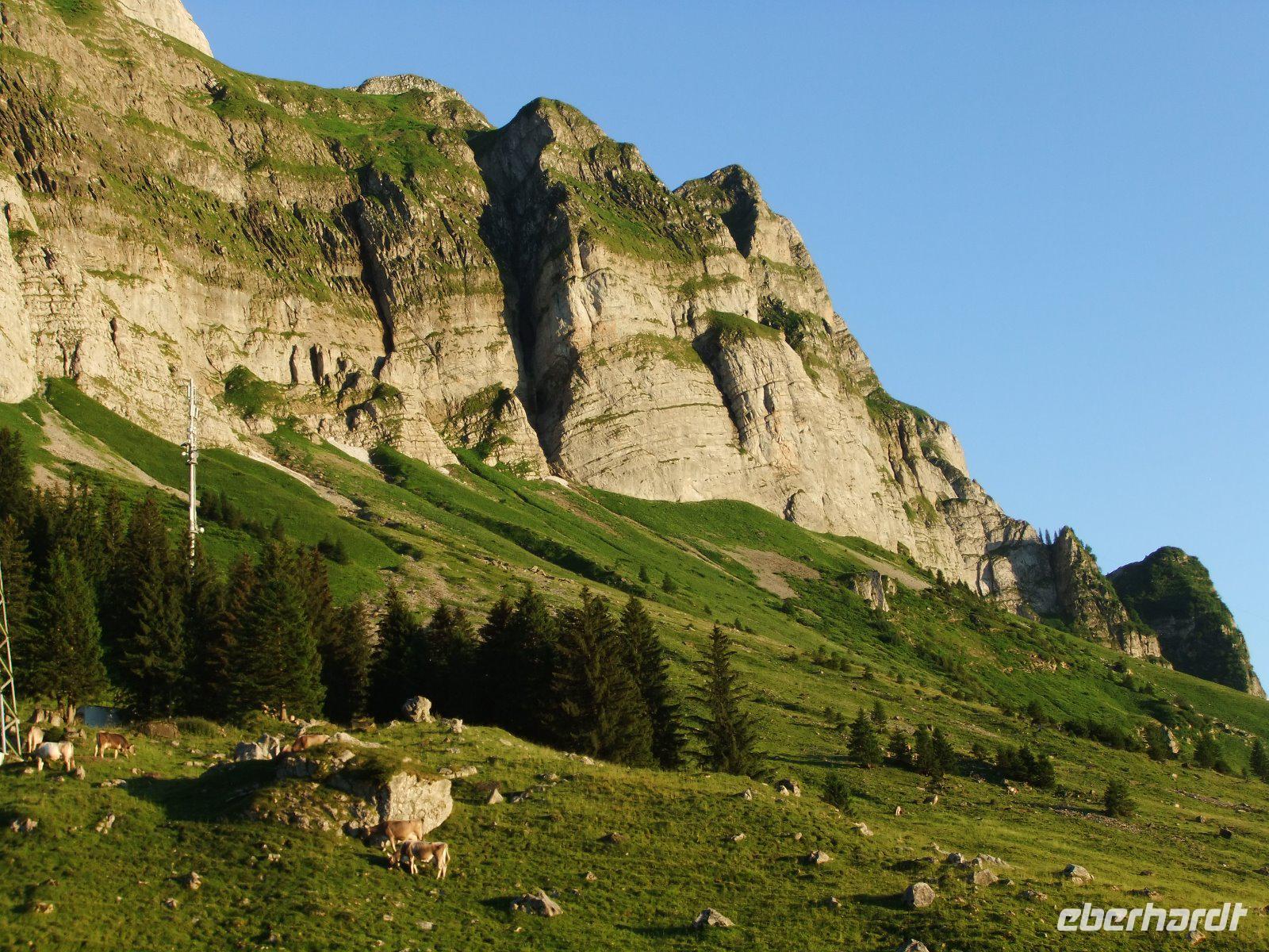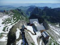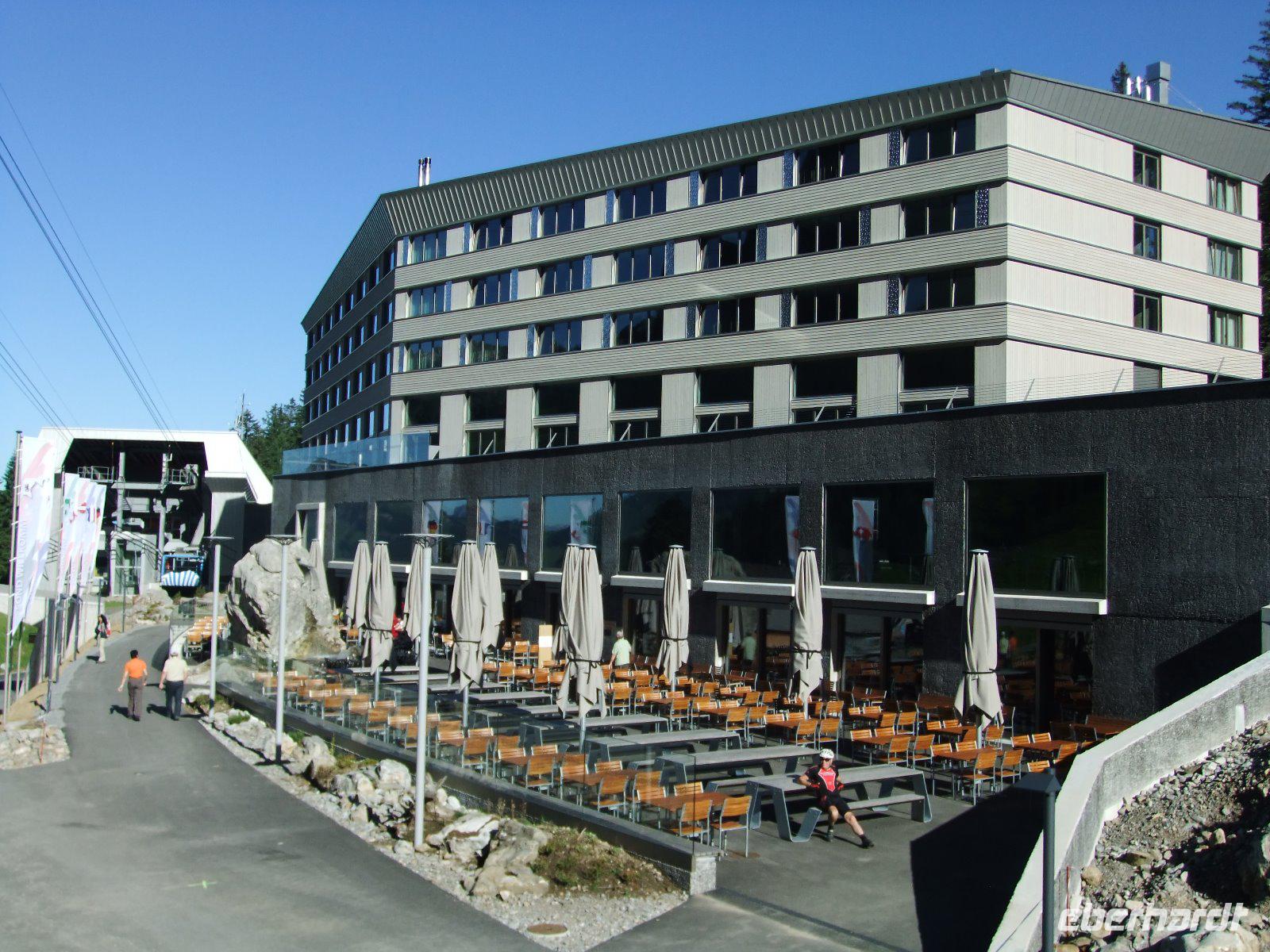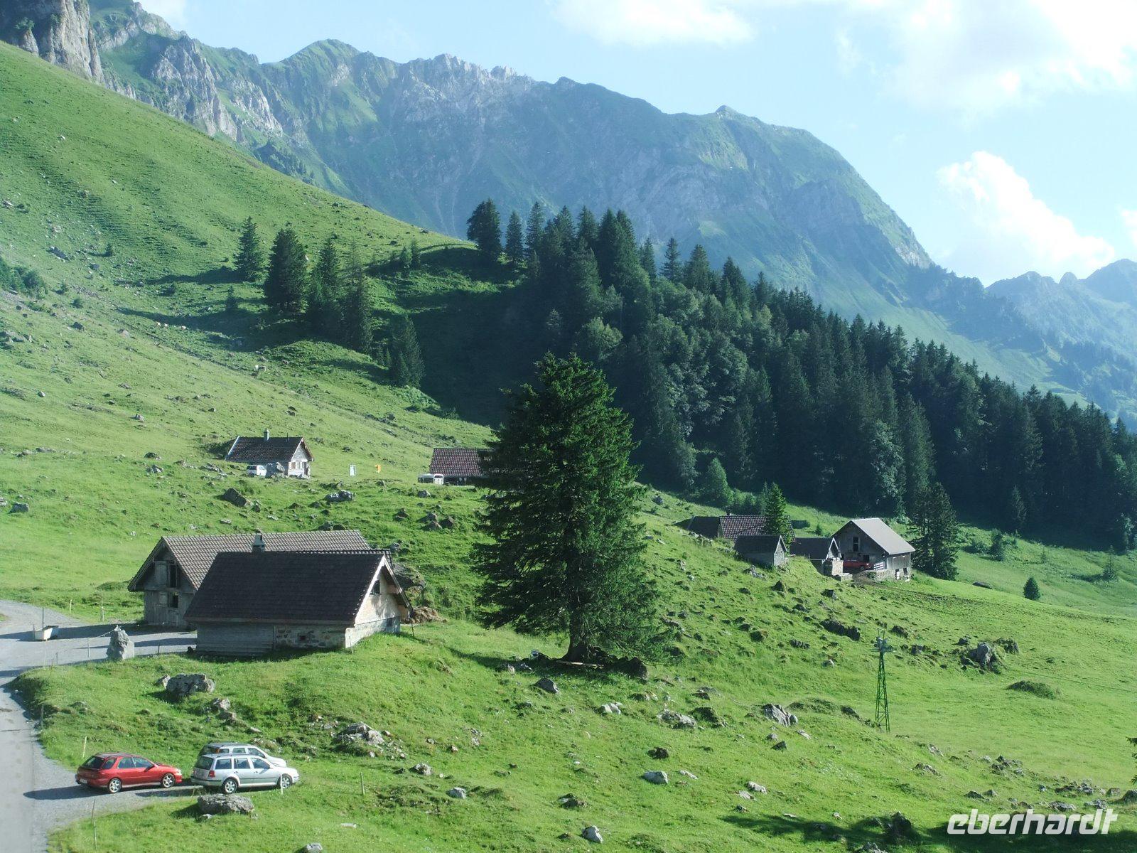 34 Eberhardt-Gäste freuen sich auf eine Reise in die Schweiz. Pünktlich stehen alle an den Zustiegsstellen und anfangs kommen wir auch gut voran. Dann aber, so erfahren wir von Chauffeur Mike, wird ein Stau angekündigt mit 1,5 Stunden Wartezeit. Wir verlassen die Autobahn und fahren durch das Neue Fränkische Seenland und Nördlingen. So erreichen wir fast pünktlich unsere letzte Zustiegsstelle bei Ulm. Von hier geht es weiter nach Lindau, wo ein Tankstopp eingelegt wird. Dann fahren wir durch den Pfändertunnel und durch das Rheintal. Wir sehen an der gegenüberliegenden Talseite das Schloss Vaduz, biegen aber bald ins Toggenburg ab, wo der Skispringer Simon Amman seine Heimat hat. Linkerhand präsentieren sich uns die Gipfel der Churfirsten, rechterhand grüßt bald der Säntis. Nun geht es hinauf zur Schwägalp. Im neuen Hotel auf 1370 m Höhe werden wir schon erwartet. Schnell sind die Zimmer bezogen und bald treffen wir uns zum Abendessen im Restaurant.