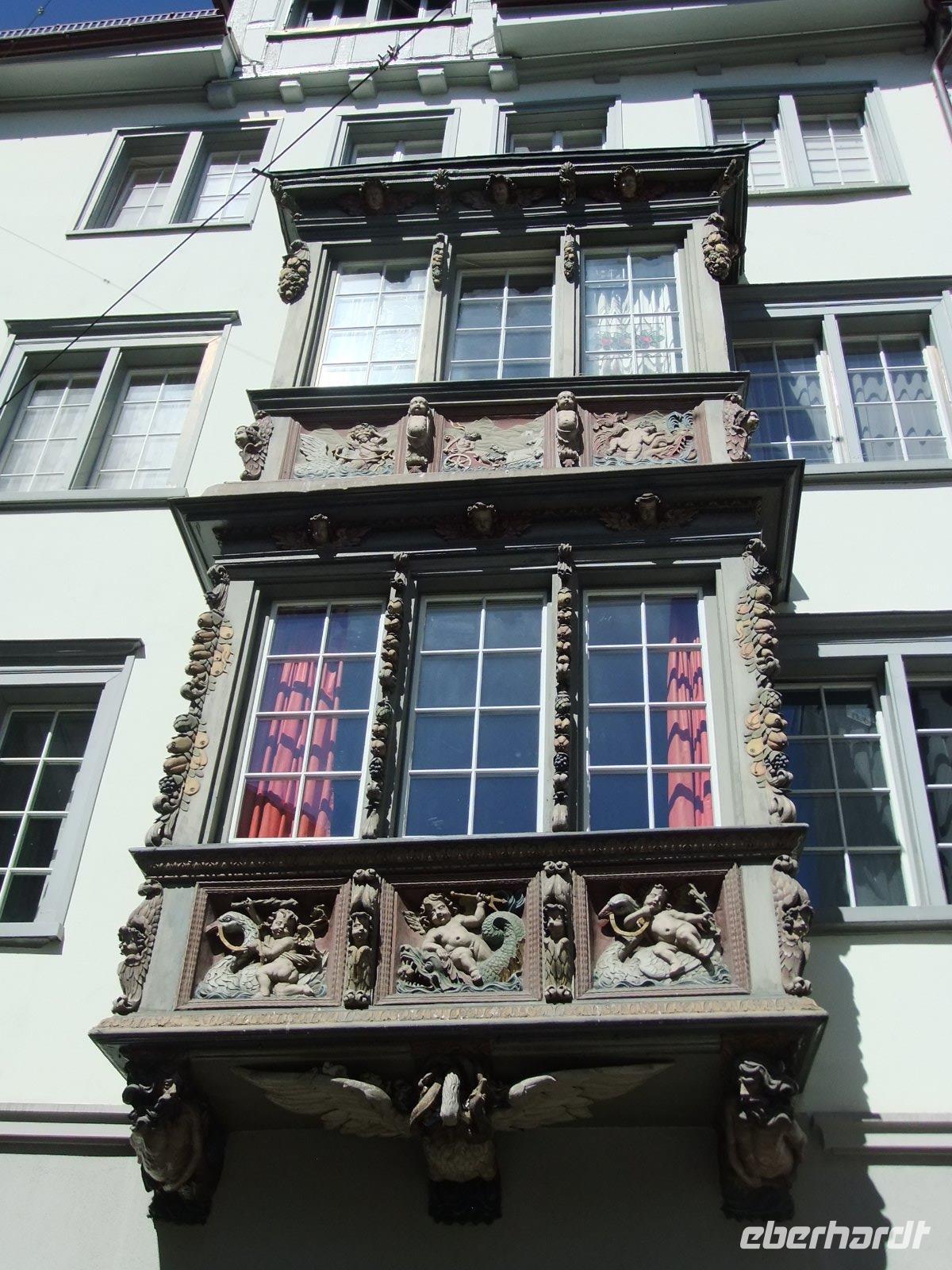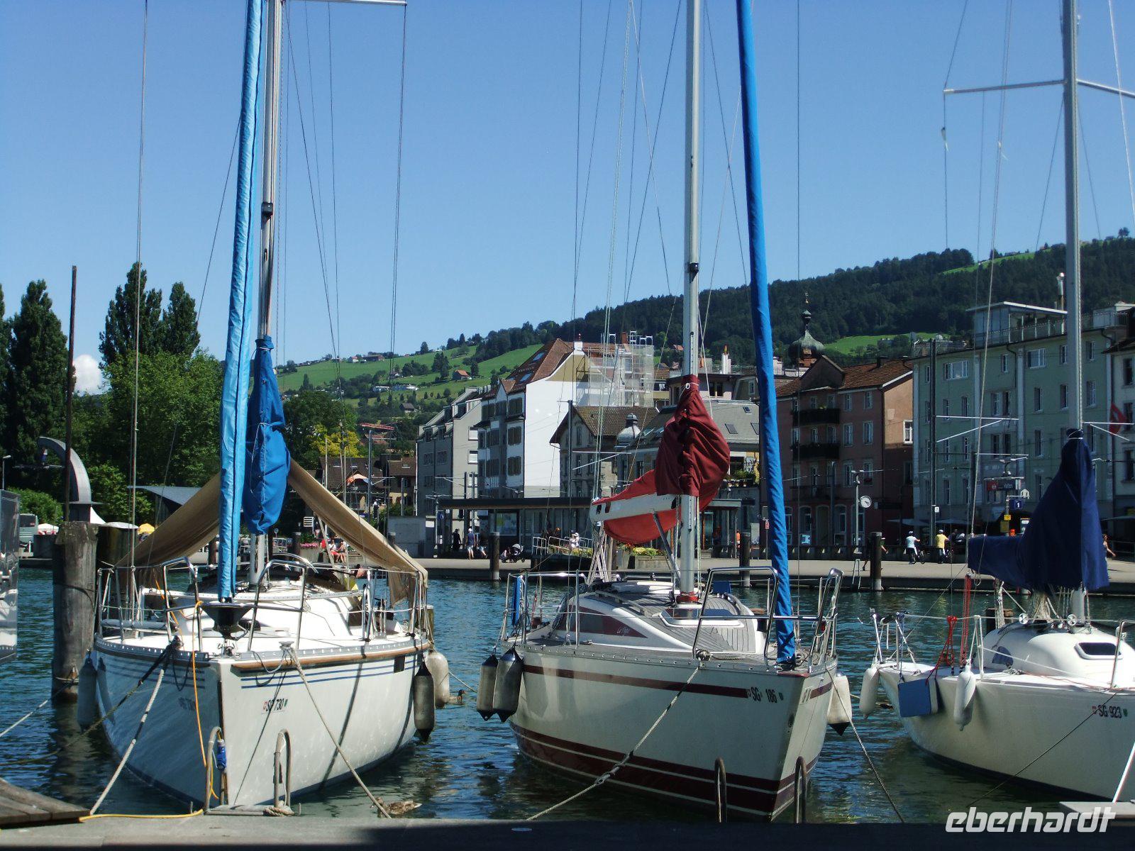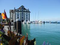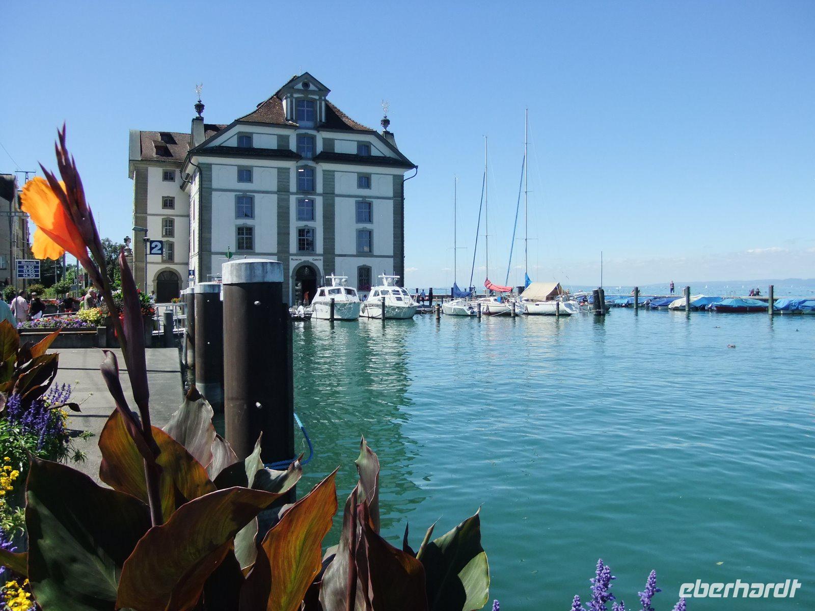 Gut gestärkt fahren wir dann entlang des Schweizer Bodenseeufers. Auch Rorschach, der nächste Ort, ist einen Besuch wert. Mike parkt direkt an der Seepromenaden. So können wir hier einen gemütlichen Spaziergang machen oder auf einer der vielen Bänke in der Sonne sitzen. Einige Gäste gehen vorbei am Hafen zum Wahrzeichen des Ortes, dem Kornhaus. Es soll der schönste Getreidespeicher der Schweiz sein. Bei der Weiterfahrt sehen wir dann auch noch das historische Badehaus.