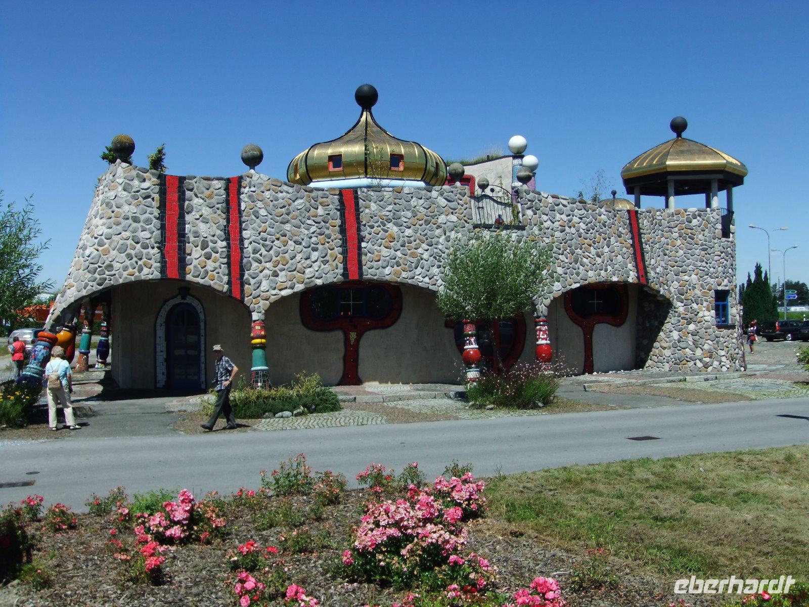 Es geht weiter Richtung Bodensee. Unseren ersten Halt machen wir hier in Altenrhein. Wir fahren vorbei am Flughafen und erreichen bald eine Markthalle, die es so in der Schweiz nur einmal gibt. Gebaut wurde sie nämlich unter dem Motto „Paradiese kann man nur selber machen" nach einem Konzept von Friedensreich Hundertwasser. Hier bei den vergoldeten Zwiebeltürmen, ungleichen Fenstern und begrünten Dachflächen machen wir unsere Mittagspause.