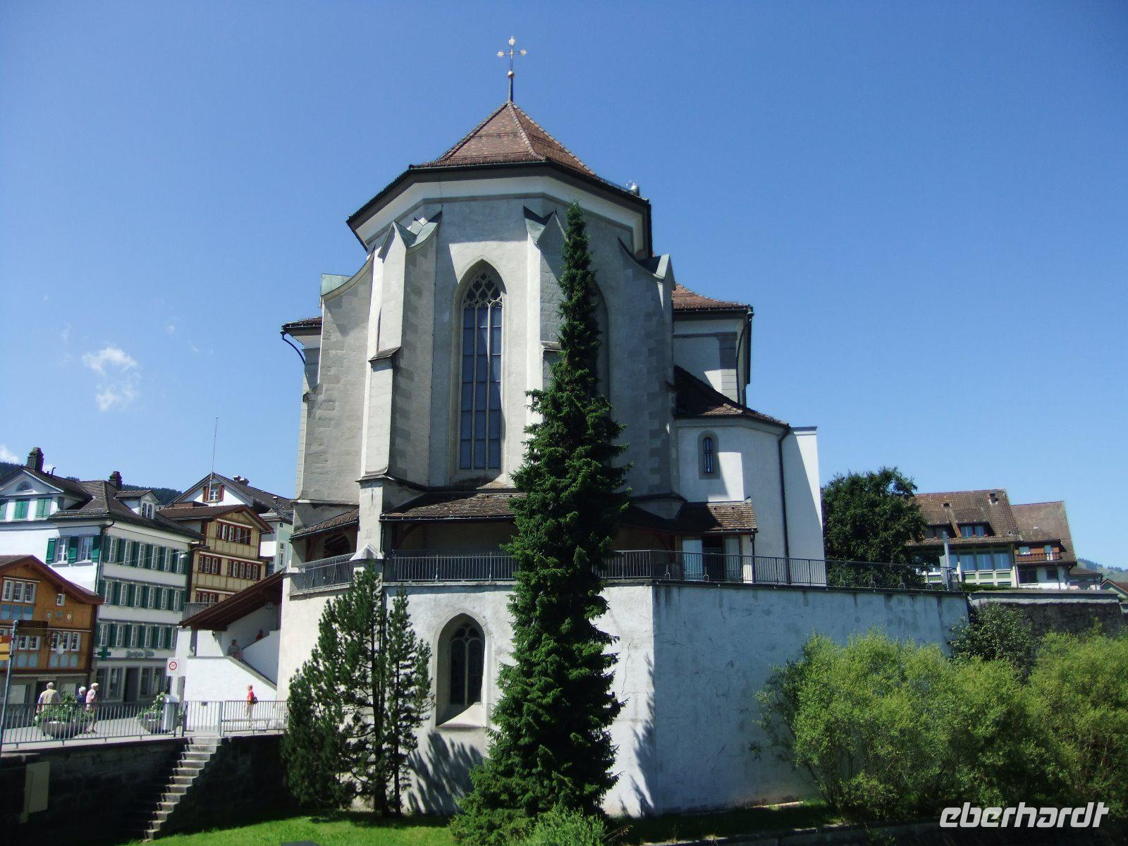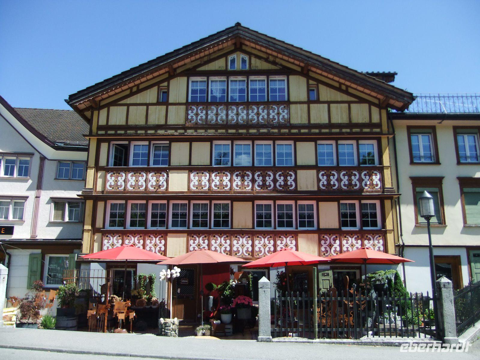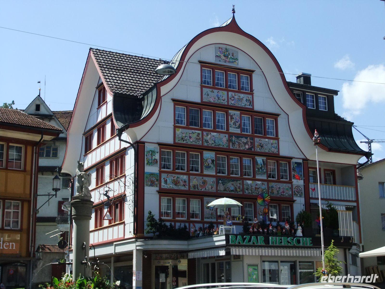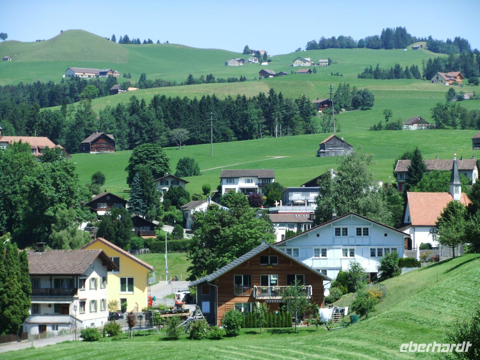 Von hier aus unternehmen wir einen Ausflug durch die idyllische Landschaft der Appenzeller Kantone. Bald erreichen wir Appenzell. Über den Fluss Sitter gehen wir zur Katholischen Kirche. Es ist eine Freude, dann durch die Hauptgasse mit ihren schmucken farbenfrohen Häusern zu spazieren. Am Westende erreichen wir den Landsgemeindeplatz, wo alljährlich mit offenem „Handmehr" über Gesetze abgestimmt und die Regierung gewählt wird.