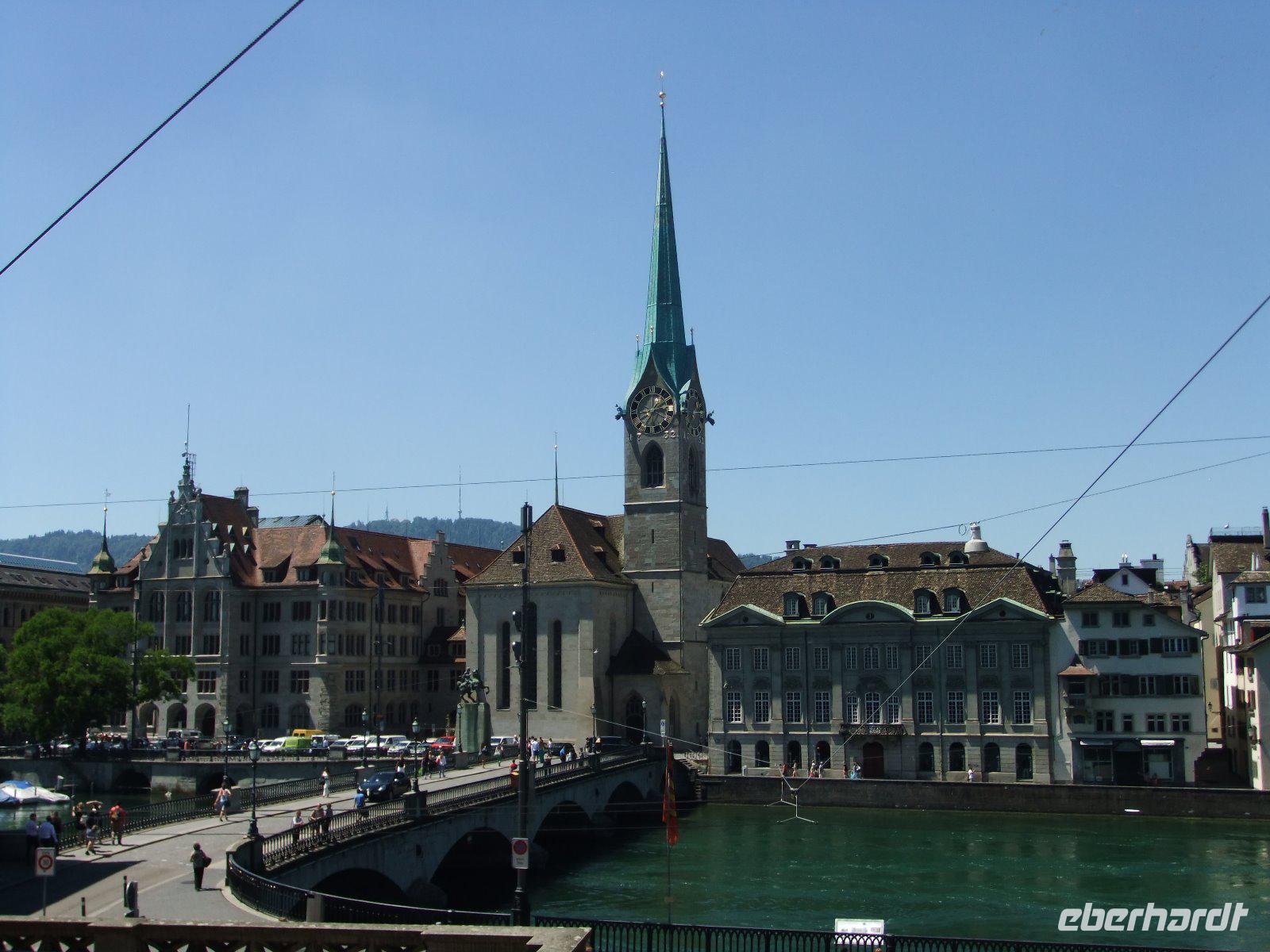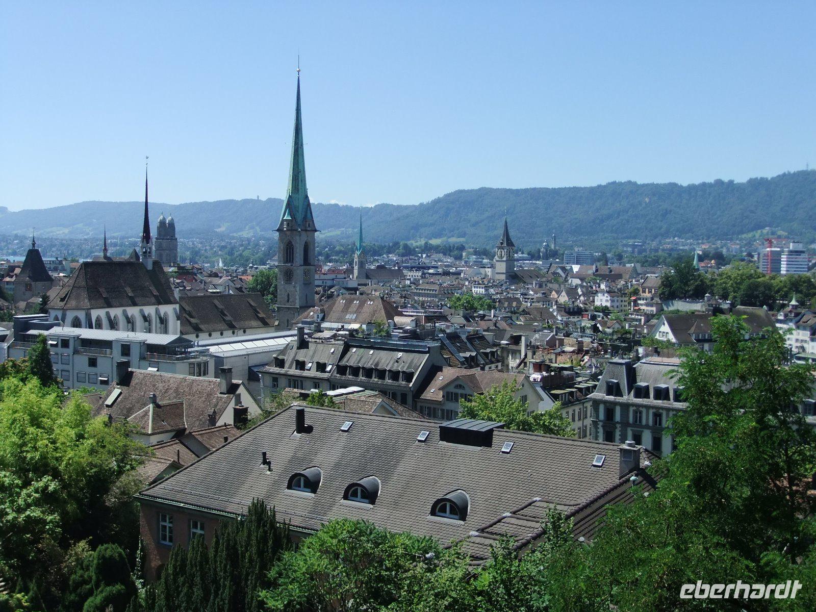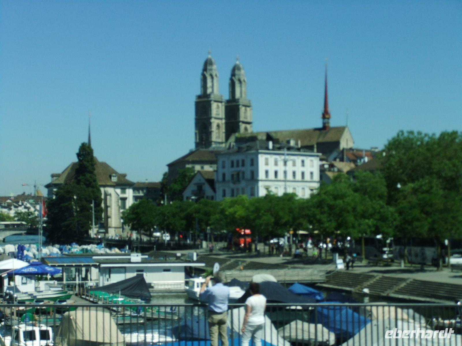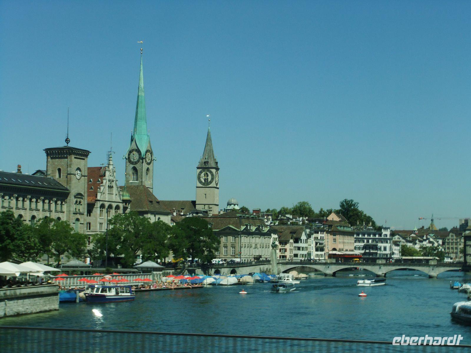 Nach dem Frühstück verlassen wir die Schwägalp. Wir fahren wieder hinab ins Toggenburg, diesmal aber weiter Richtung Westen. Bald sehen wir den Zürichsee, an deren Westende Zürich liegt. Hier werden wir von Michael zu einer Stadtrundfahrt erwartet. Zuerst umrunden wir den Bahnhof, es ist der größte in der Schweiz, fahren vorbei am Schweizer Landesmuseum und entlang der Sihl, sehen die ehemaligen Stallungen und Reithallen sowie das neue Casino und das Fußballmuseum der FIFA. Wir erreichen das Geschäfts- und Bankenviertel und fahren weiter zum Hafen Enge. Hier machen wir einen Fotostopp. Dann geht es hinauf auf den Zürichhügel, wo sich u.a. das Universitätsviertel befindet. Von der Aussichtsterrasse hat man einen sehr schönen Blick auf die Stadt. Wir sehen die beiden Türme des Großmünsters, den spitzen Turm des Frauenmünsters und den Turm der Kirche St. Peter mit dem größten Zifferblatt Europas. Wieder unten angekommen bleibt Zeit für eigene Erkundungen. Einige schauen sich die Chorfenster von Marc Chagall im Frauenmünster an, andere verweilen im Großmünster. Viele bummeln auch durch die Straßen, spazieren entlang der Limmat oder zum Zürichsee.