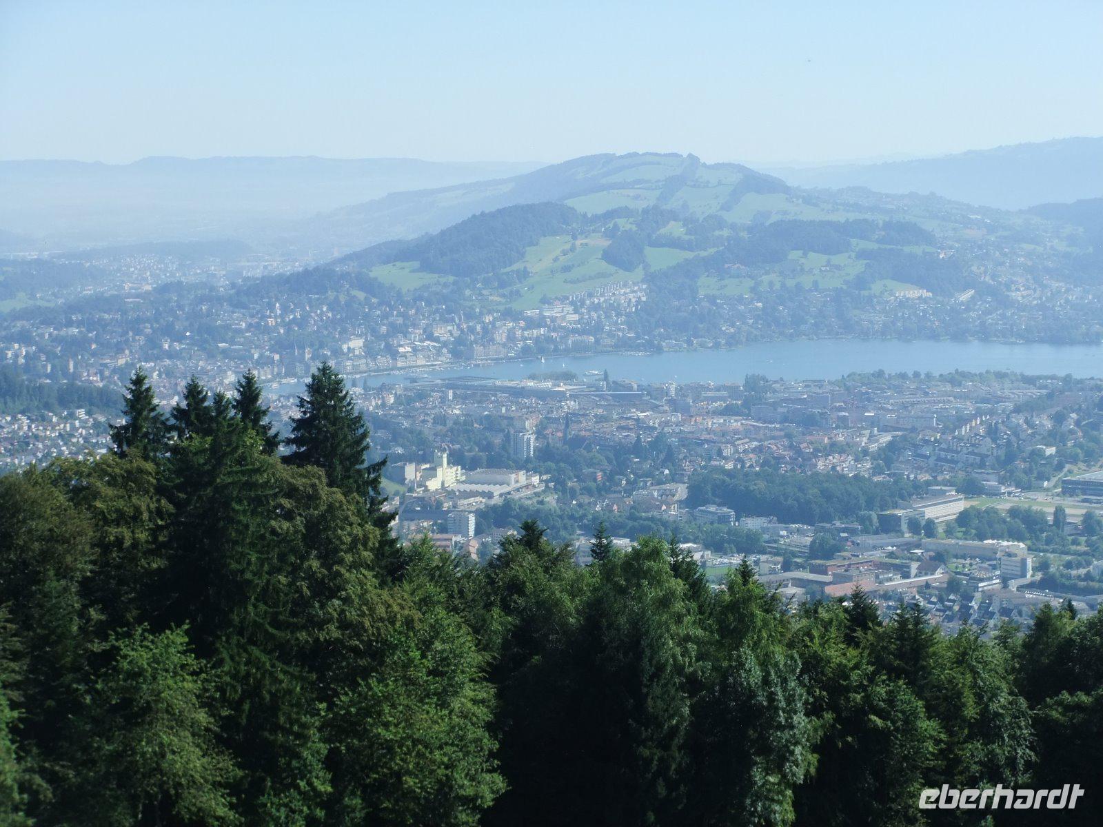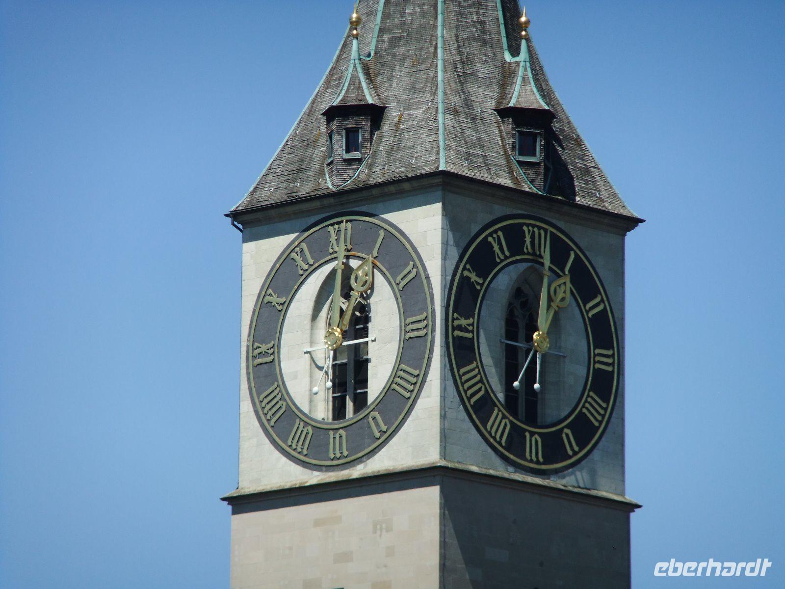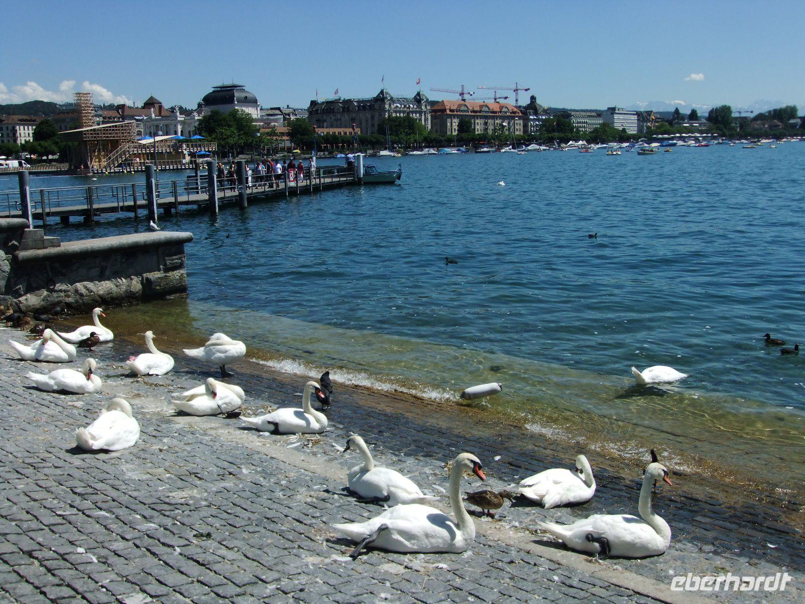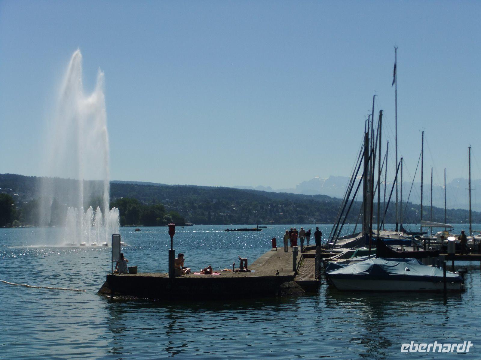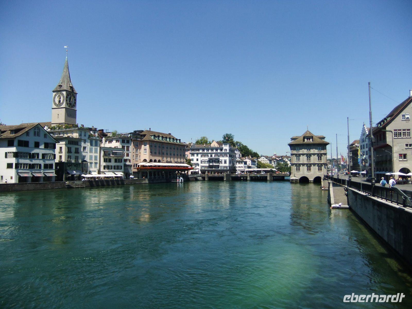 Nach dem Frühstück verlassen wir die Schwägalp. Wir fahren wieder hinab ins Toggenburg, diesmal aber weiter Richtung Westen. Bald sehen wir den Zürichsee, an deren Westende Zürich liegt. Hier werden wir von Michael zu einer Stadtrundfahrt erwartet. Zuerst umrunden wir den Bahnhof, es ist der größte in der Schweiz, fahren vorbei am Schweizer Landesmuseum und entlang der Sihl, sehen die ehemaligen Stallungen und Reithallen sowie das neue Casino und das Fußballmuseum der FIFA. Wir erreichen das Geschäfts- und Bankenviertel und fahren weiter zum Hafen Enge. Hier machen wir einen Fotostopp. Dann geht es hinauf auf den Zürichhügel, wo sich u.a. das Universitätsviertel befindet. Von der Aussichtsterrasse hat man einen sehr schönen Blick auf die Stadt. Wir sehen die beiden Türme des Großmünsters, den spitzen Turm des Frauenmünsters und den Turm der Kirche St. Peter mit dem größten Zifferblatt Europas. Wieder unten angekommen bleibt Zeit für eigene Erkundungen. Einige schauen sich die Chorfenster von Marc Chagall im Frauenmünster an, andere verweilen im Großmünster. Viele bummeln auch durch die Straßen, spazieren entlang der Limmat oder zum Zürichsee.