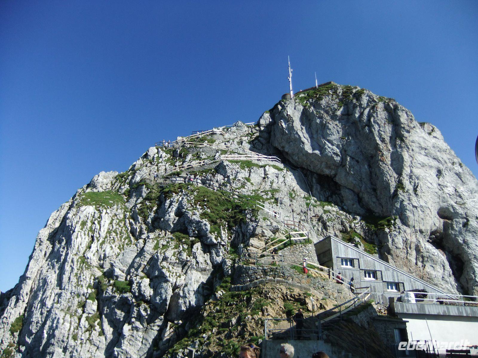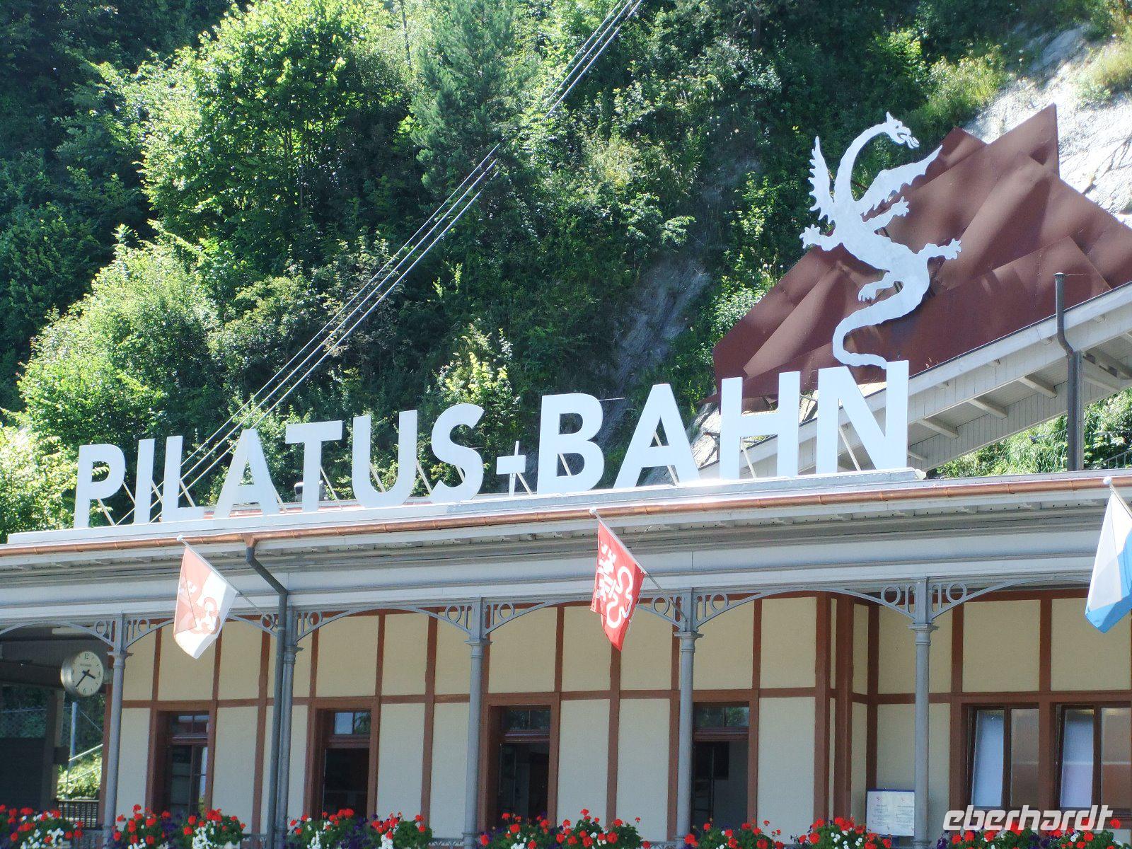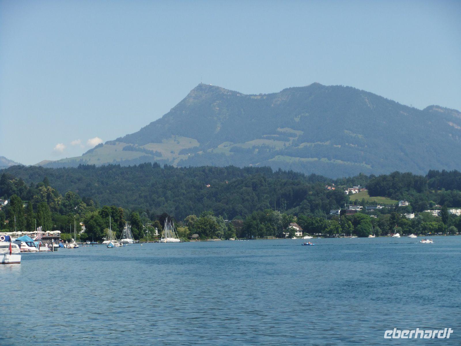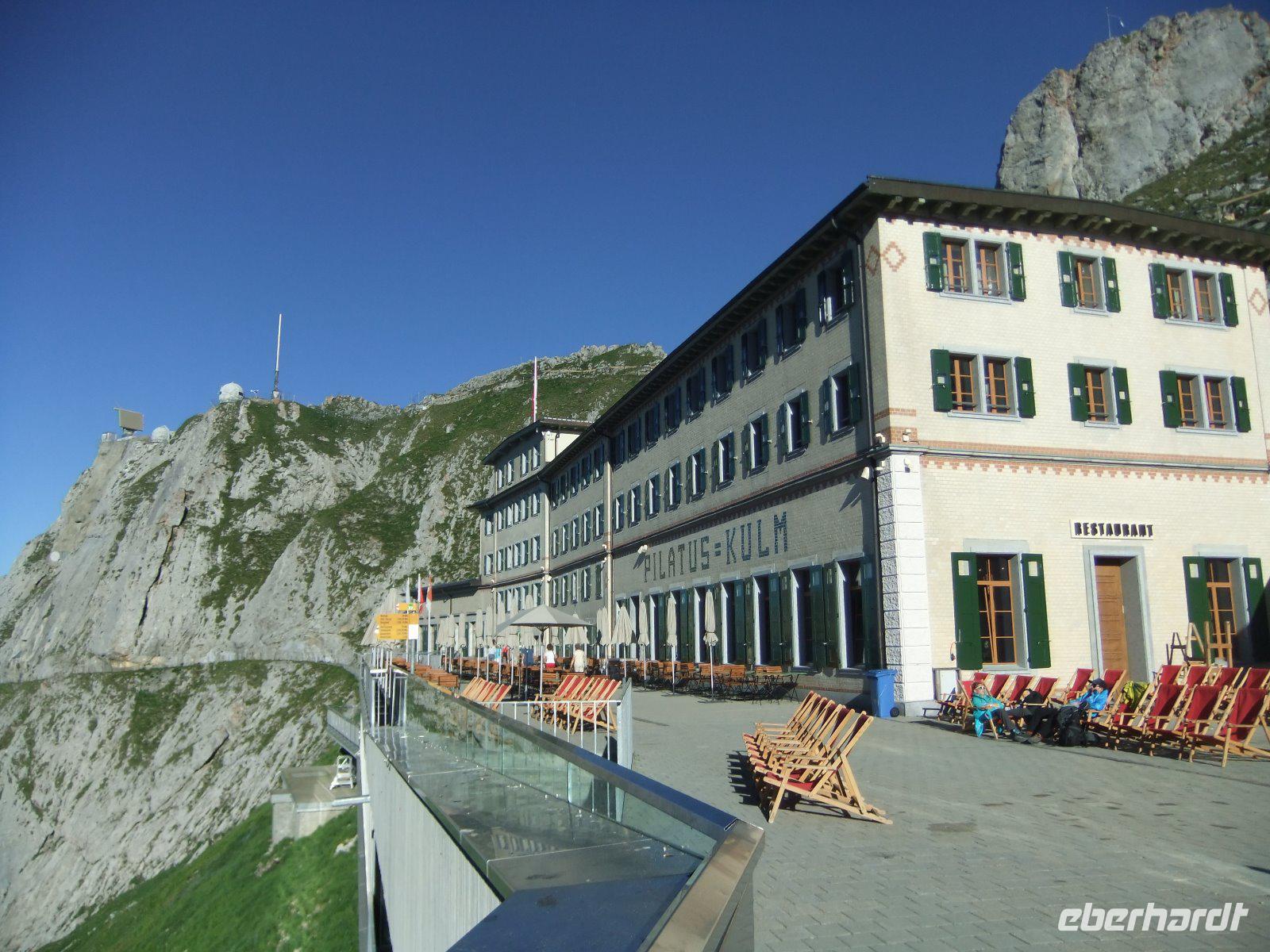 Nachmittags treffen wir uns alle wieder am Stadthaus-Quai, denn hier steht Mike mit dem Bus. Für uns geht es weiter zum Alpnacher See. Er ist Teil des Vierwaldstätter Sees und an seinem Ufer befindet sich Alpnachstad. Von hier fahren wir mit der steilsten Zahnradbahn der Welt hinauf auf den Pilatus. Die Strecke, die 1889 eröffnet wurde, ist 4618 m lang und hat eine maximale Steigung von 48 %. Allein diese Auffahrt ist ein Erlebnis. Immer wieder bieten sich schöne Blicke zurück auf den Vierwaldstätter See, in den sich der Bürgenstock wie ein Keil hineinschiebt. Eng schmiegt sich die Bahn an den Hang, teilweise geht es durch kleine Tunnel. Auf dem Gipfel befindet sich u.a. das Hotel Bellevue, in dem für uns Zimmer reserviert sind. Schnell haben wir eingecheckt und dann sind alle Gäste schon wieder draußen auf der Aussichtsterrasse. Die Sicht ist faszinierend. Zahlreiche Alpengipfel, darunter Titlis, Eiger, Mönch und Jungfrau, präsentieren sich uns ebenso wie mehrere Seen. Mit einem Glas Wein stoßen wir auf diesen schönen Aufenthalt inmitten der Schweizer Bergwelt an. Dann gehen wir zum Abendessen in das historische Berghotel Kulm. Im Salon „Queen Victoria" beginnt mit einem Melonendrink ein sehr schmackhaftes Menü. Anschließend erkunden einige Gäste noch den Drachenweg oder beobachten die Steinböcke und Gämsen, die sich nahe heran trauen. Dann aber besteigen viele noch den Esel. Von diesem Aussichtsgipfel aus können wir einen traumhaften Sonnenuntergang erleben. Später leuchten tief unter uns die Lichter von Luzern. Ein wunderschöner Tag endet für uns in 2070 M Höhe.