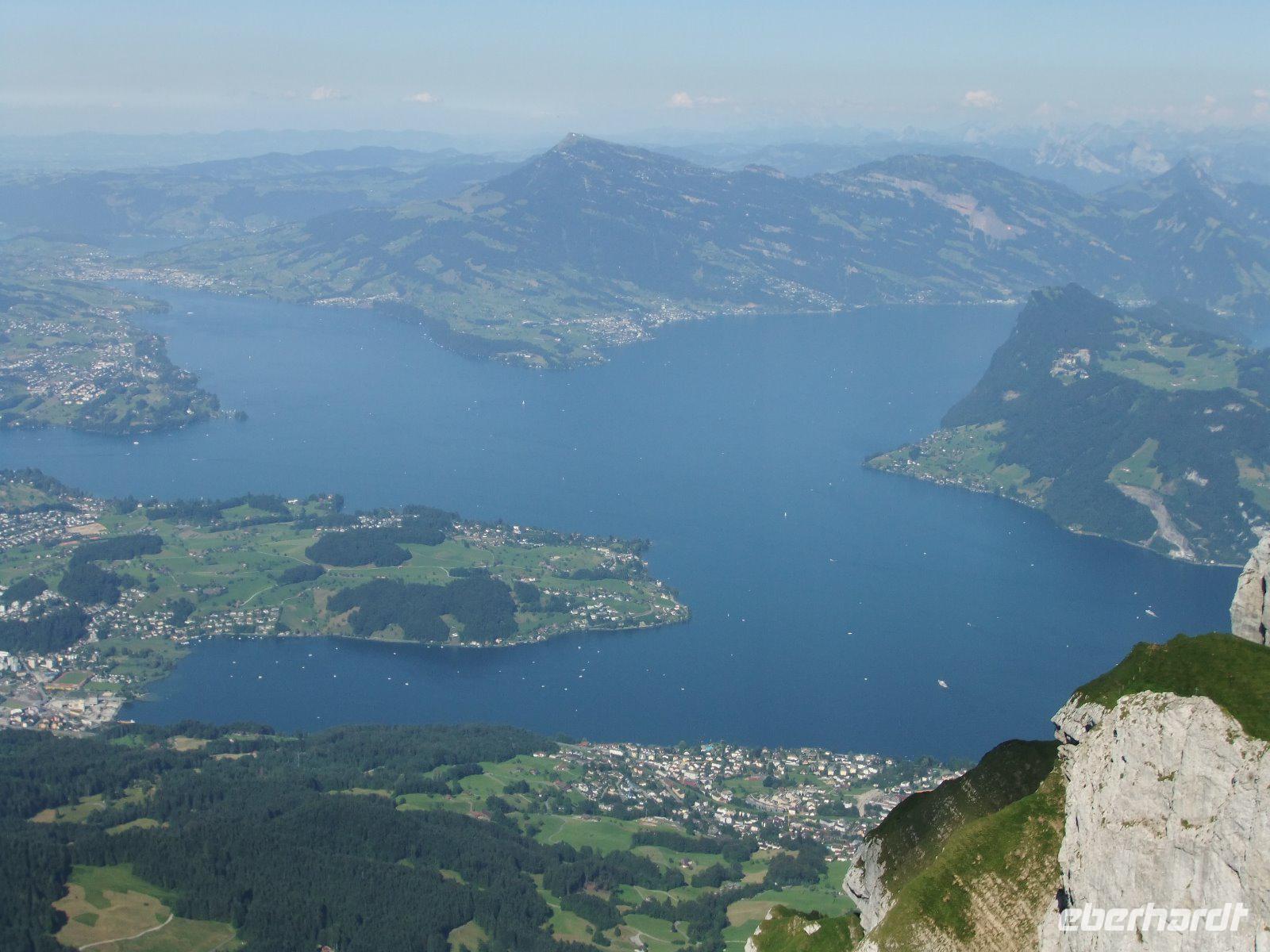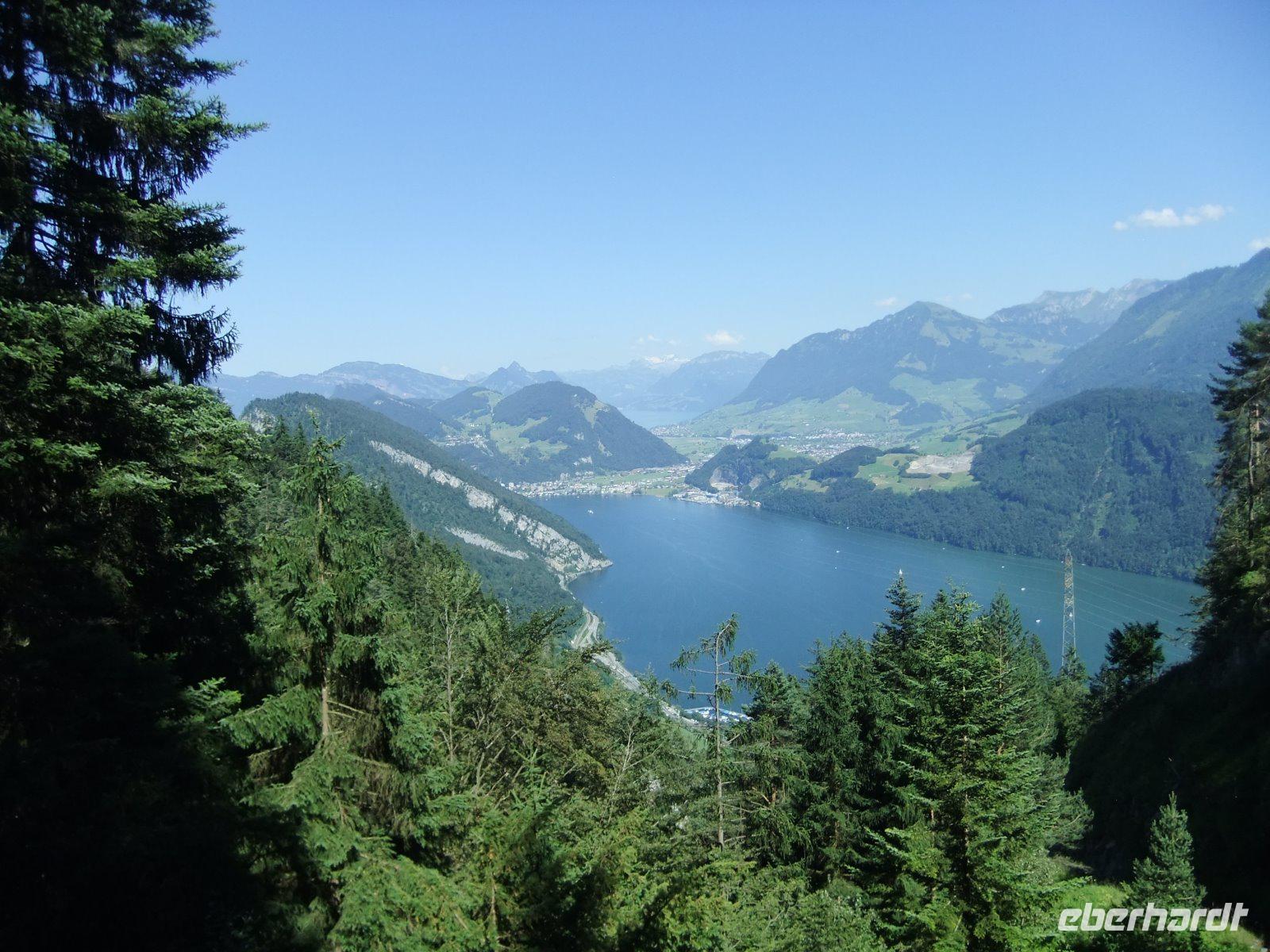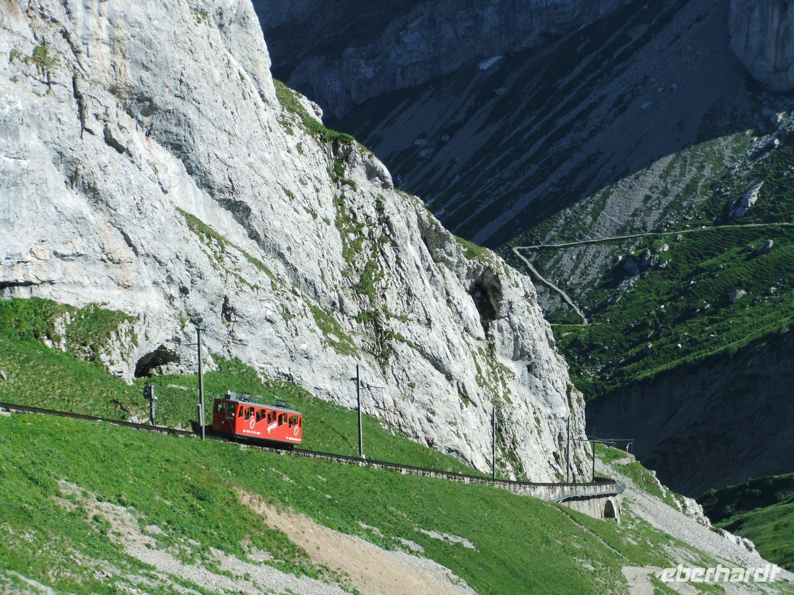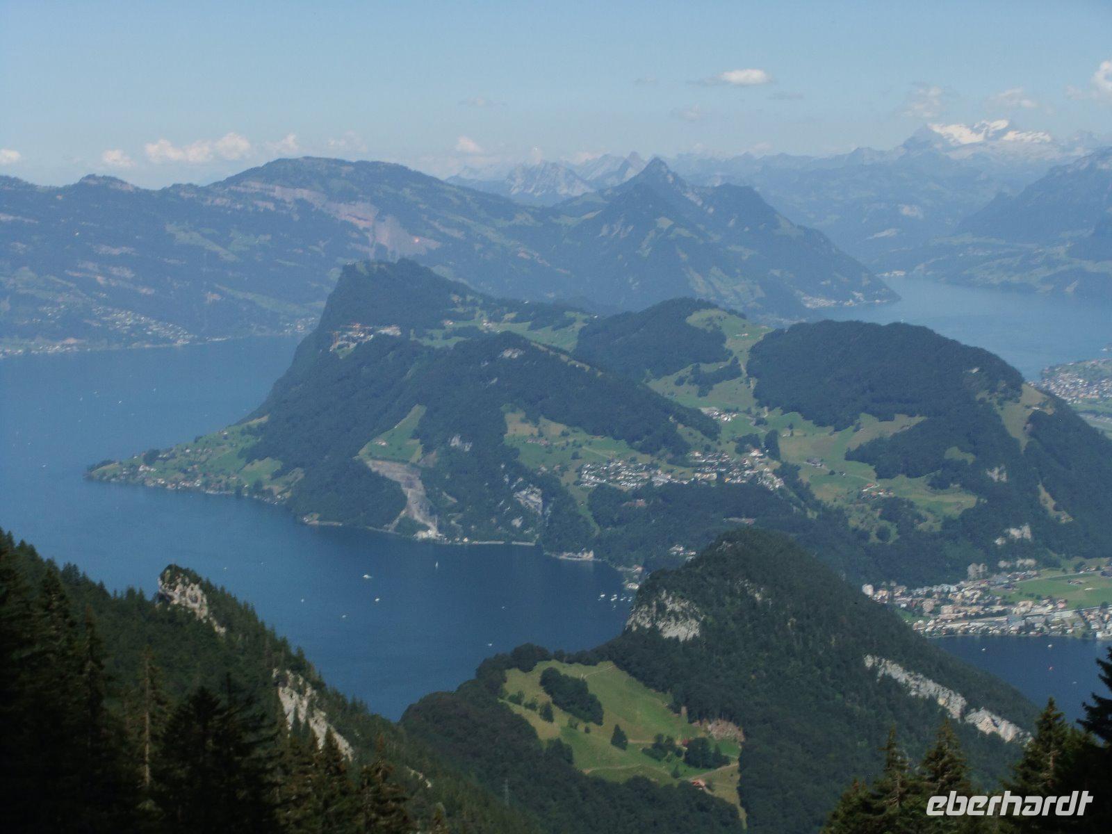 Nachmittags treffen wir uns alle wieder am Stadthaus-Quai, denn hier steht Mike mit dem Bus. Für uns geht es weiter zum Alpnacher See. Er ist Teil des Vierwaldstätter Sees und an seinem Ufer befindet sich Alpnachstad. Von hier fahren wir mit der steilsten Zahnradbahn der Welt hinauf auf den Pilatus. Die Strecke, die 1889 eröffnet wurde, ist 4618 m lang und hat eine maximale Steigung von 48 %. Allein diese Auffahrt ist ein Erlebnis. Immer wieder bieten sich schöne Blicke zurück auf den Vierwaldstätter See, in den sich der Bürgenstock wie ein Keil hineinschiebt. Eng schmiegt sich die Bahn an den Hang, teilweise geht es durch kleine Tunnel. Auf dem Gipfel befindet sich u.a. das Hotel Bellevue, in dem für uns Zimmer reserviert sind. Schnell haben wir eingecheckt und dann sind alle Gäste schon wieder draußen auf der Aussichtsterrasse. Die Sicht ist faszinierend. Zahlreiche Alpengipfel, darunter Titlis, Eiger, Mönch und Jungfrau, präsentieren sich uns ebenso wie mehrere Seen. Mit einem Glas Wein stoßen wir auf diesen schönen Aufenthalt inmitten der Schweizer Bergwelt an. Dann gehen wir zum Abendessen in das historische Berghotel Kulm. Im Salon „Queen Victoria" beginnt mit einem Melonendrink ein sehr schmackhaftes Menü. Anschließend erkunden einige Gäste noch den Drachenweg oder beobachten die Steinböcke und Gämsen, die sich nahe heran trauen. Dann aber besteigen viele noch den Esel. Von diesem Aussichtsgipfel aus können wir einen traumhaften Sonnenuntergang erleben. Später leuchten tief unter uns die Lichter von Luzern. Ein wunderschöner Tag endet für uns in 2070 M Höhe.